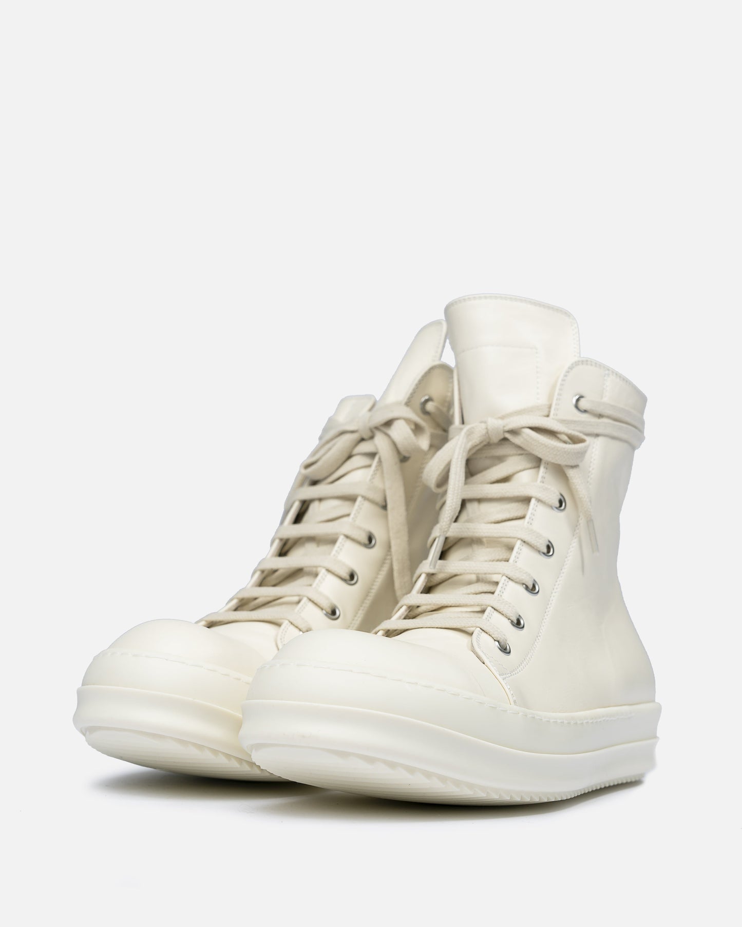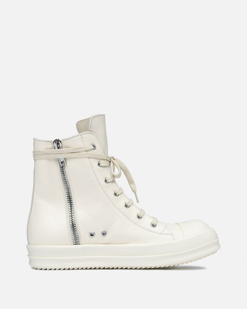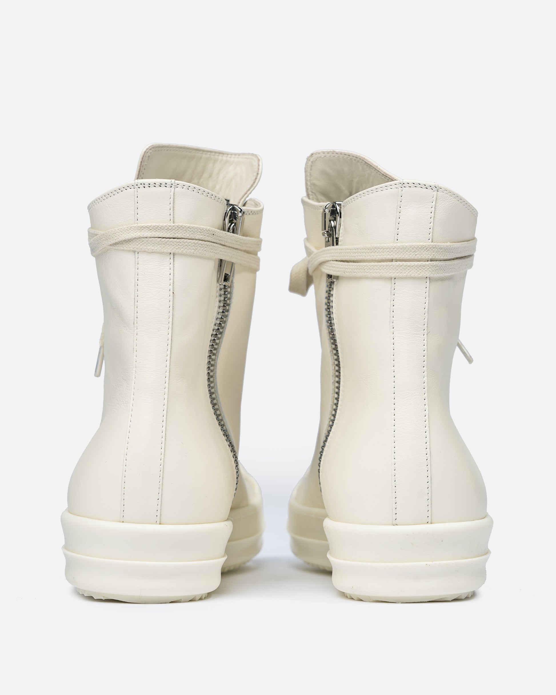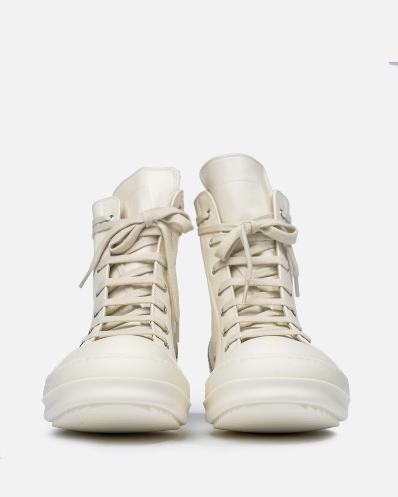 FW21 Gethsemane ankle-high leather sneakers in milk. Round leather cap toe in off-white. Lace-up closure in off-white. Zip closure and eyelets at inner side. Treaded rubber sole in off-white.