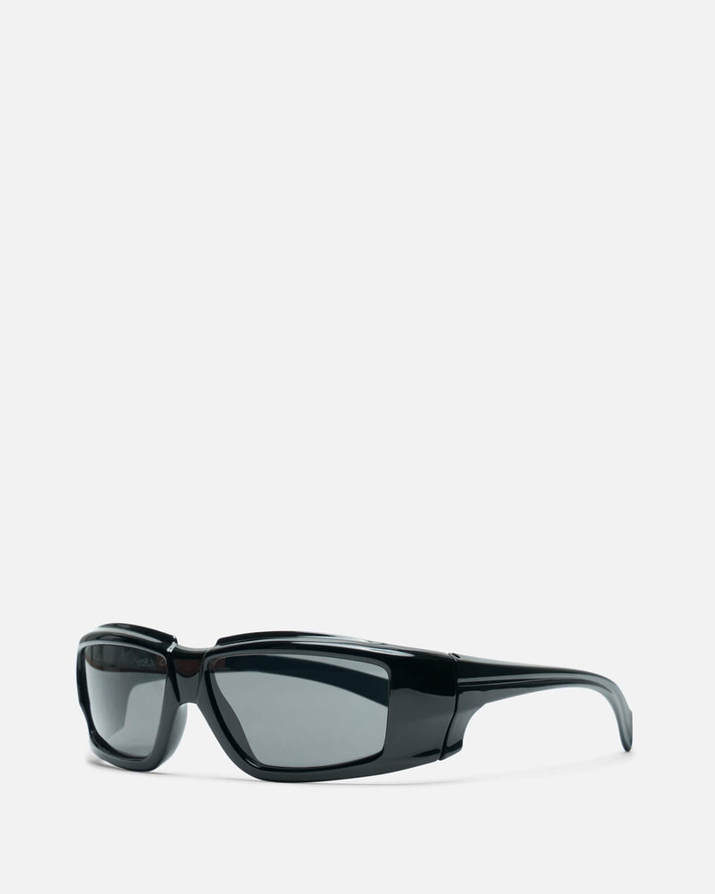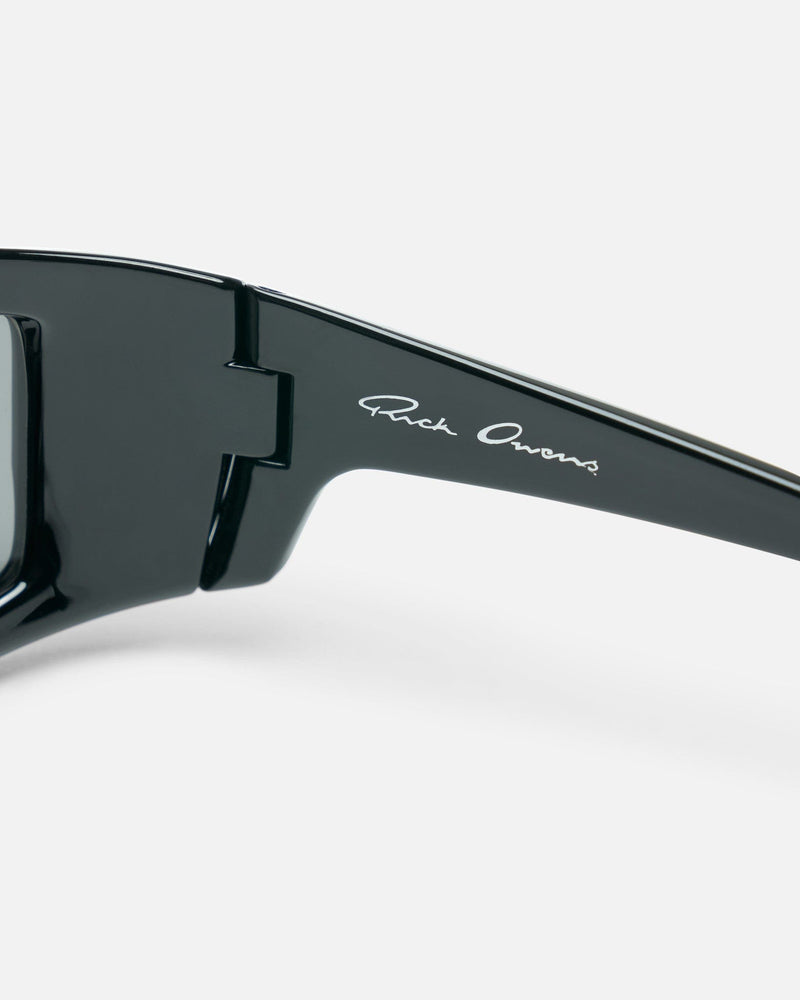 Rick Owens Rick Sunglasses in Black/Black. These sunglasses feature a double injection nylon frame with memory flex and logo branding at the interior frame.