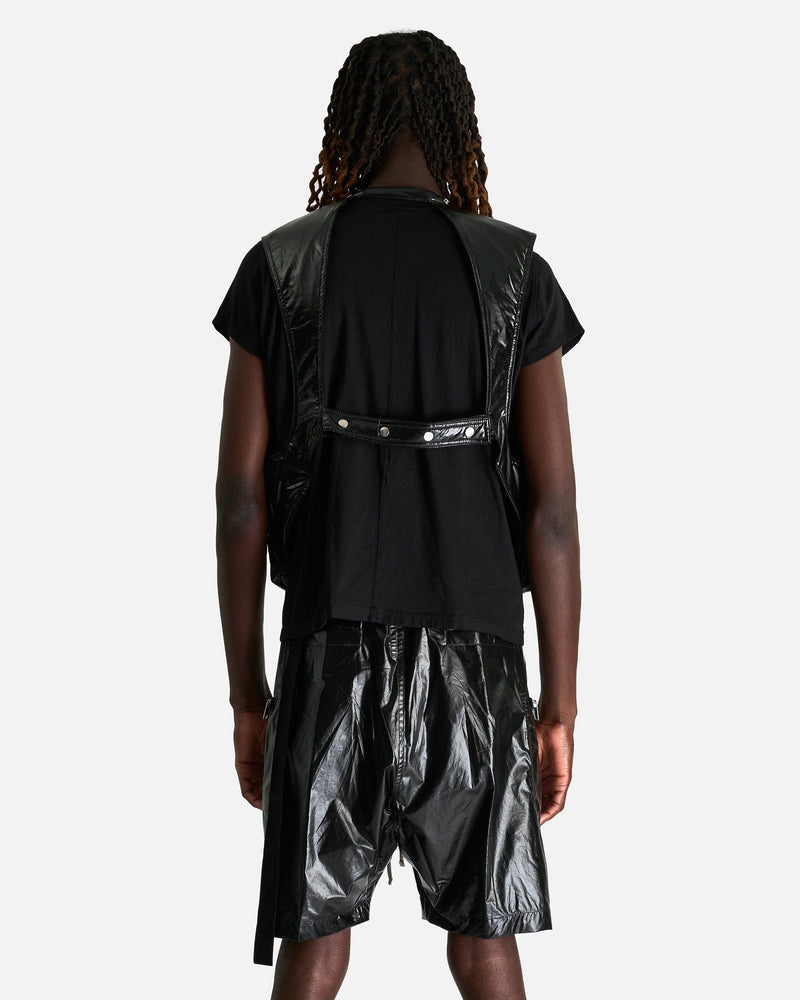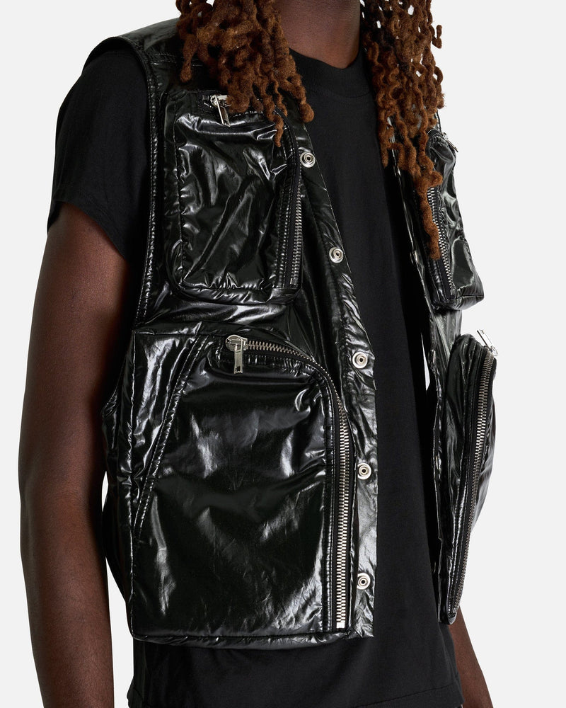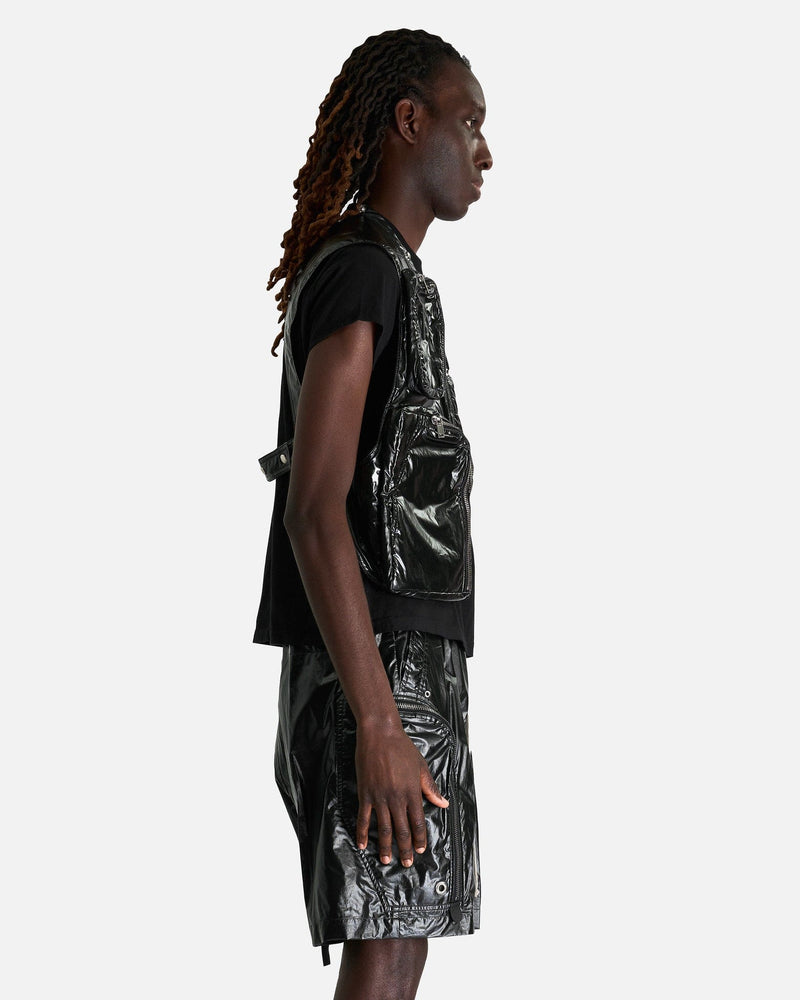 Rick Owens Cargo Vest in Black. This vest is constructed with a semi-shiny coated cotton and features a snap button closure, four rounded bauhaus pockets with zip closures and an open back with a center snap belt.