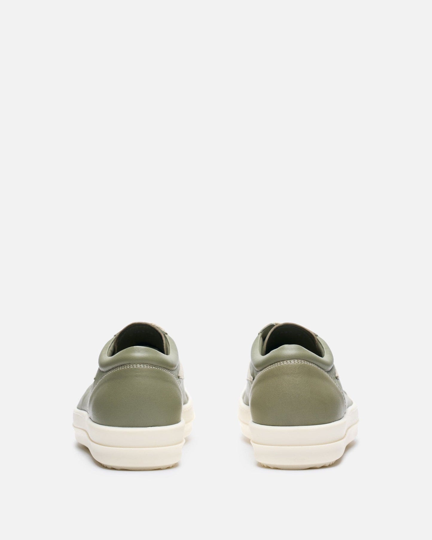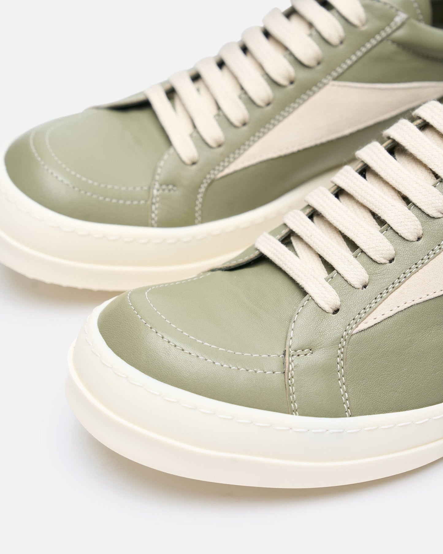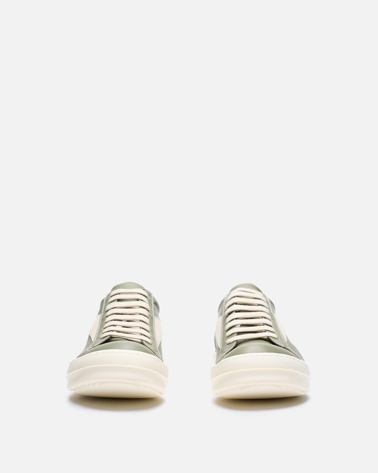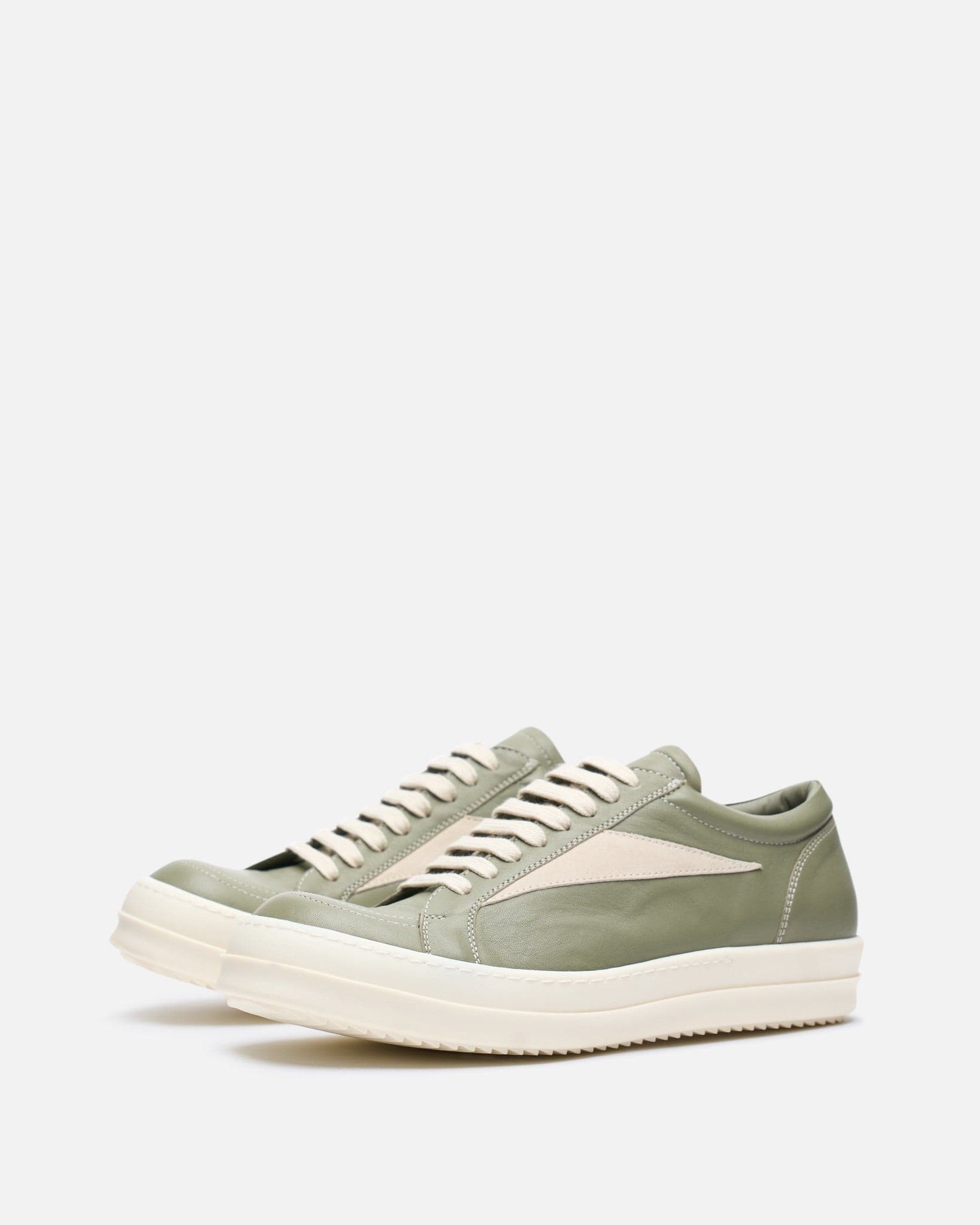 Rick Owens Vintage Sneakers in Celadon/Milk. These shoes are constructed from cow leather and feature a lace-up closure, suede appliqué on either side and shark toothed bumper soles.