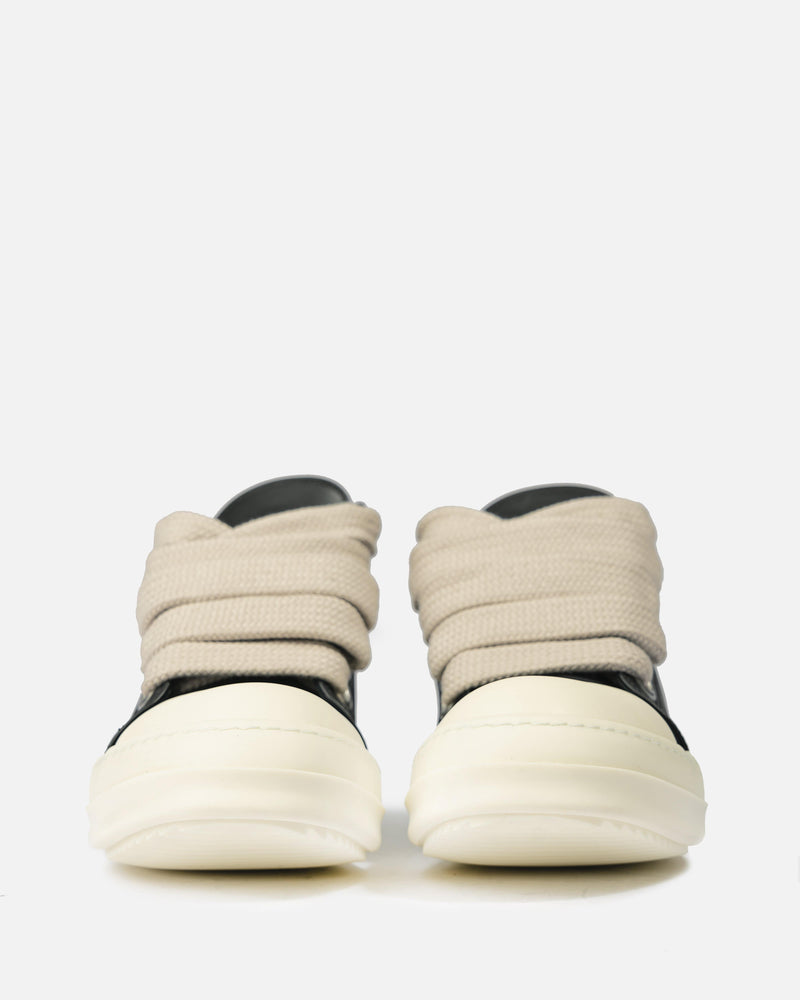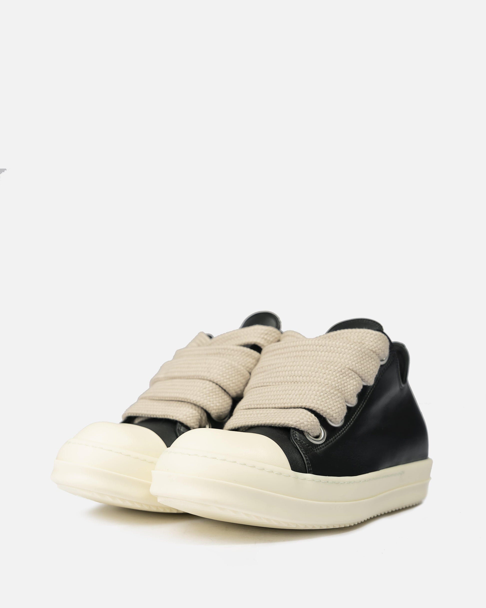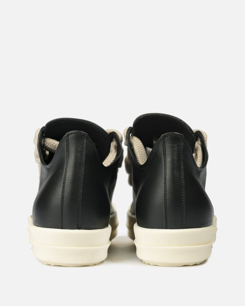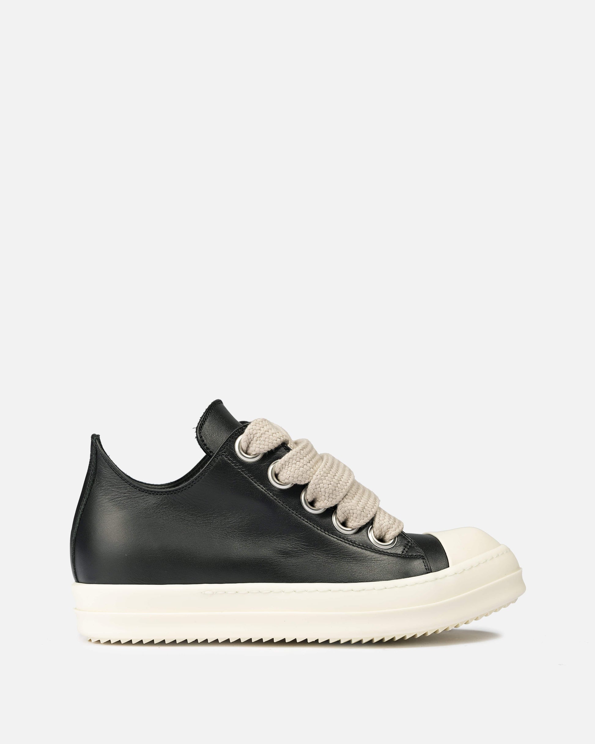 Rick Owens’ SS22 Fogachine full grain leather calfskin sneakers in black. Featuring the signature rounded leather cap toe in off-white and wide laces in natural, this sneaker has a treaded rubber sole.