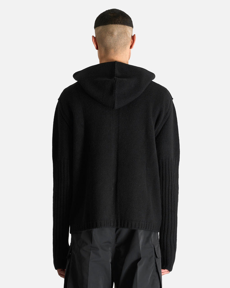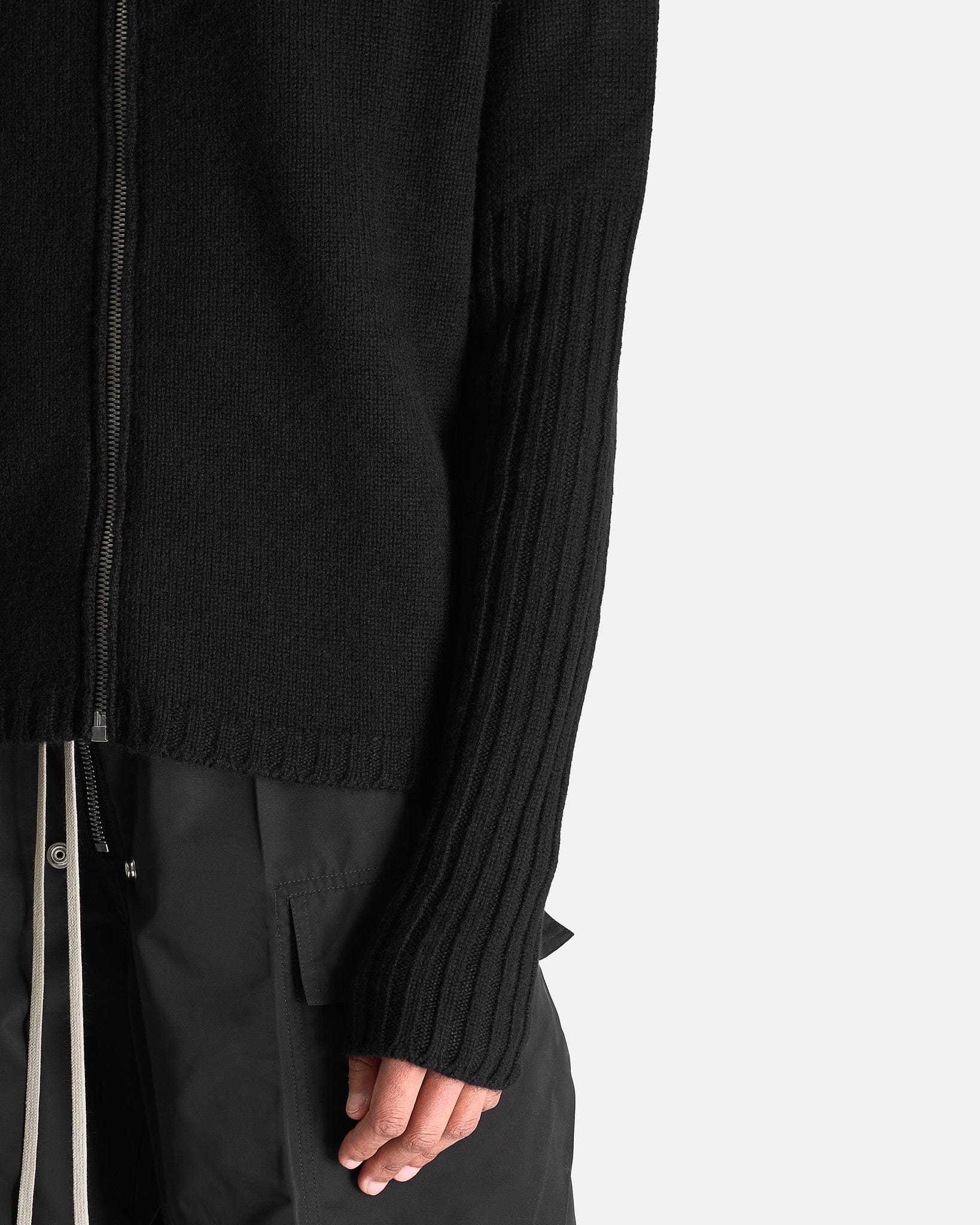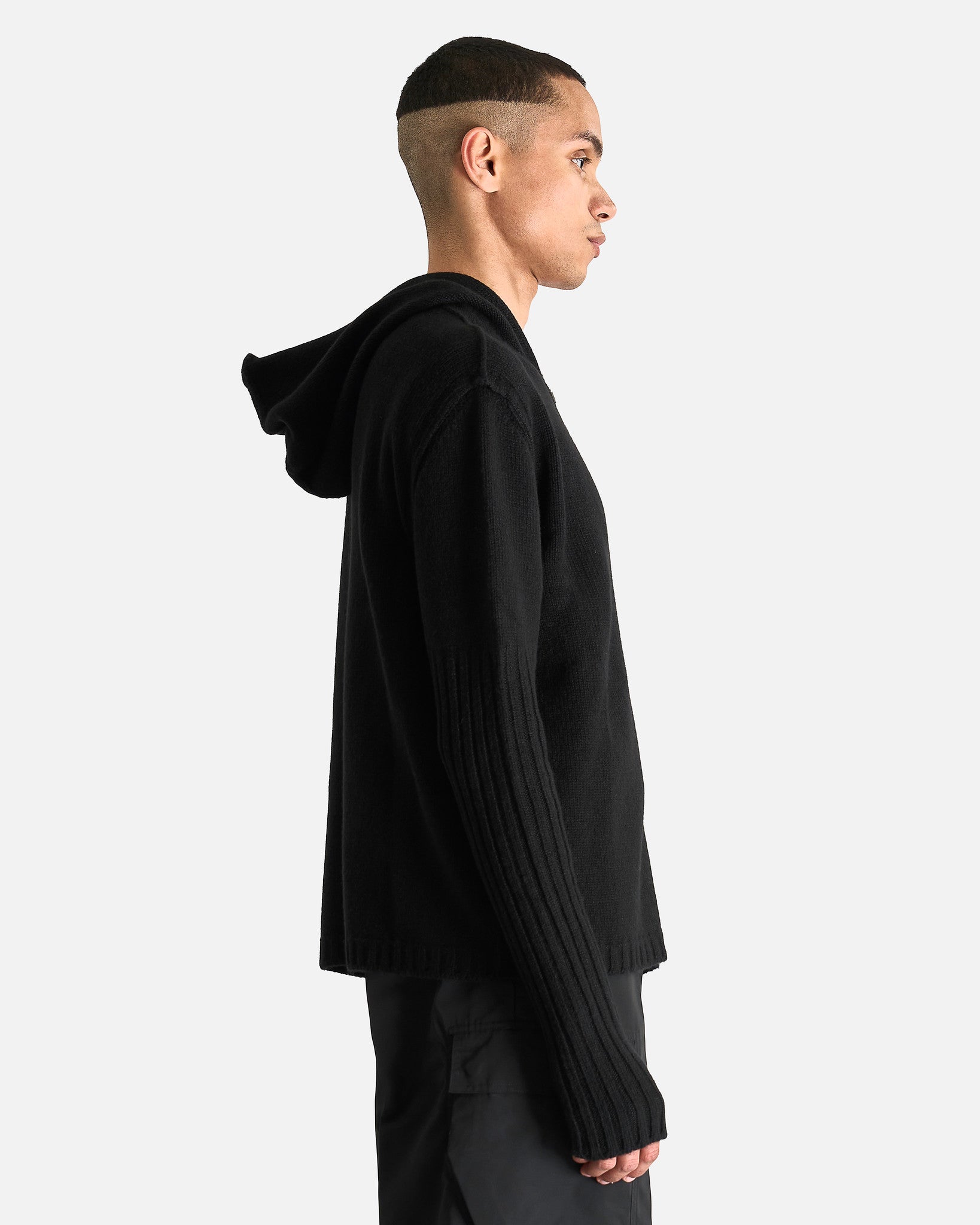Rick Owens Zip Hoodie in Black. This hoodie is crafted from cashmere and features a hood, front zip closure and ribbed trim details.