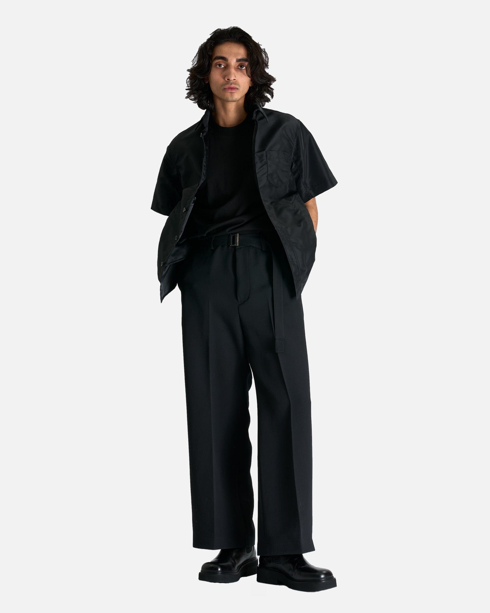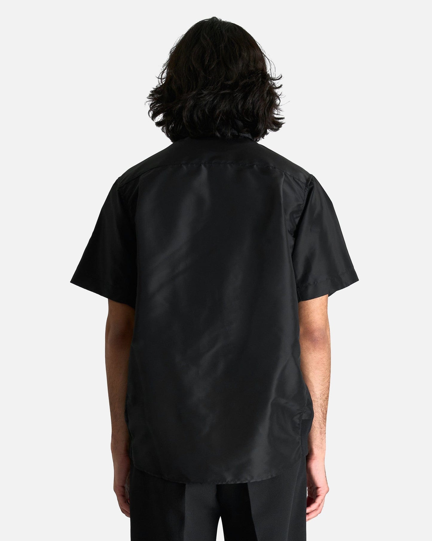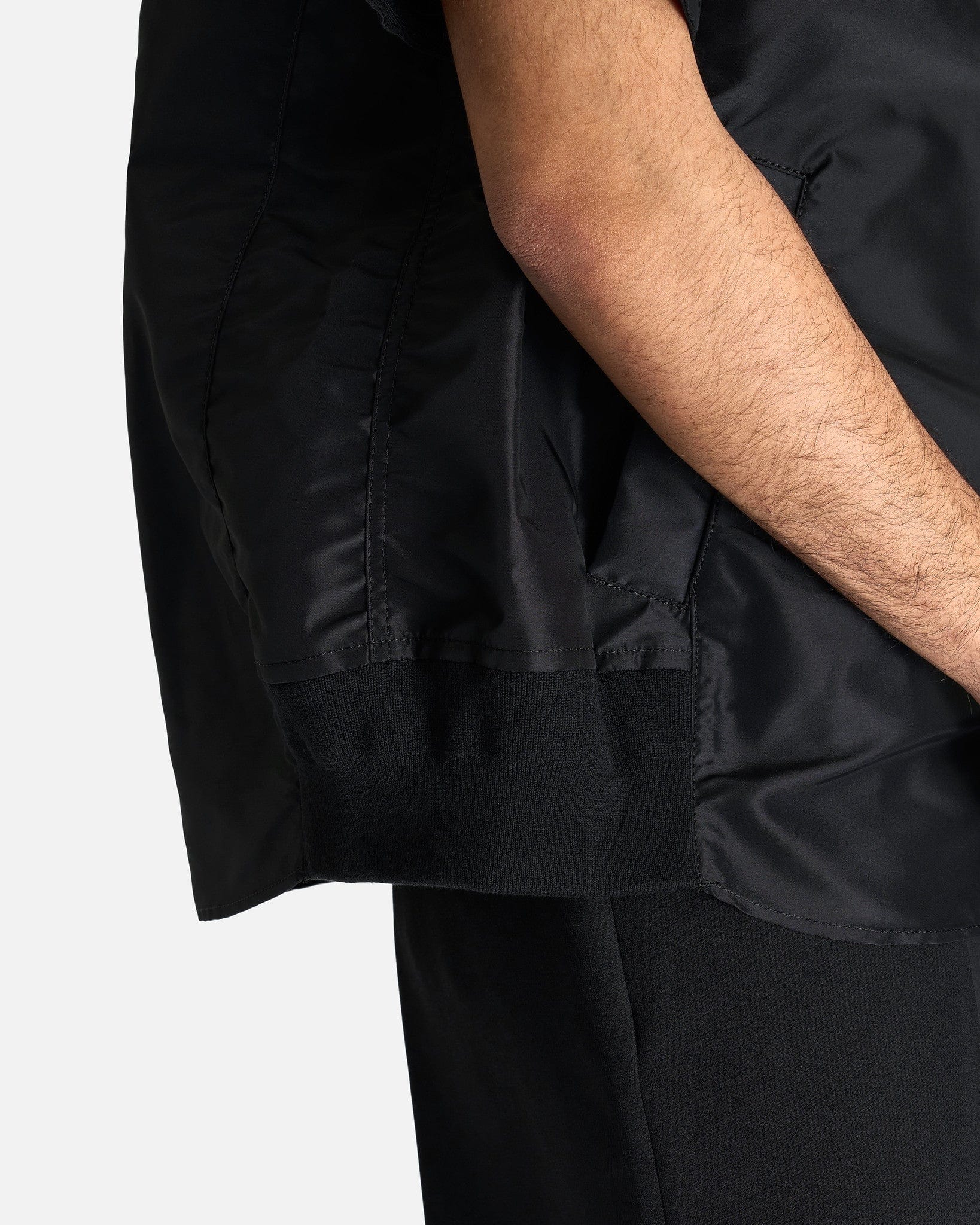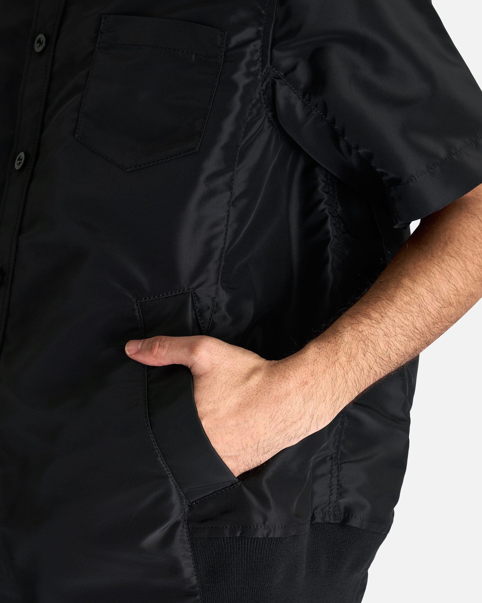 Sacai Nylon Twill Shirt in Black. This padded top features a spread collar, front button closure, patch pocket on the chest, rib knit paneling on the side hems and pleating on the back yoke.