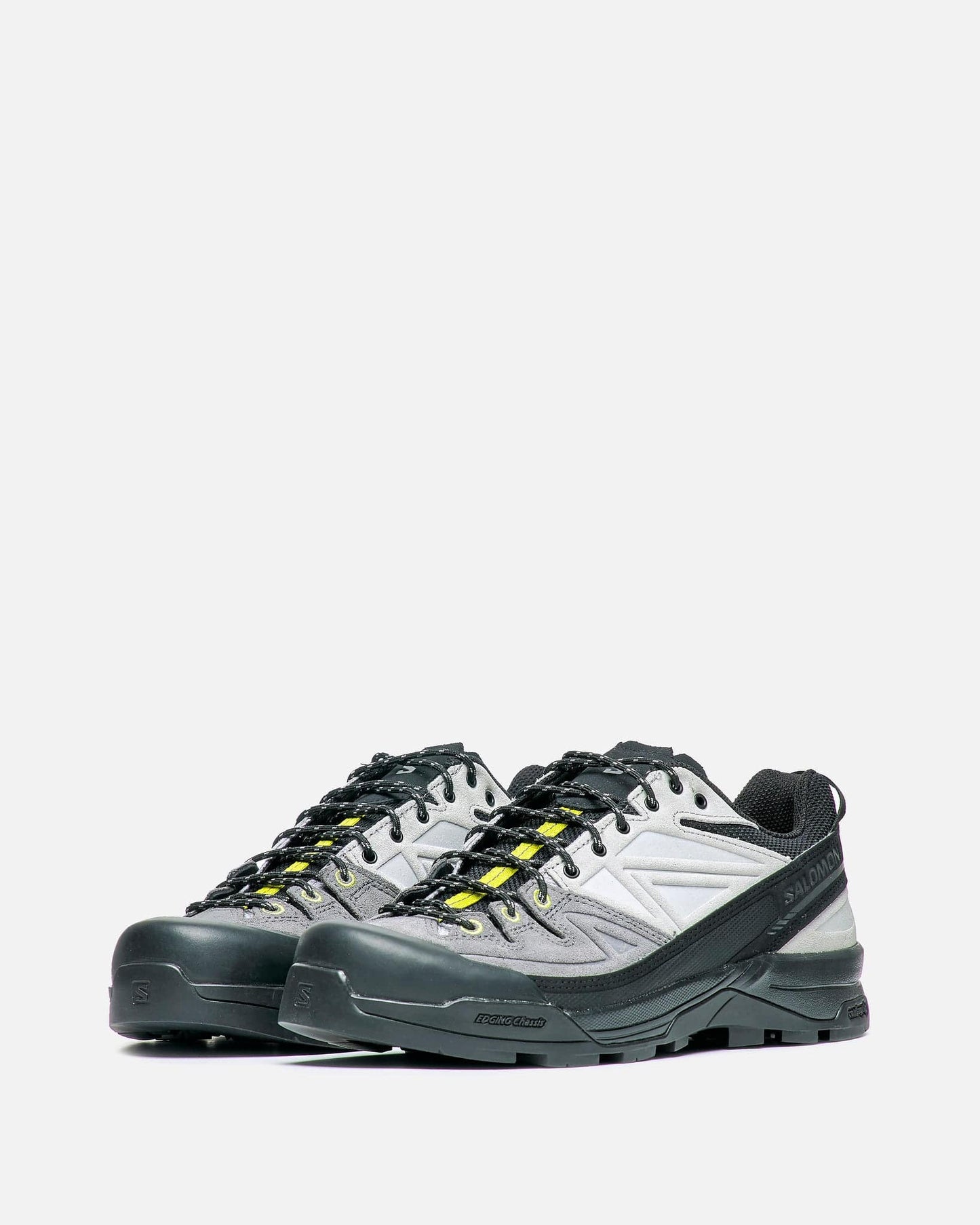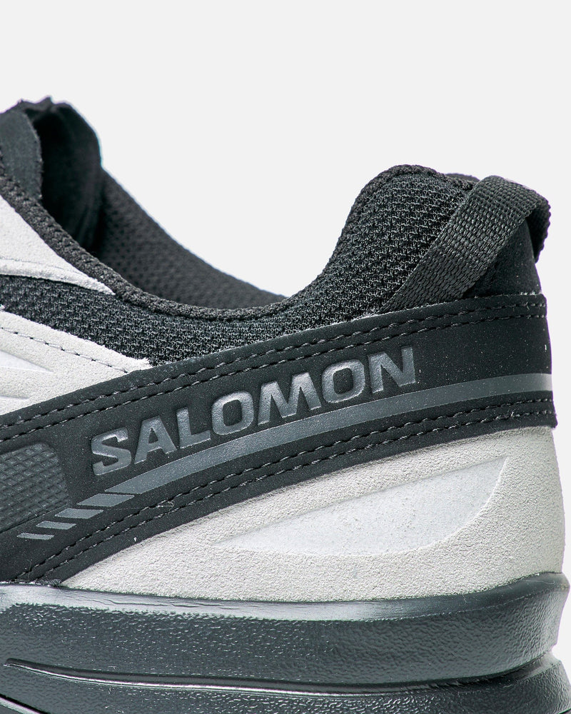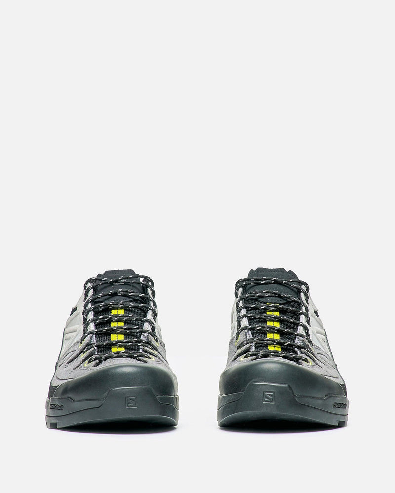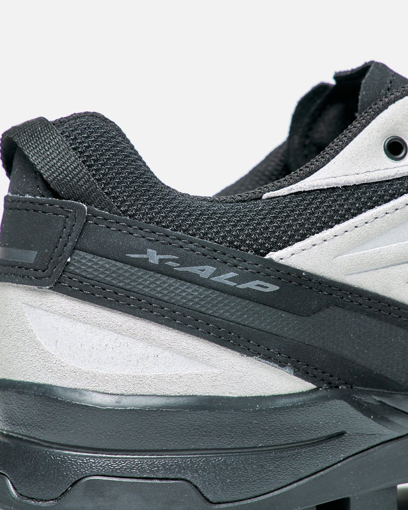 Salomon X-ALP Low LTR in Black/Castle Rock. These shoes feature a suede and canvas upper, rubberized toe box, a stitched lateral power band, 3D Edging Chassis™ for lateral stability and a treaded sole.