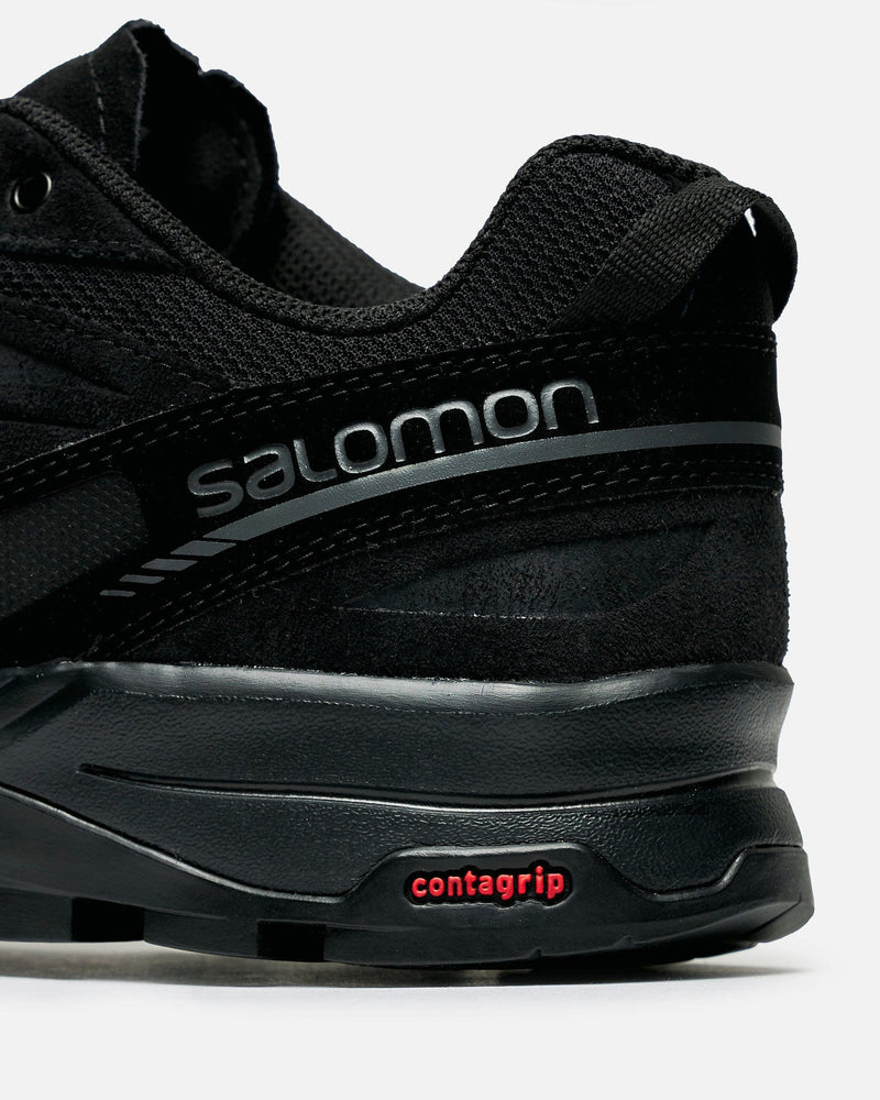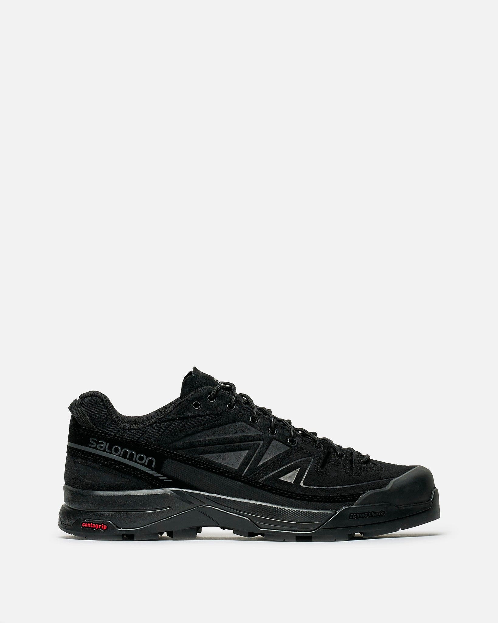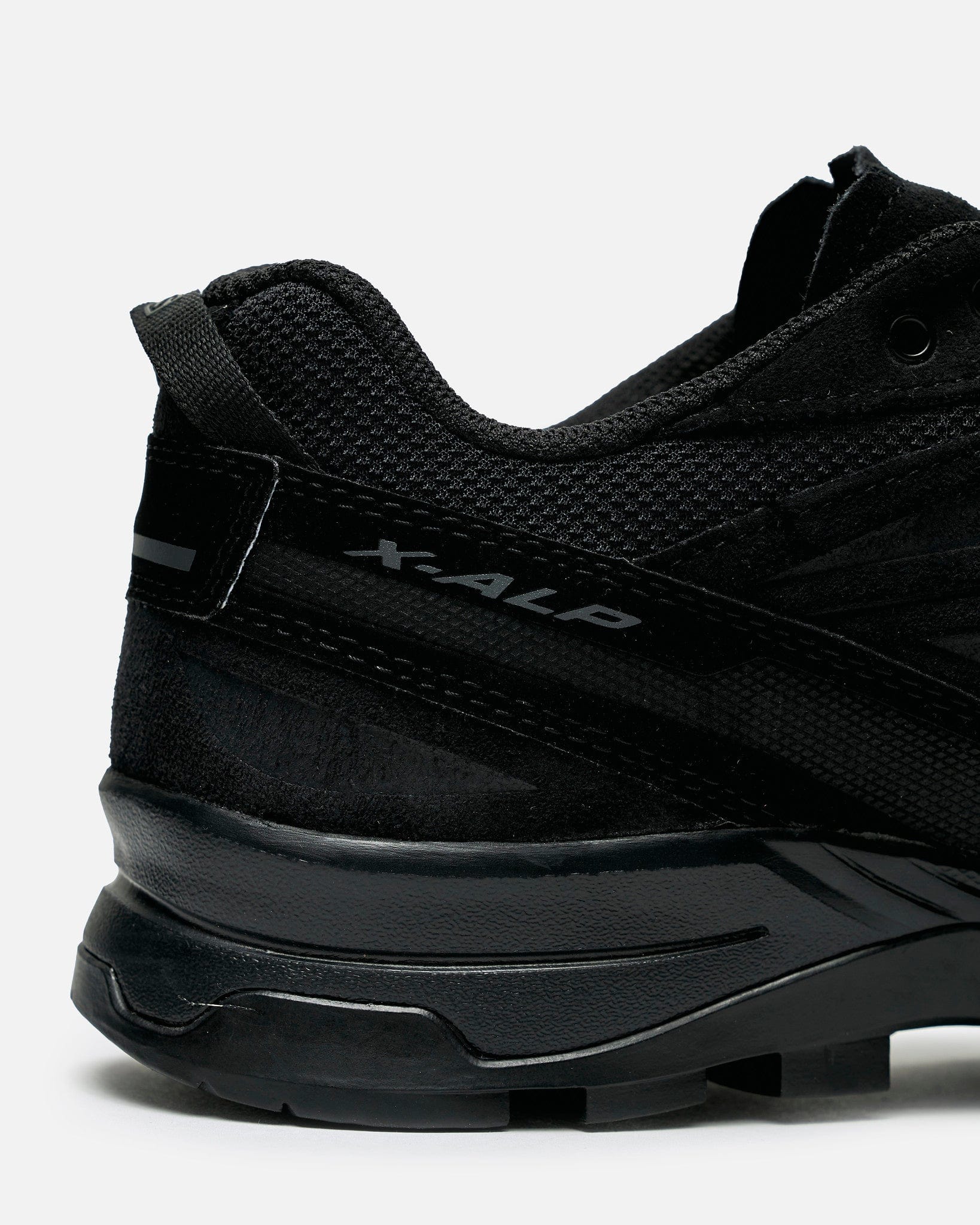 Salomon X-ALP LTR in Black/Asphalt. These shoes feature a suede and canvas upper, rubberized toe box, a stitched lateral power band, 3D Edging Chassis™ for lateral stability and a treaded sole.