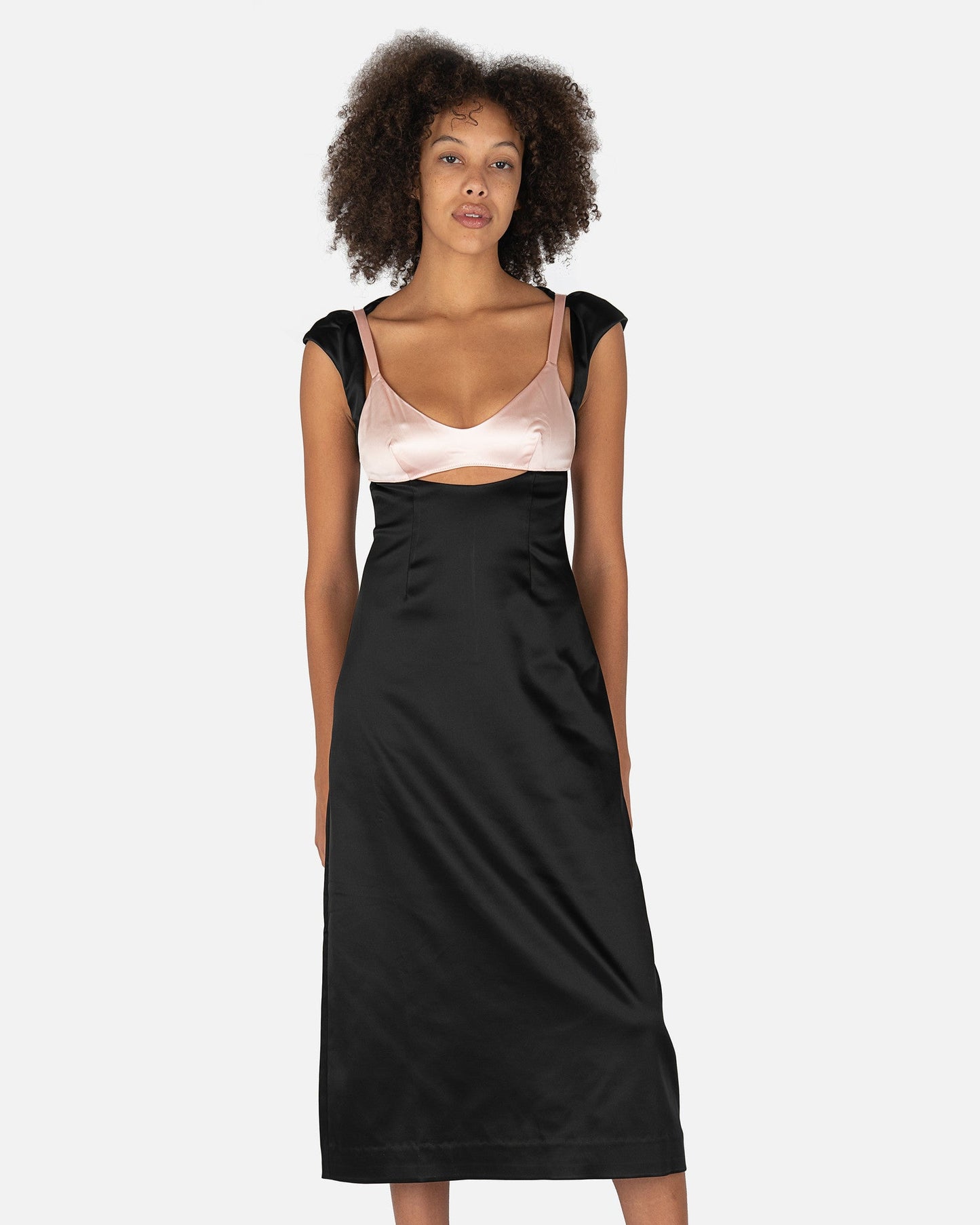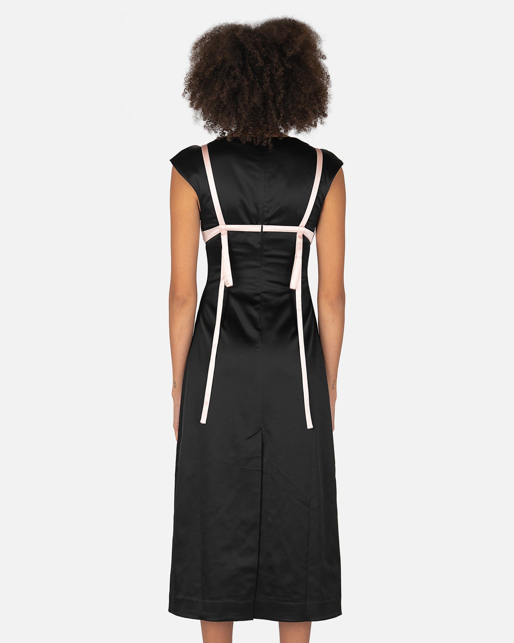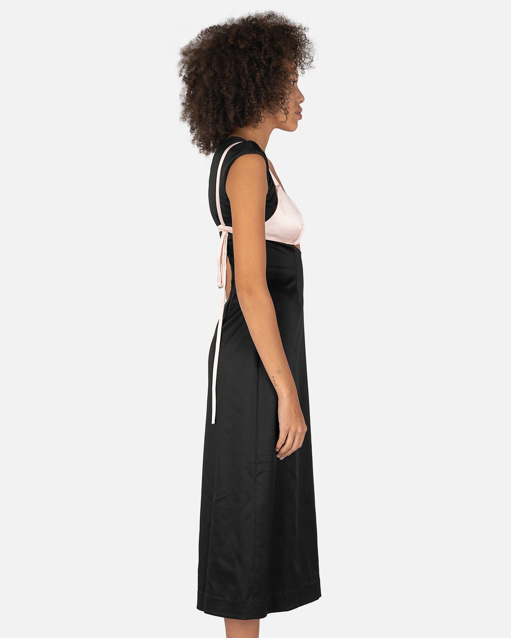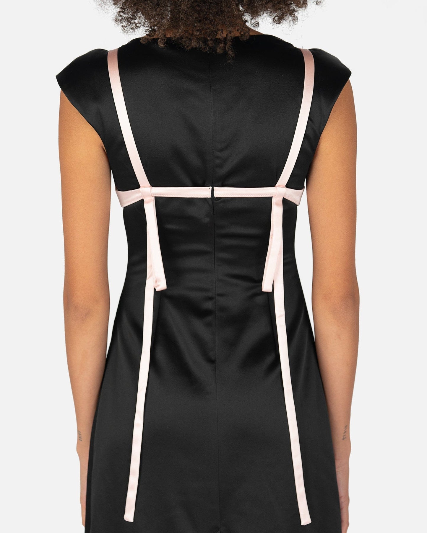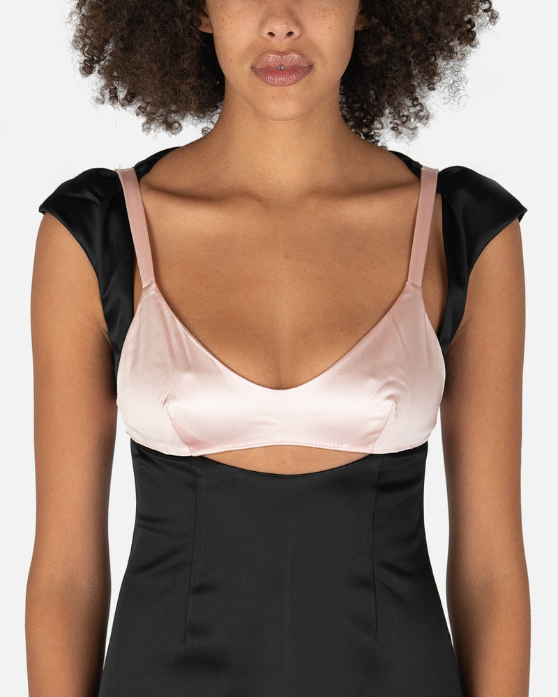 Sandy Liang women's satin dress in black and light pink. This dress features a scoop neckline with a satin pink bralette, cut-out details, and hanging bows on the back. There is a center back concealed zipper closure.