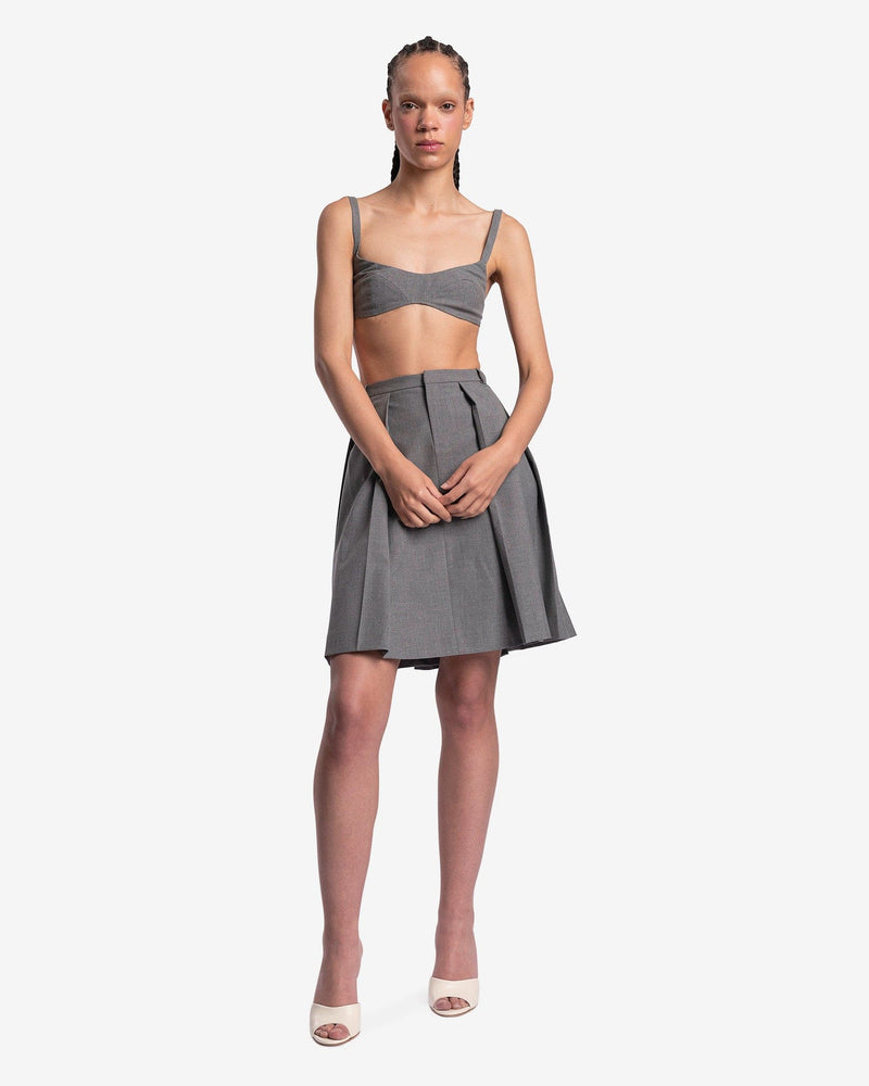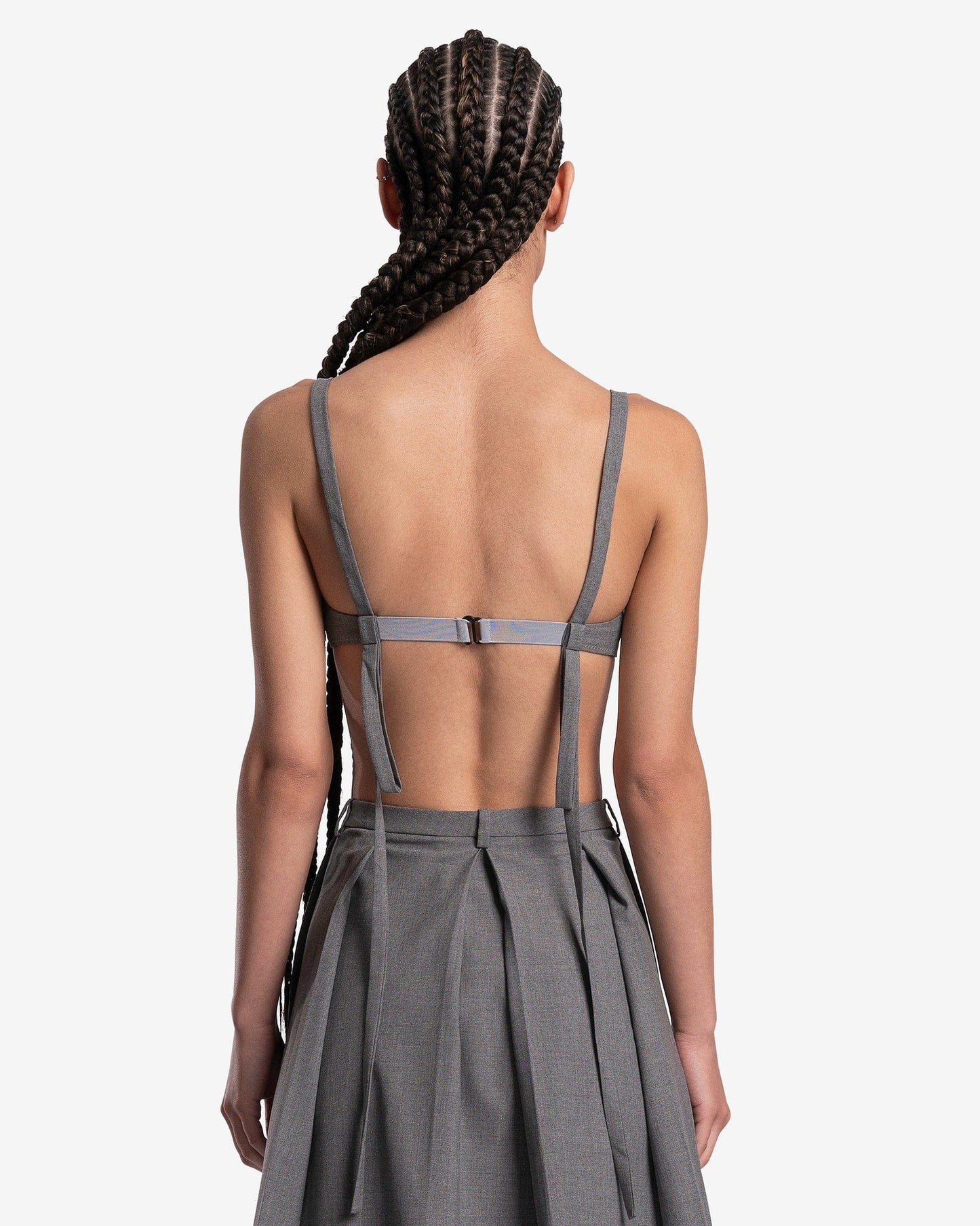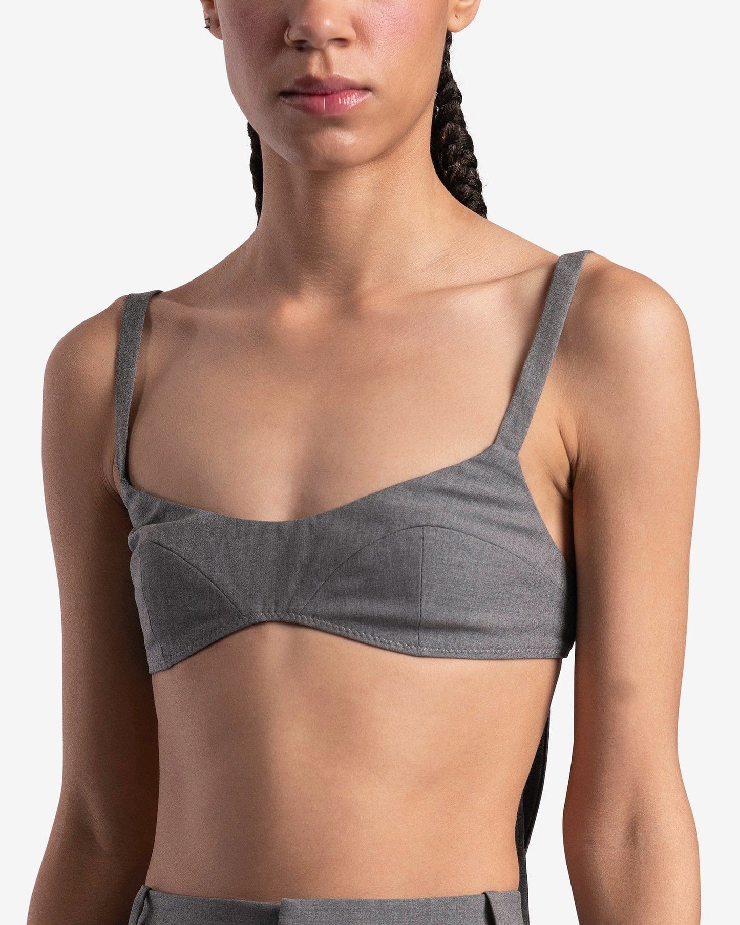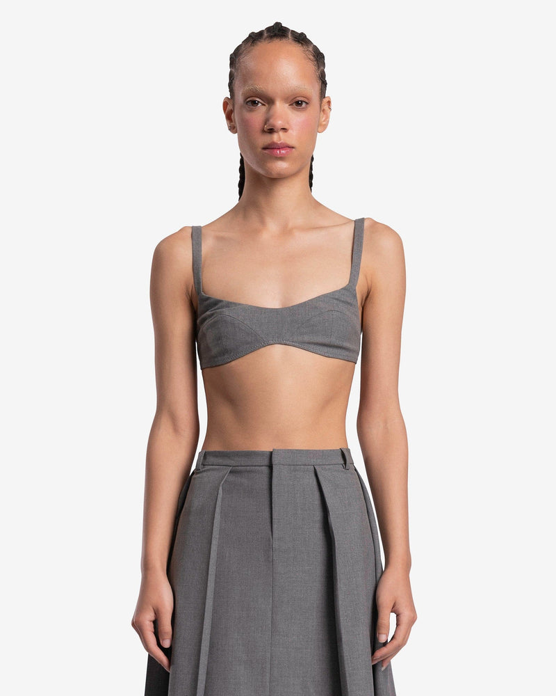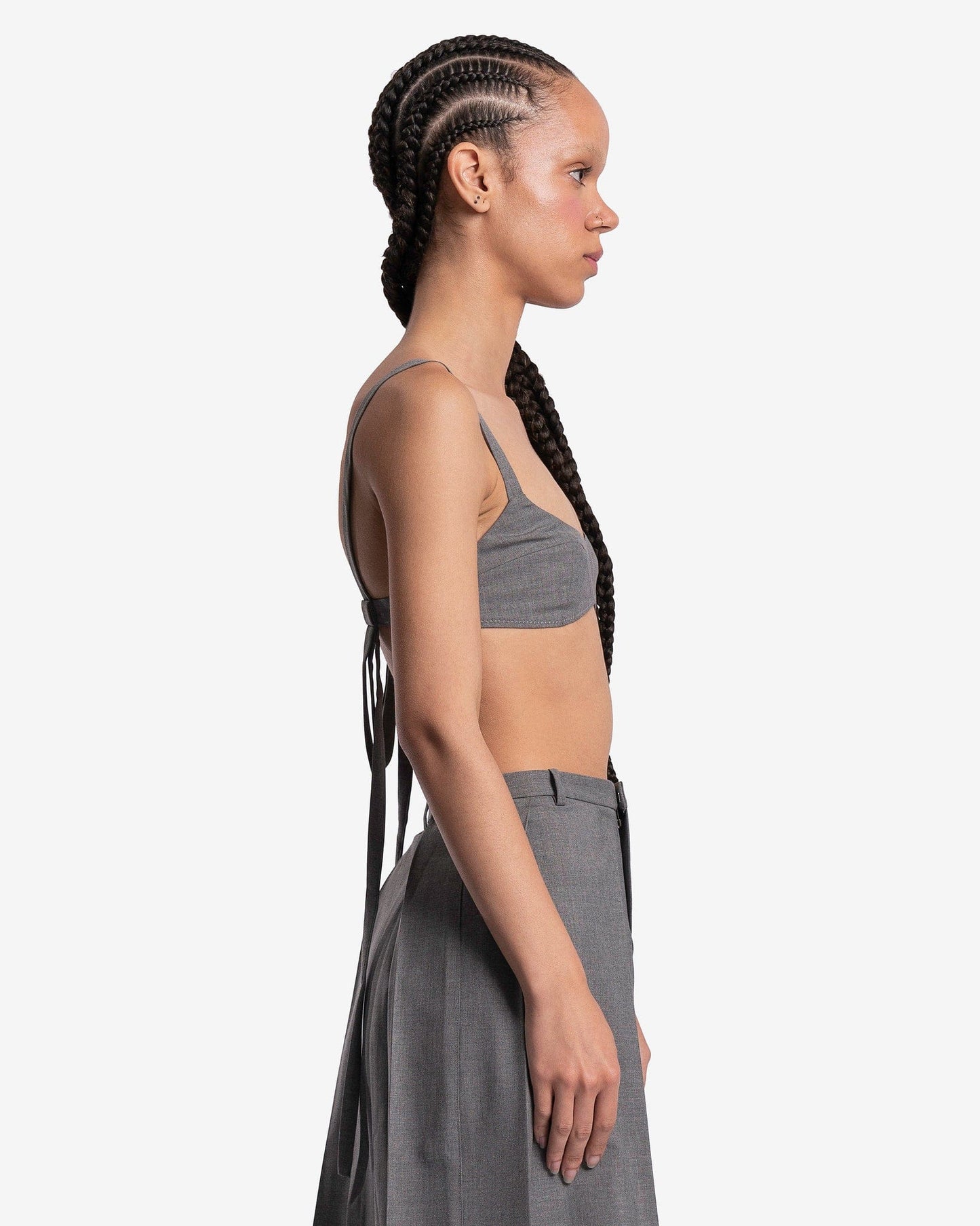 Sandy Liang bra top in grey melange tailoring fabric with darted construction and elongated bows at back.