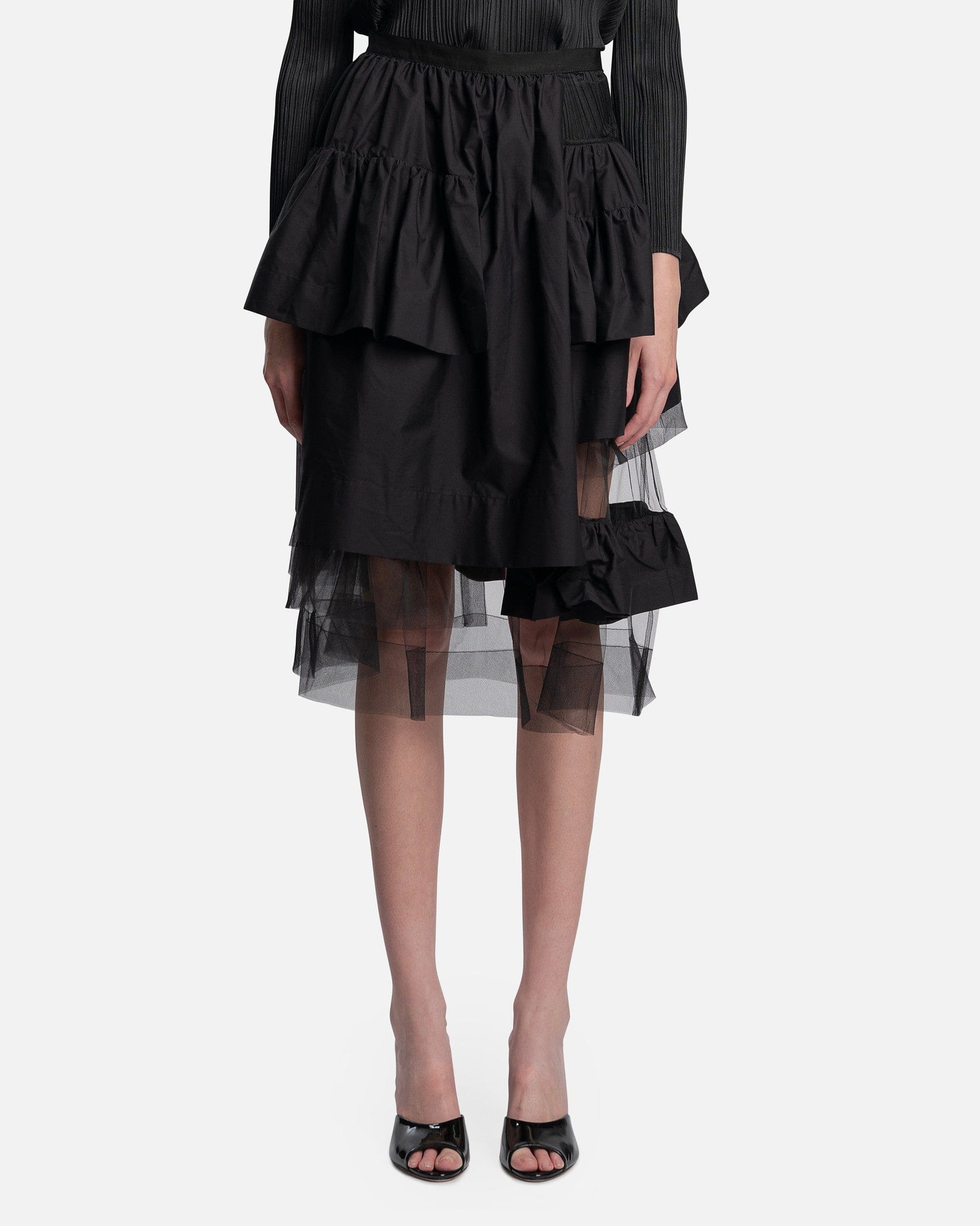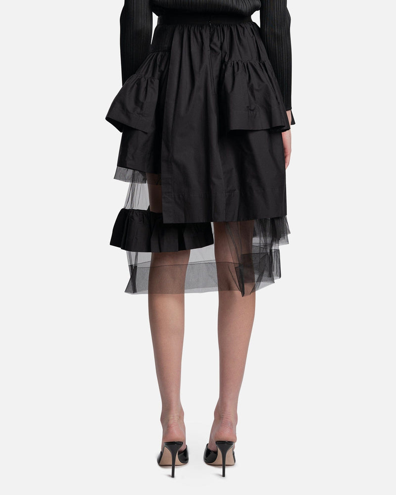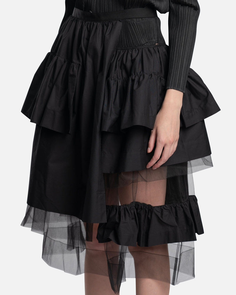 Sandy Liang women's full skirt in black. This skirt has a an asymmetrical, paneled construction with tiered ruffles and tulle details. Features a grosgrain waistband and a back zipper closure.