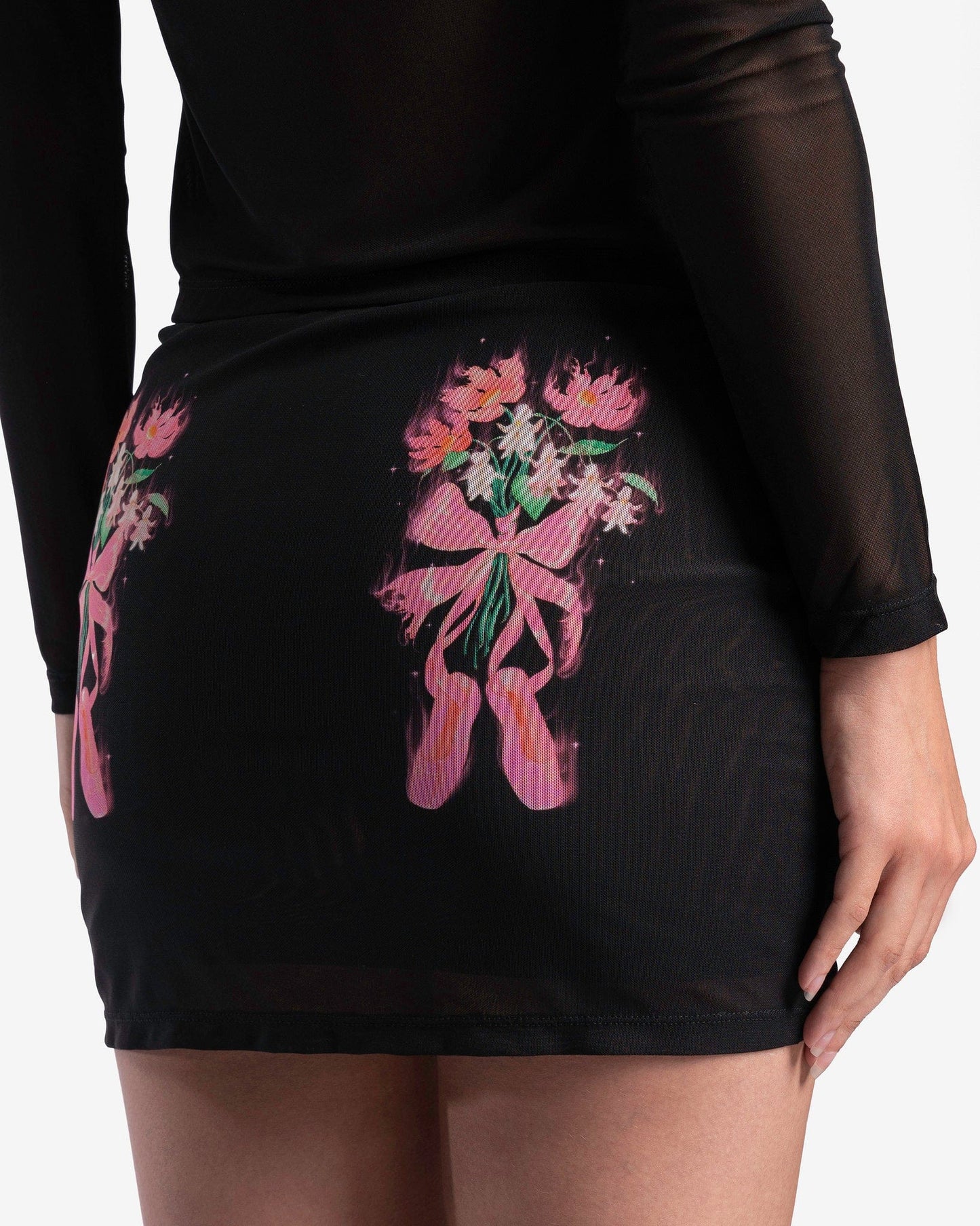 Sandy Liang semi-sheer stretch nylon mini skirt in black with ballet inspired graphics by Ram Han at front and back.