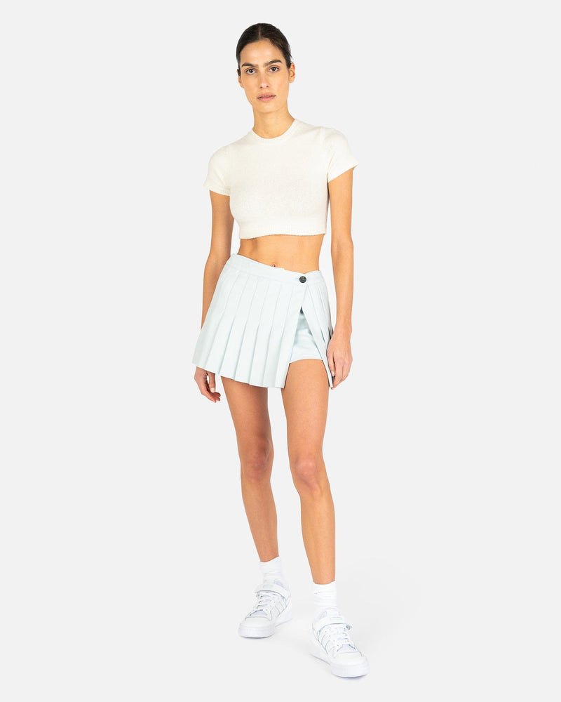 Sandy Liang women's mini skort in light blue. This skort is high waisted and fully pleated, using a wrap around style and button closure at the front. There is a hidden zip and hook closure as well for security.