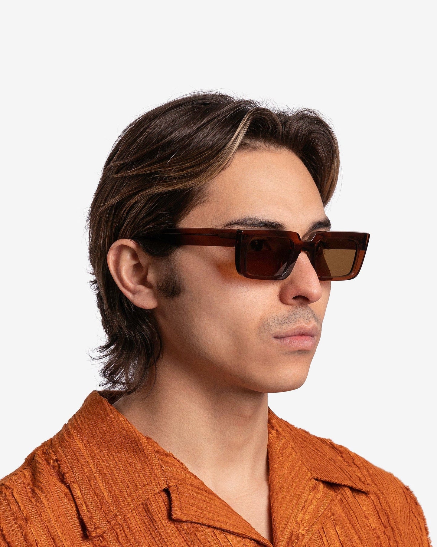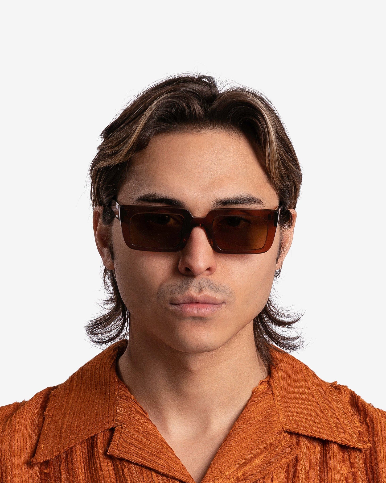 Séfr men's sunglasses in cognac. These sunglasses feature a rectangular shape with a semi thick, acetate frame.