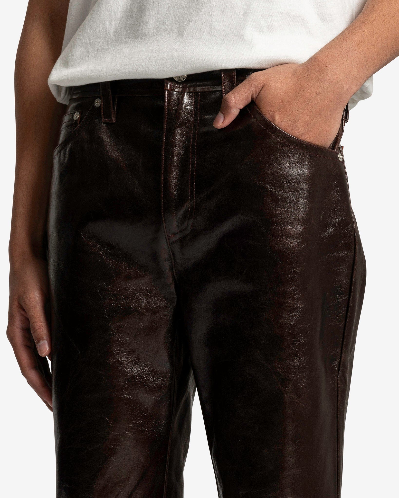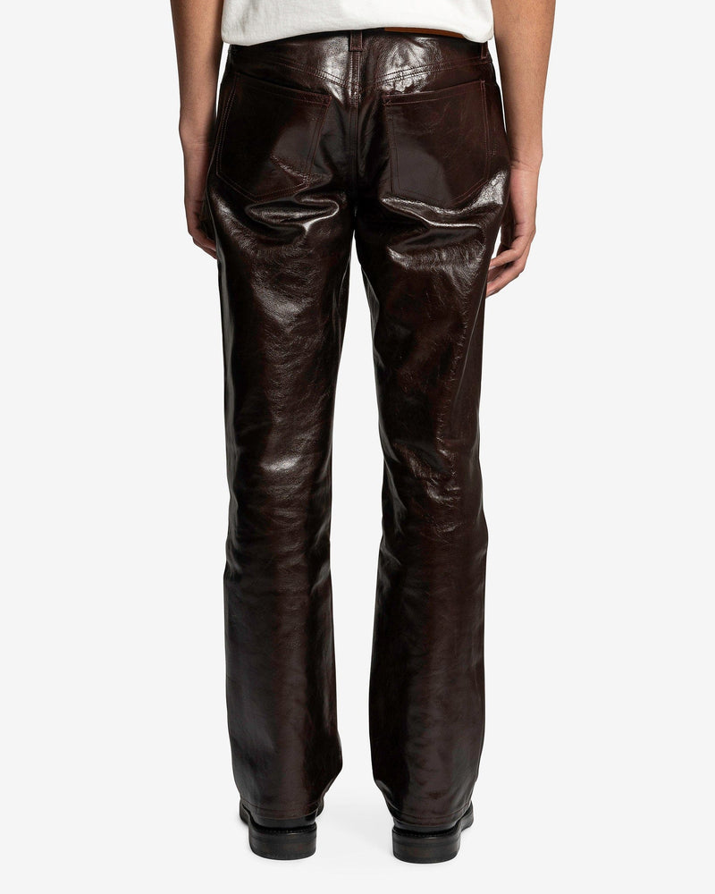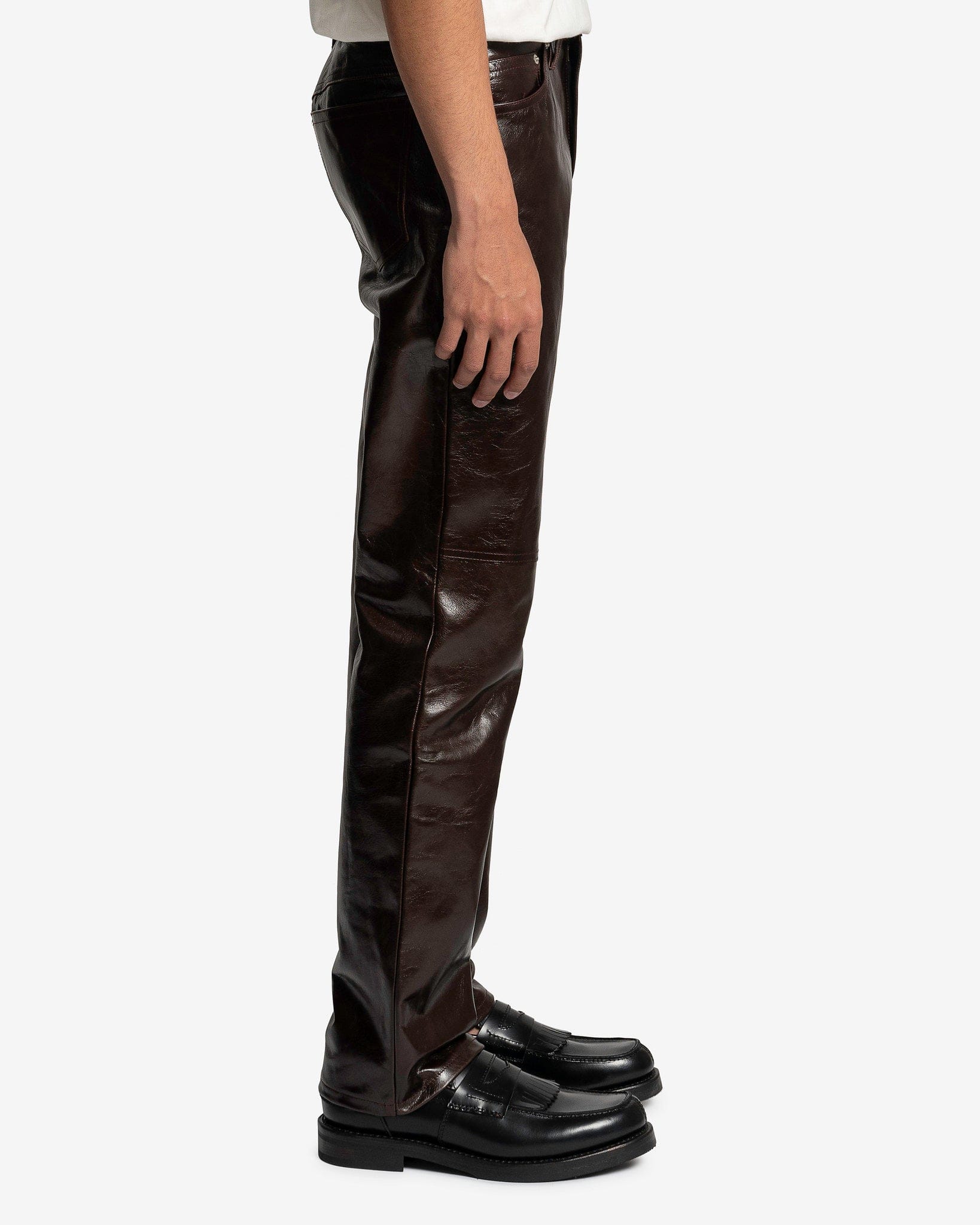 Séfr men's faux leather pants in reddish brown. These pants feature a five pocket composition, straight leg fit and a shiny finishing.