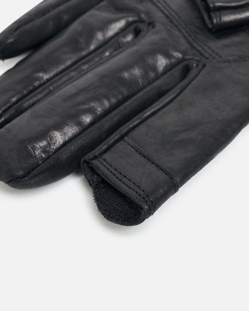 Rick Owens men's calf leather gloves in black. These gloves have a glossy finish with graphic seam lines, topstitching details and ribbed cuffs.