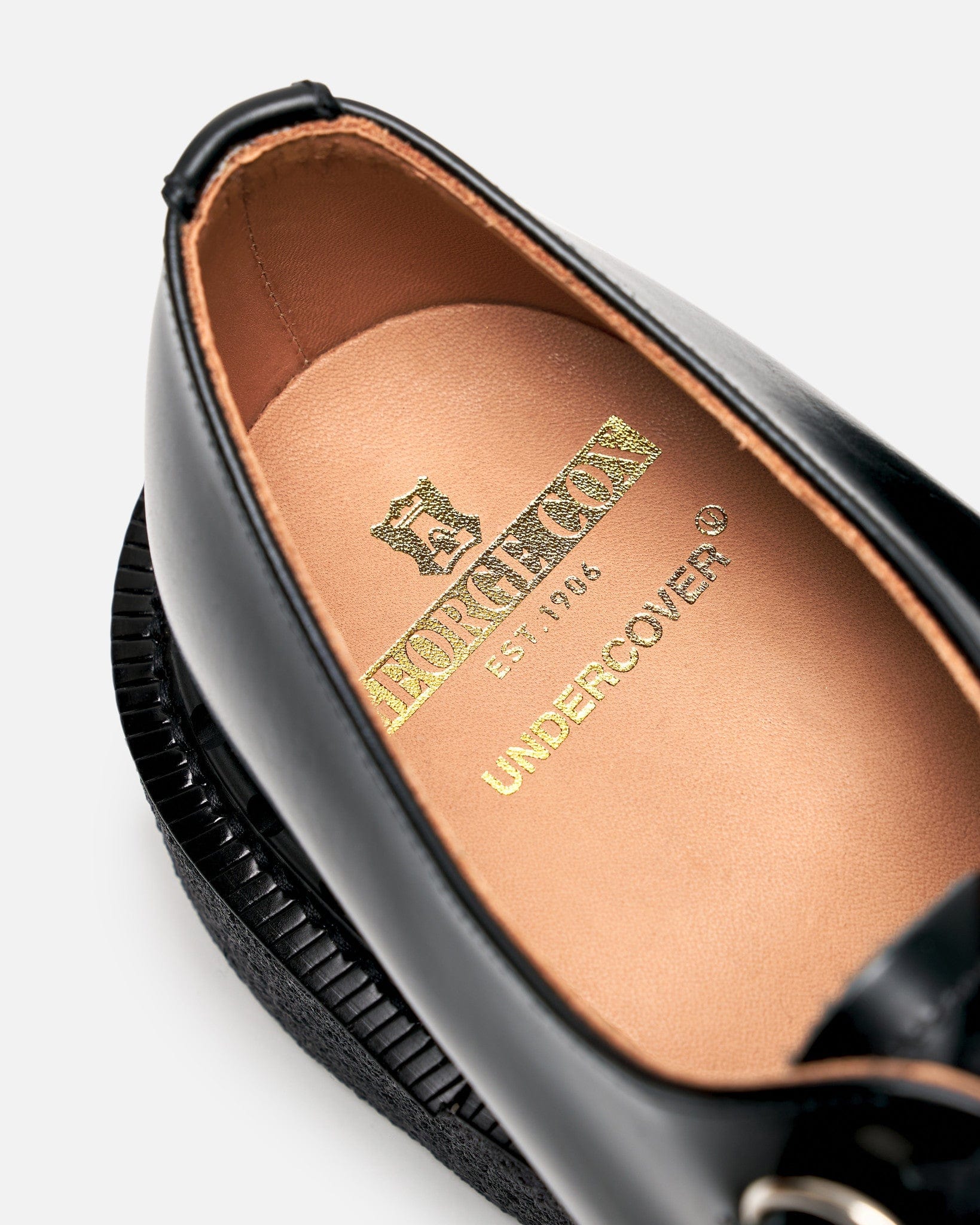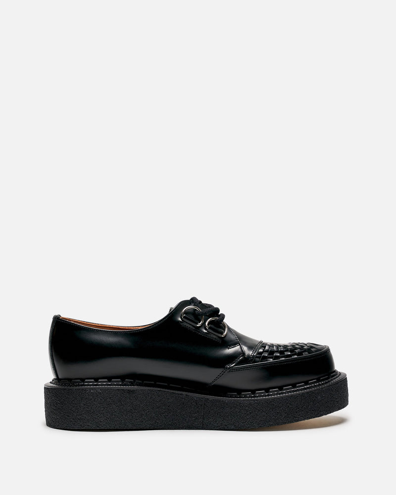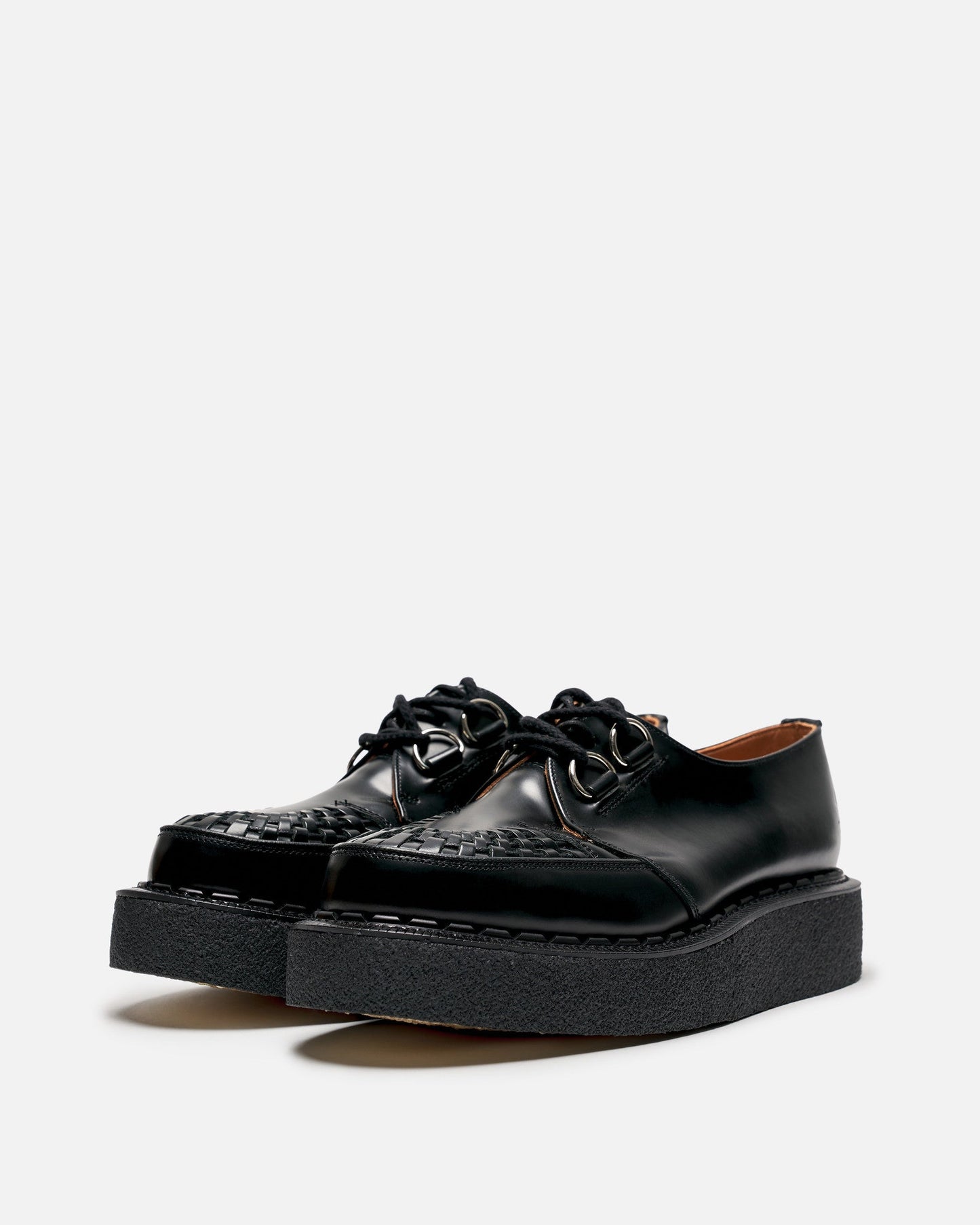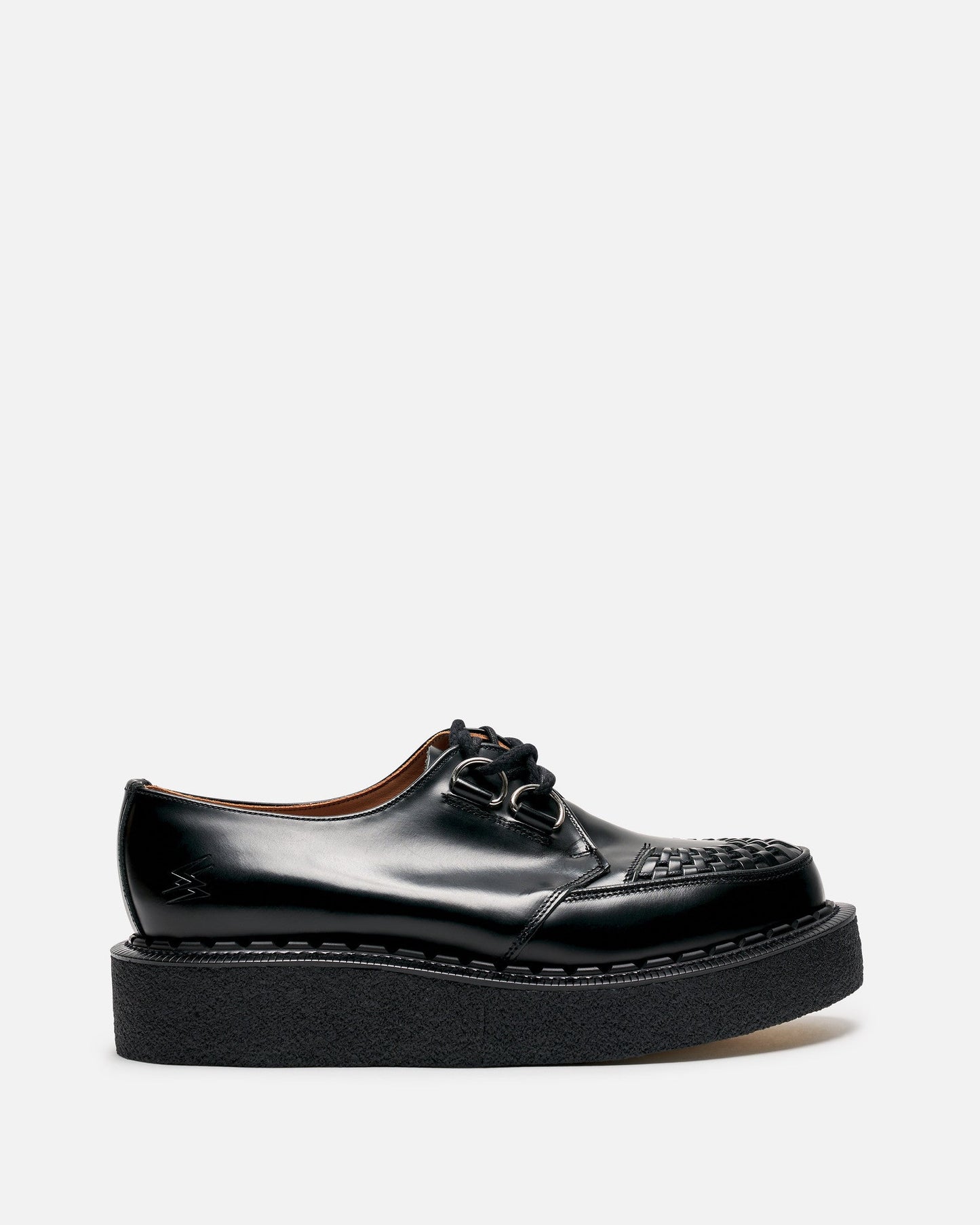 UNDERCOVER x George Cox men's platform derby shoes in black. These shoes feature a platform heel, round toe and woven details.