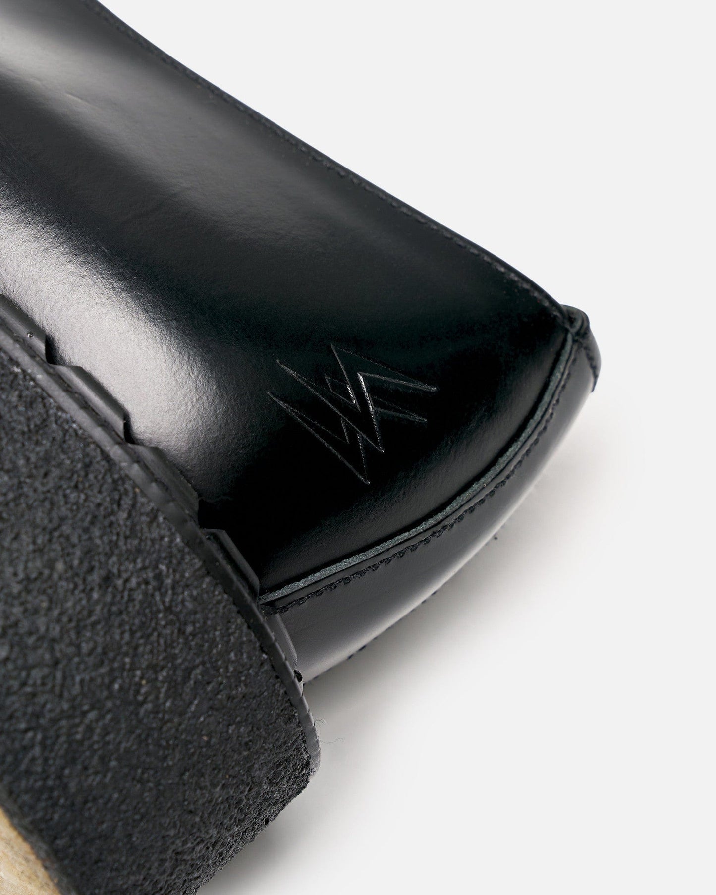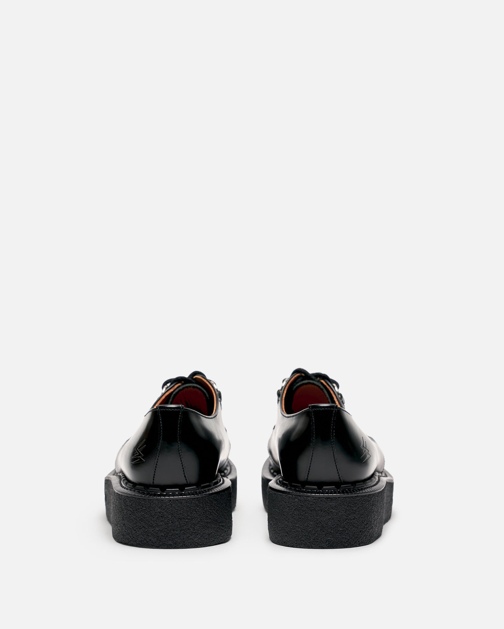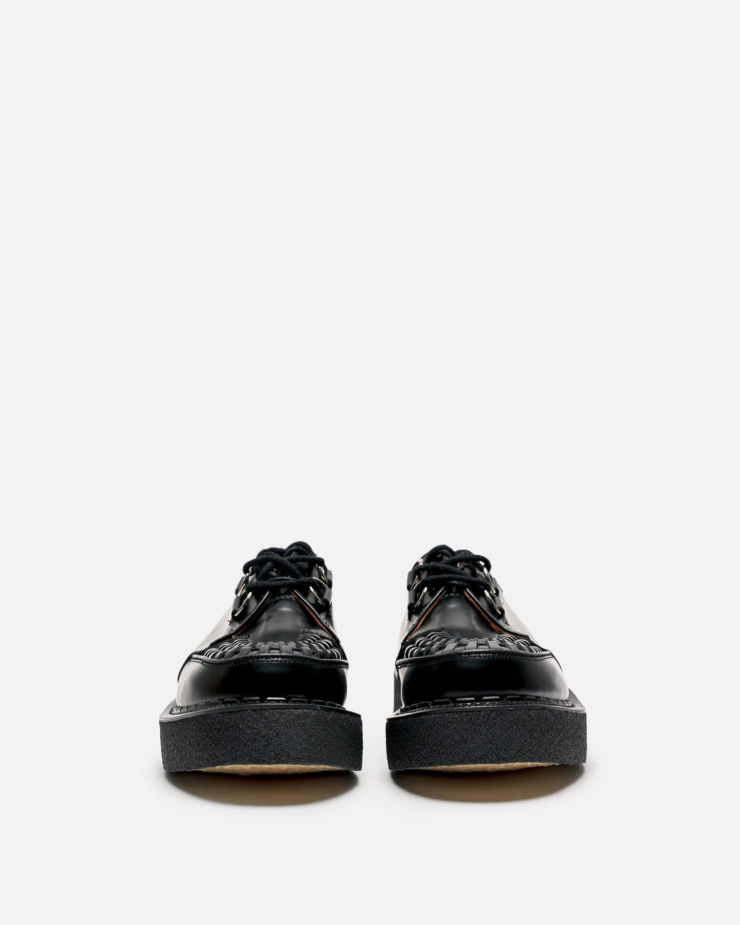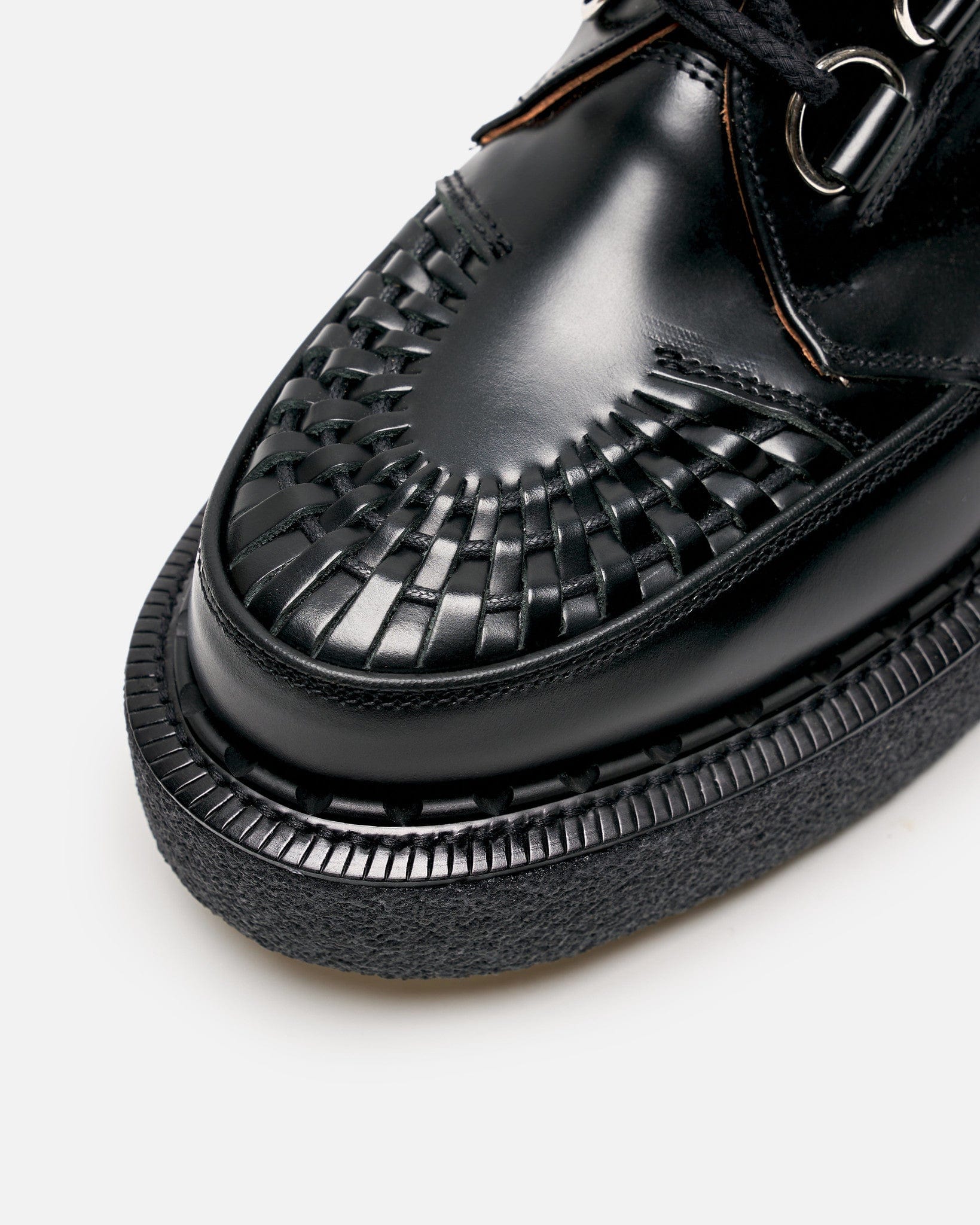 UNDERCOVER x George Cox men's platform derby shoes in black. These shoes feature a platform heel, round toe and woven details.