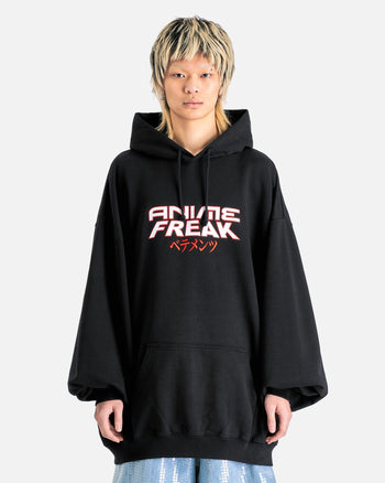VETEMENTS Anime Freak Hoodie in Black. This hoodie features an embroidered hood with drawstring, embroidered and printed font, kangaroo pocket, dolman sleeves and ribbed cuffs and hem.