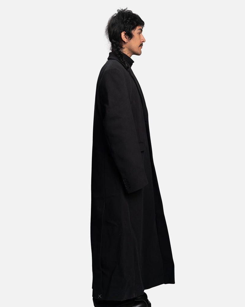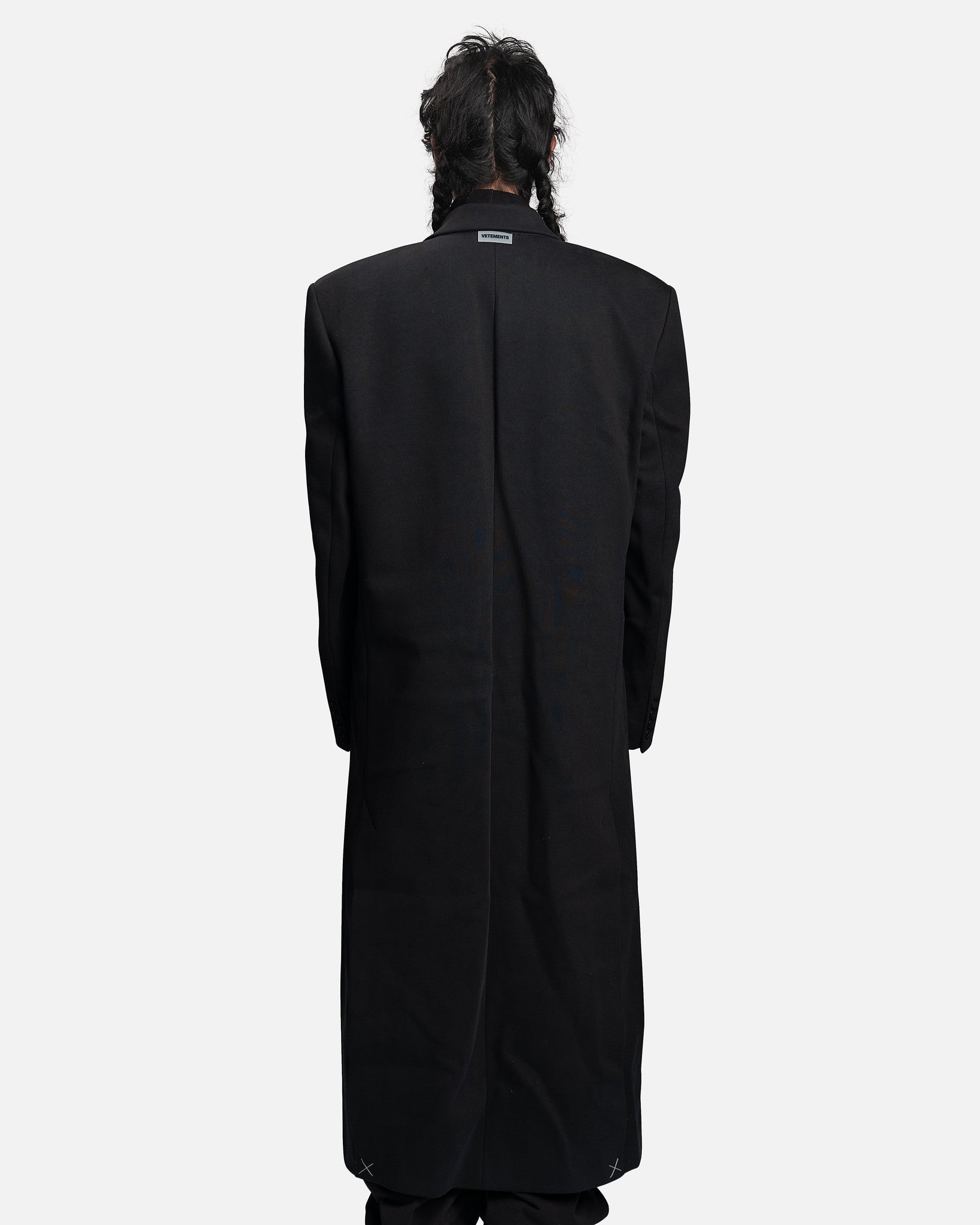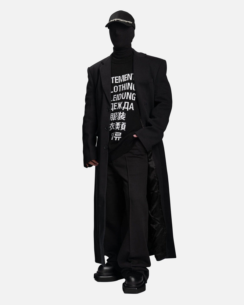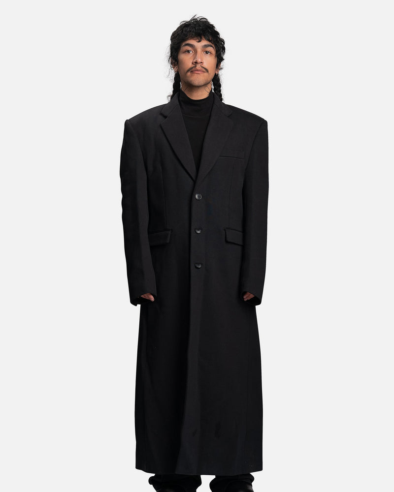VETEMENTS men's single breasted coat in black. This oversized, boxy coat has notched lapels and flap pockets at the waist. There is tailored detailing along the chest as well as a welt pocket.