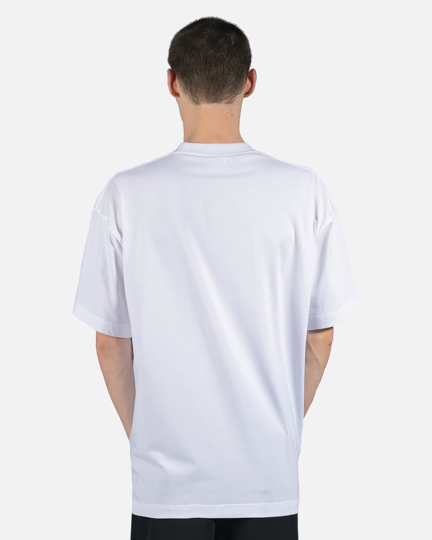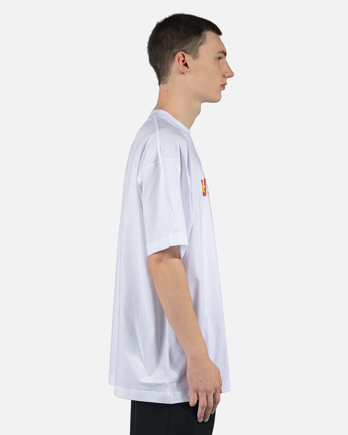 Short sleeve cotton jersey T-shirt in white. Rib knit crewneck collar. Logo printed in multicolor and text printed in black at chest. Dropped shoulders. Tonal logo embroidered at back collar.