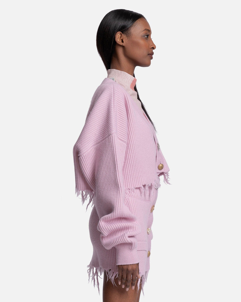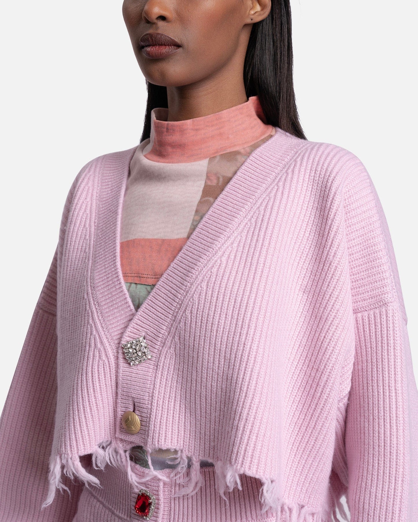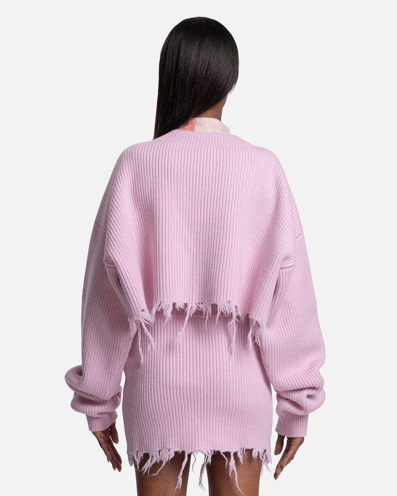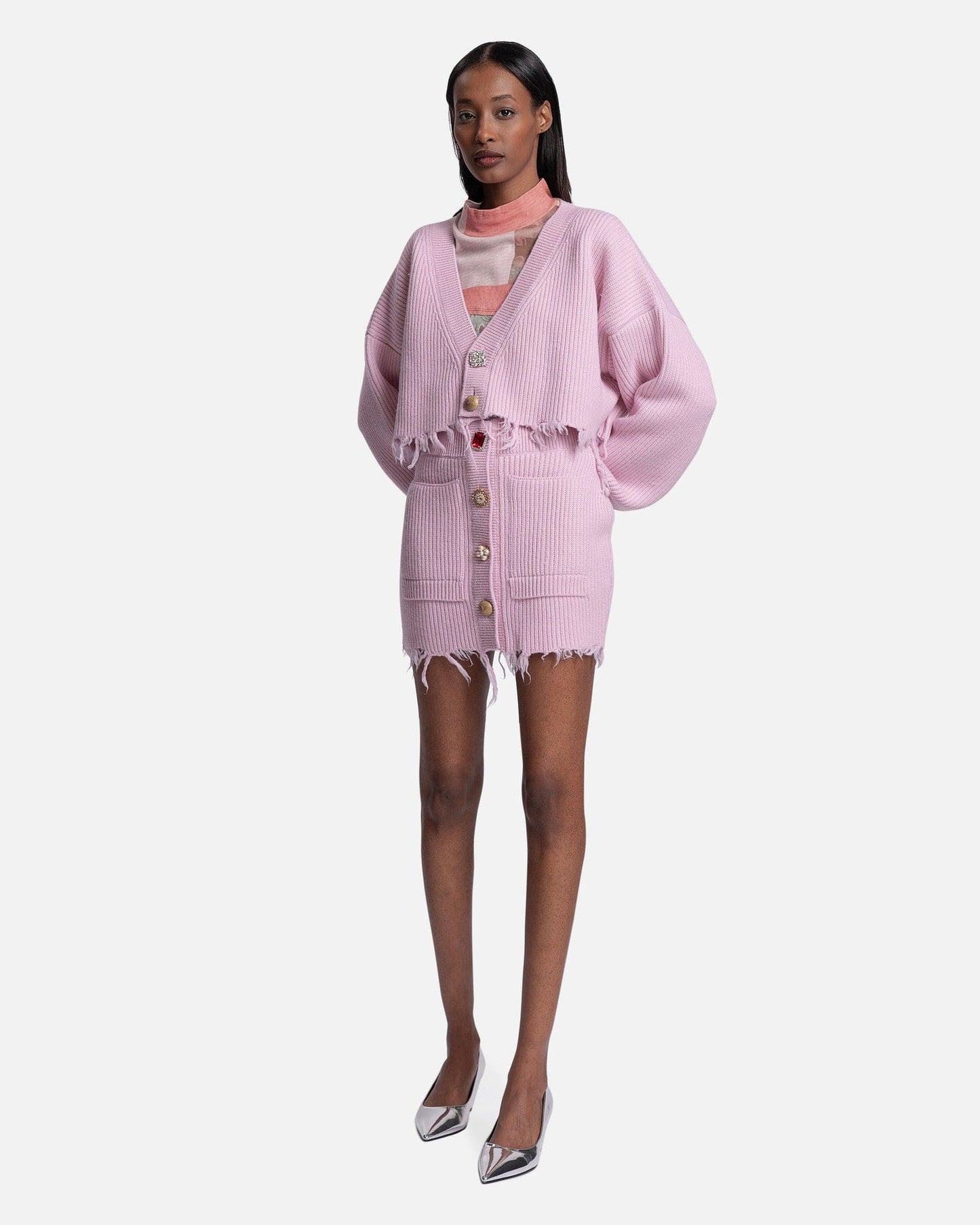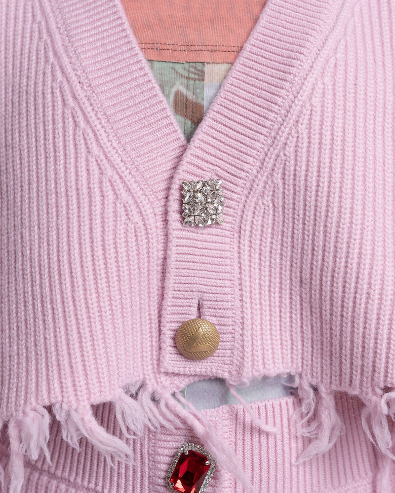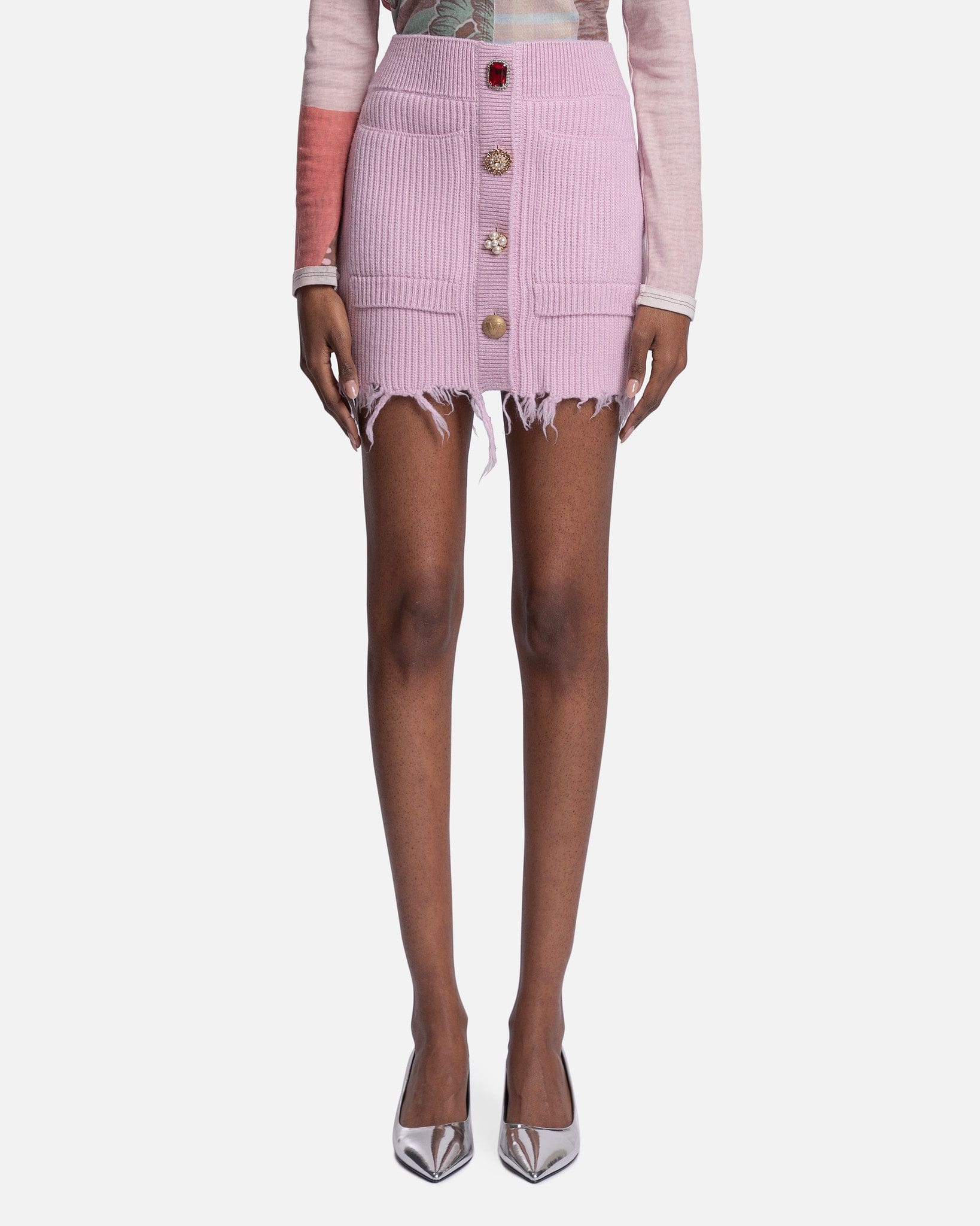 VETEMENTS women's cardigan and skirt set in pink. The top is a cropped cardigan with a frayed edge and jewel buttons. The skirt is fitted with front button closure and front patch pockets with a raw edge.