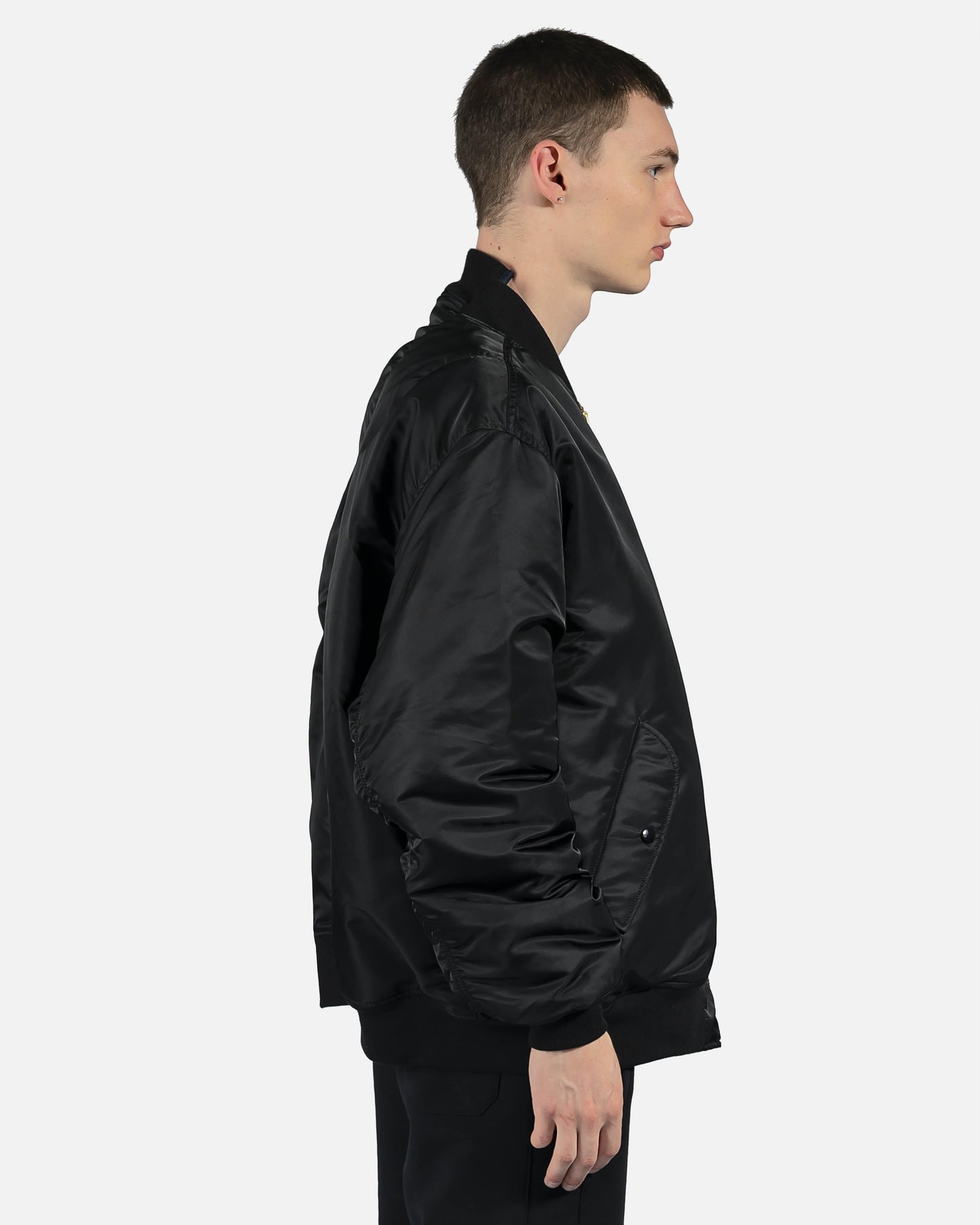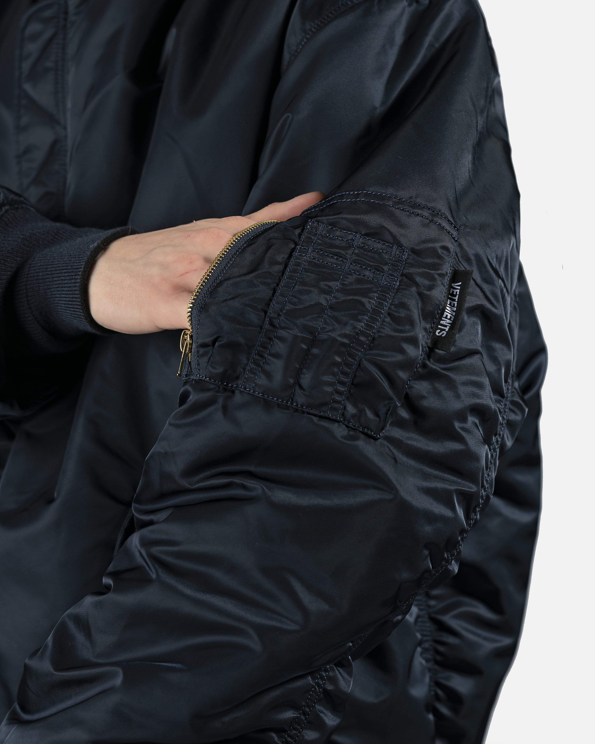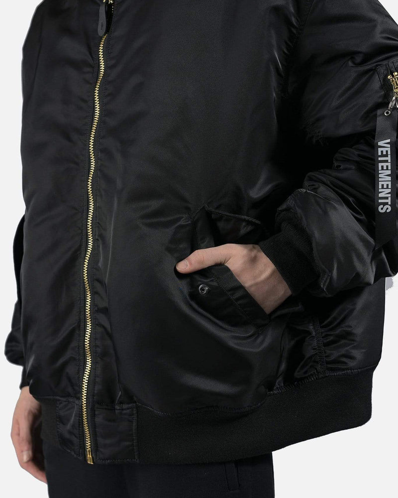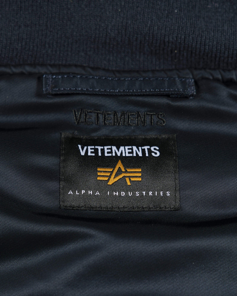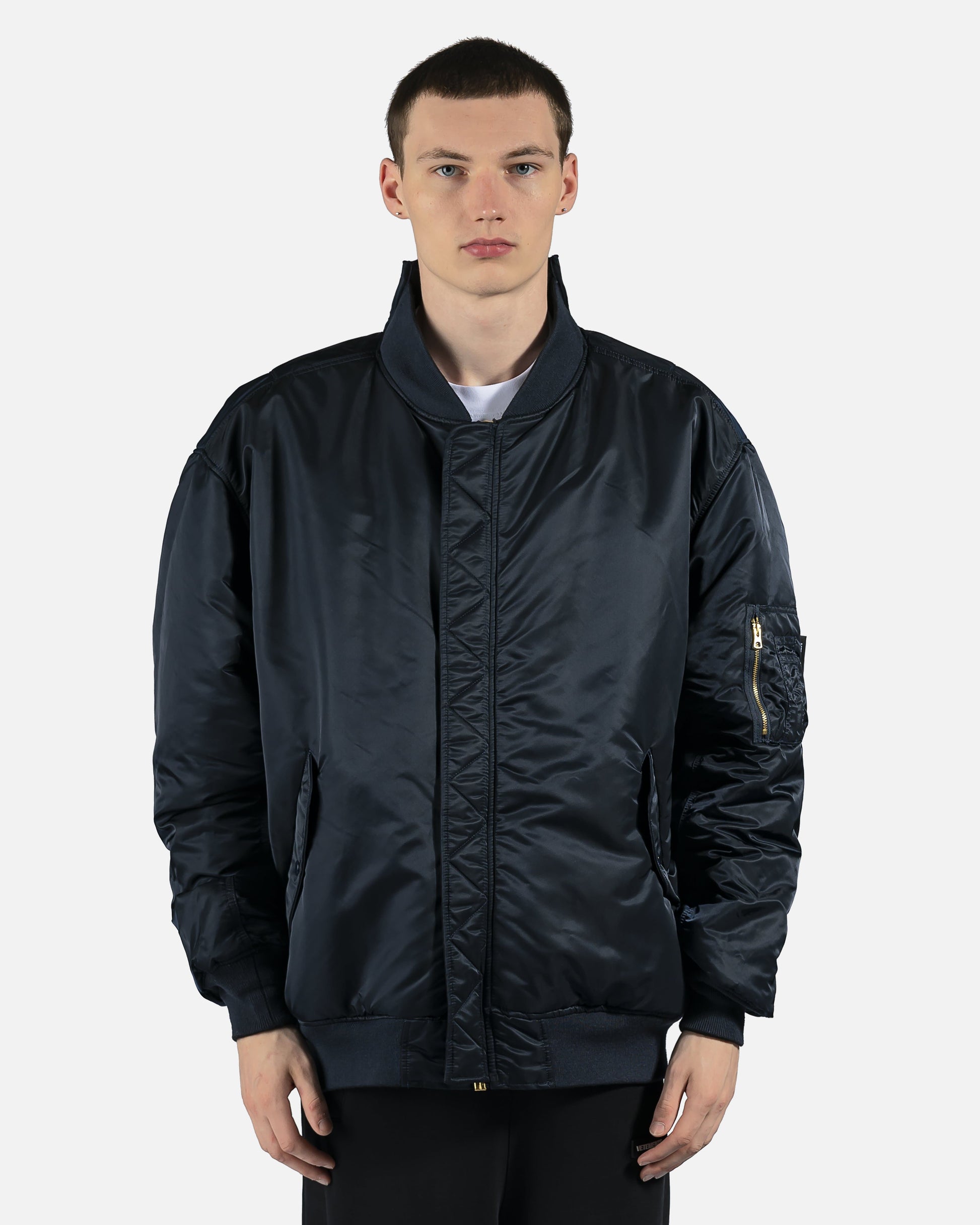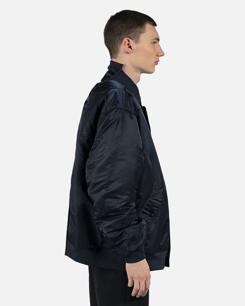 Reversible Alpha Industries bomber with cut up spliced detail at collar. Brass tone hardware at front and arm pockets. Reversible colors between black and dark navy. Oversized fit.