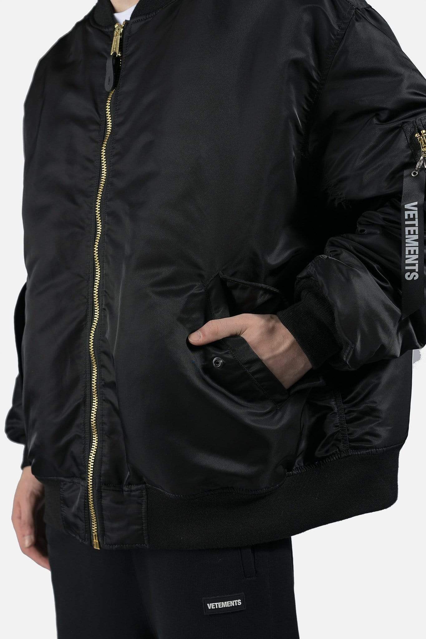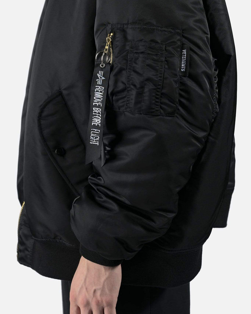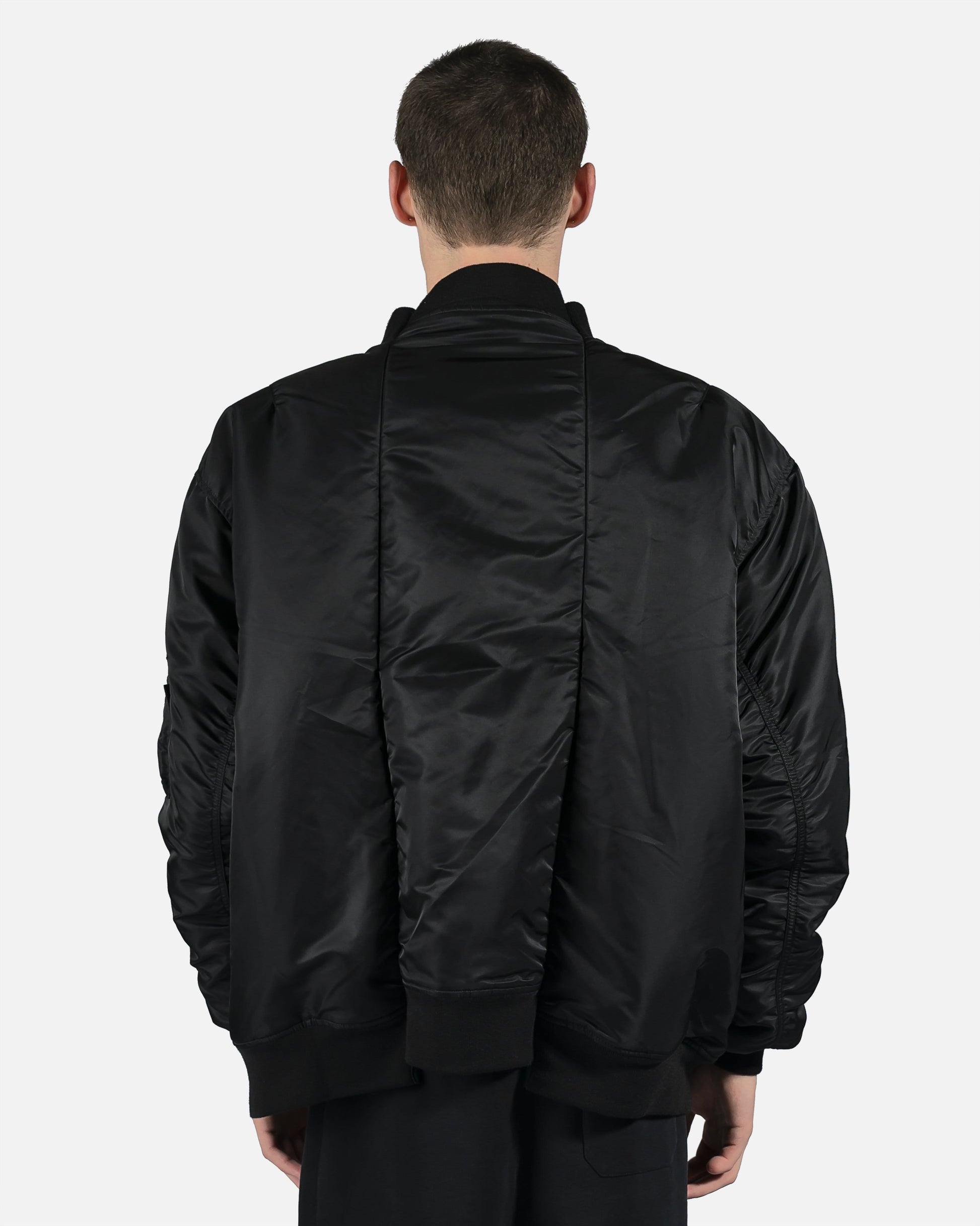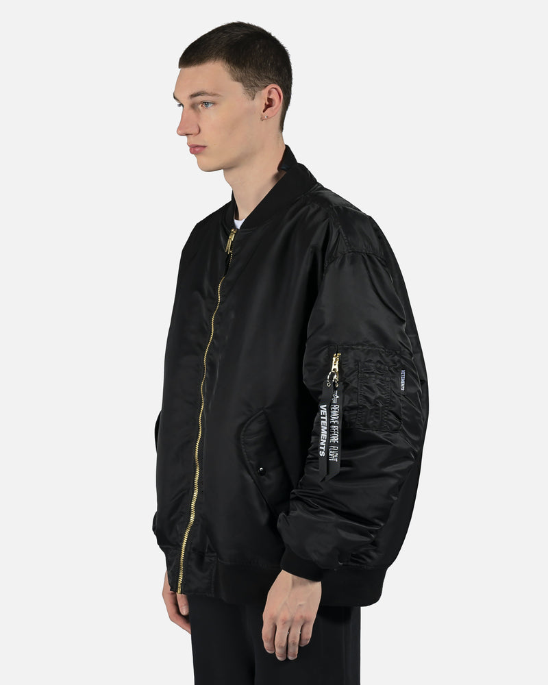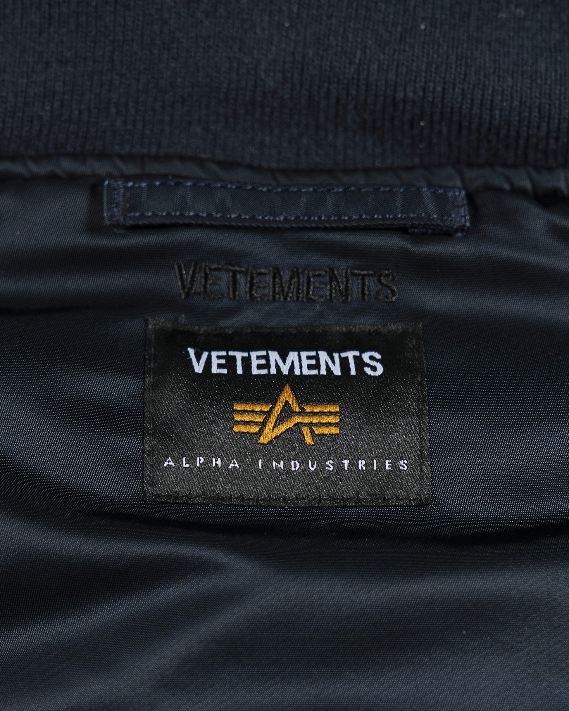 Reversible Alpha Industries bomber with cut up spliced detail at collar. Brass tone hardware at front and arm pockets. Reversible colors between black and dark navy. Oversized fit.