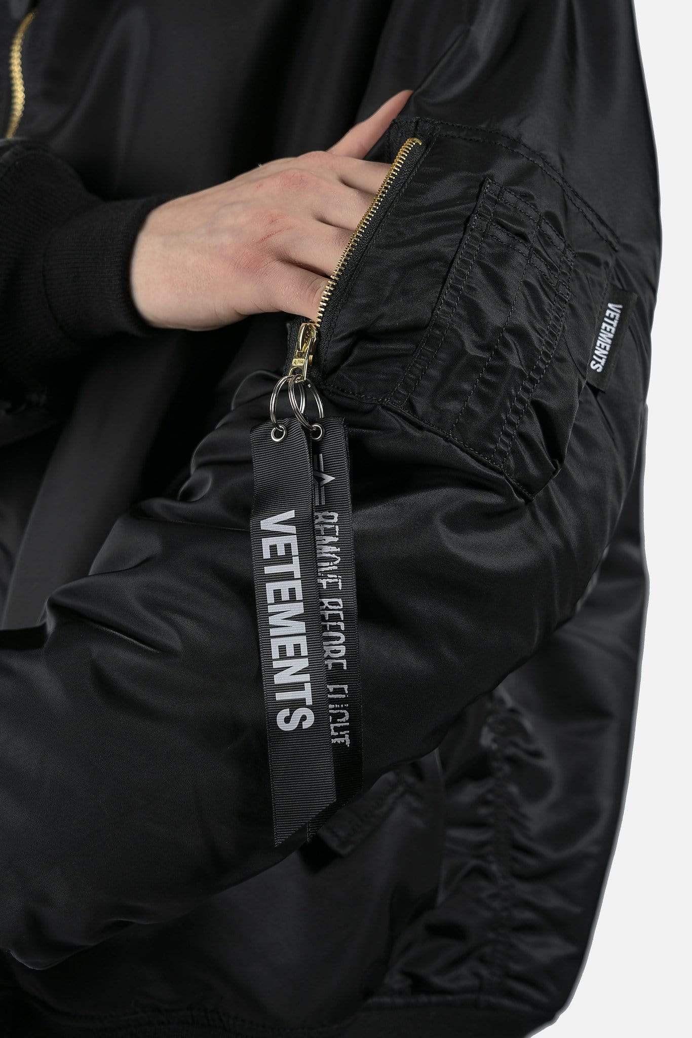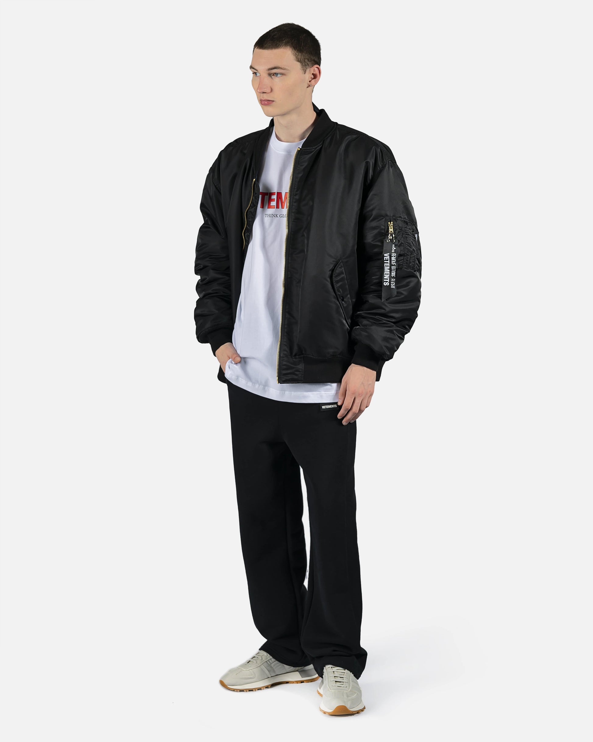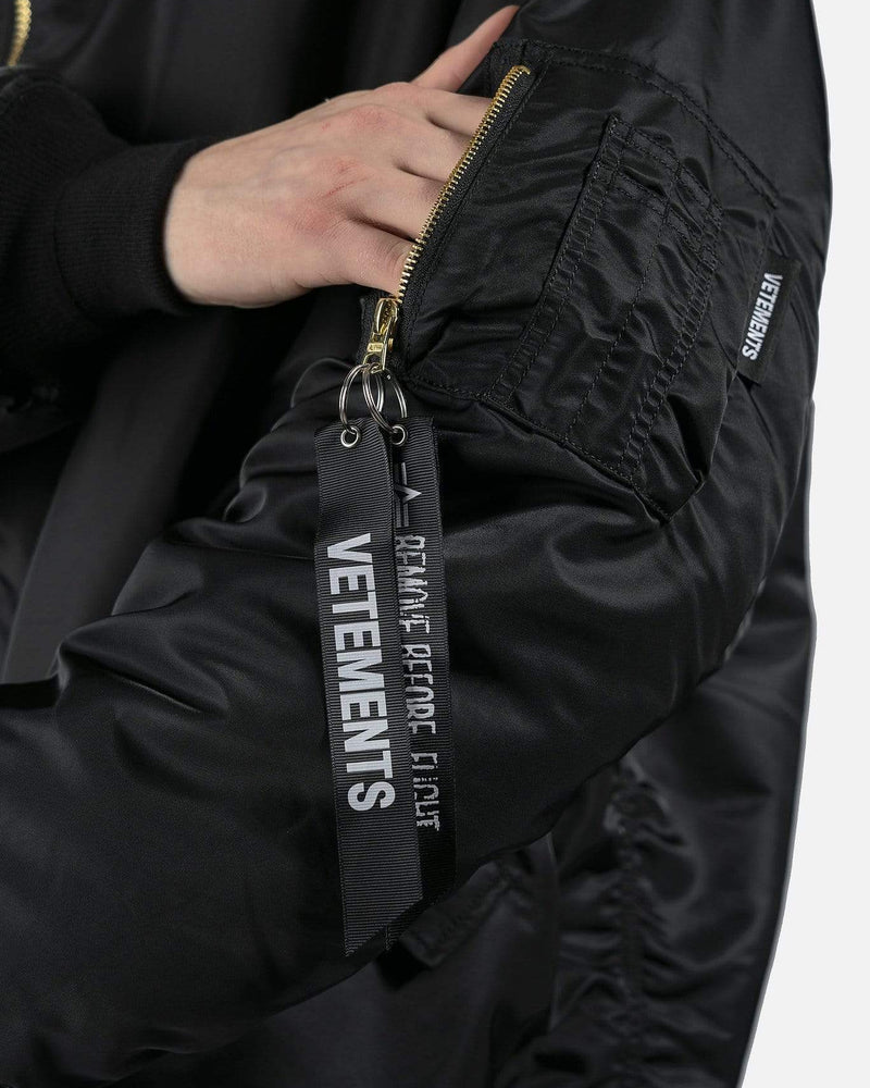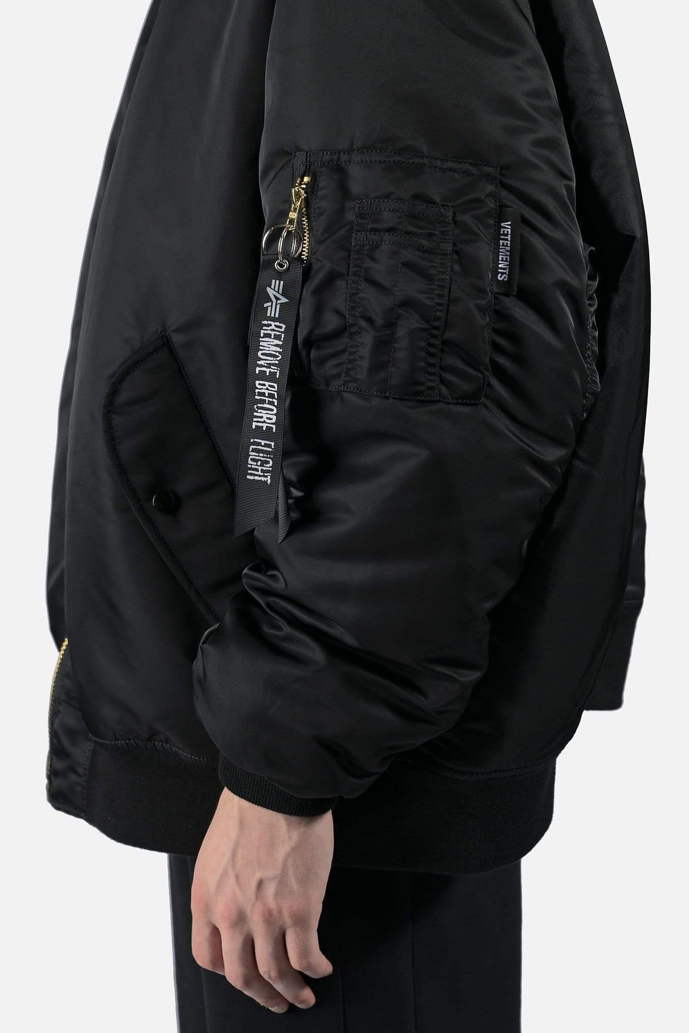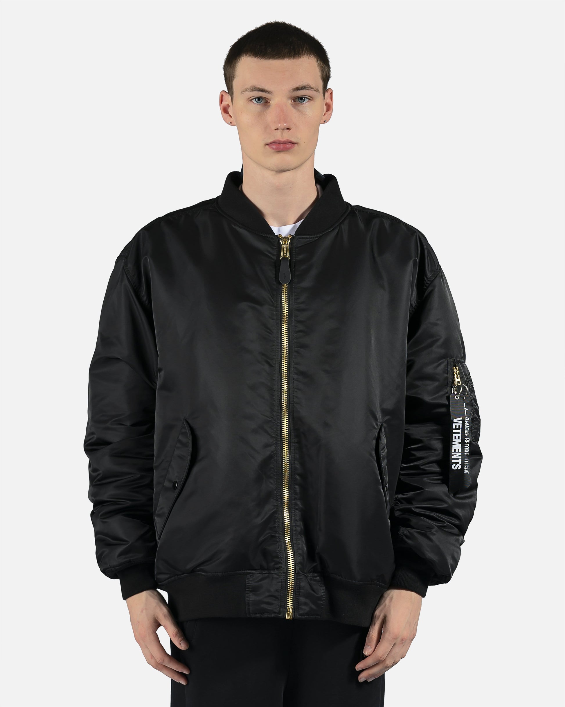 Reversible Alpha Industries bomber with cut up spliced detail at collar. Brass tone hardware at front and arm pockets. Reversible colors between black and dark navy. Oversized fit.
