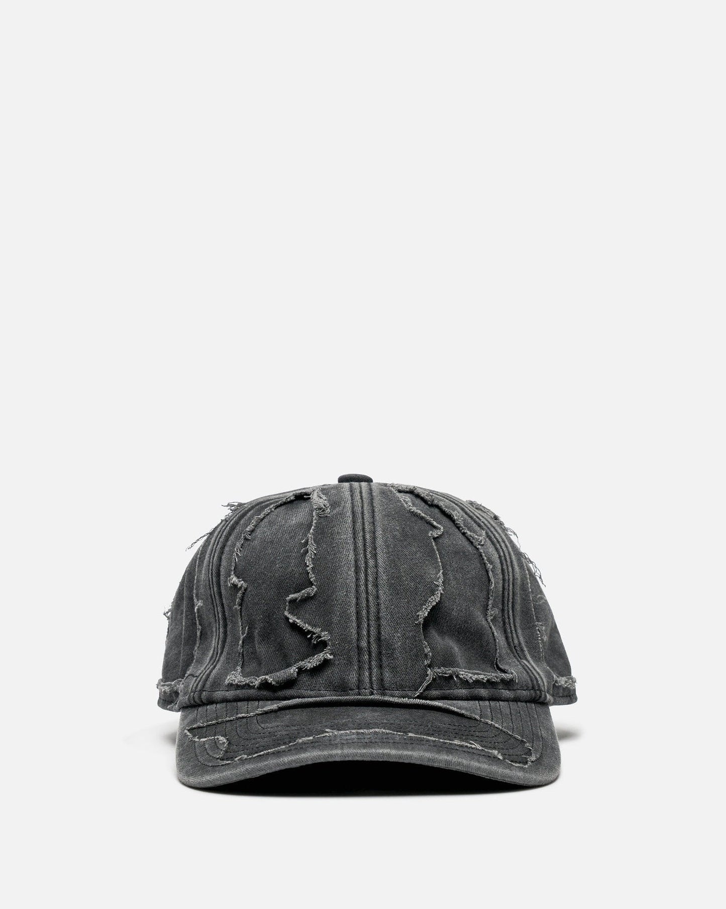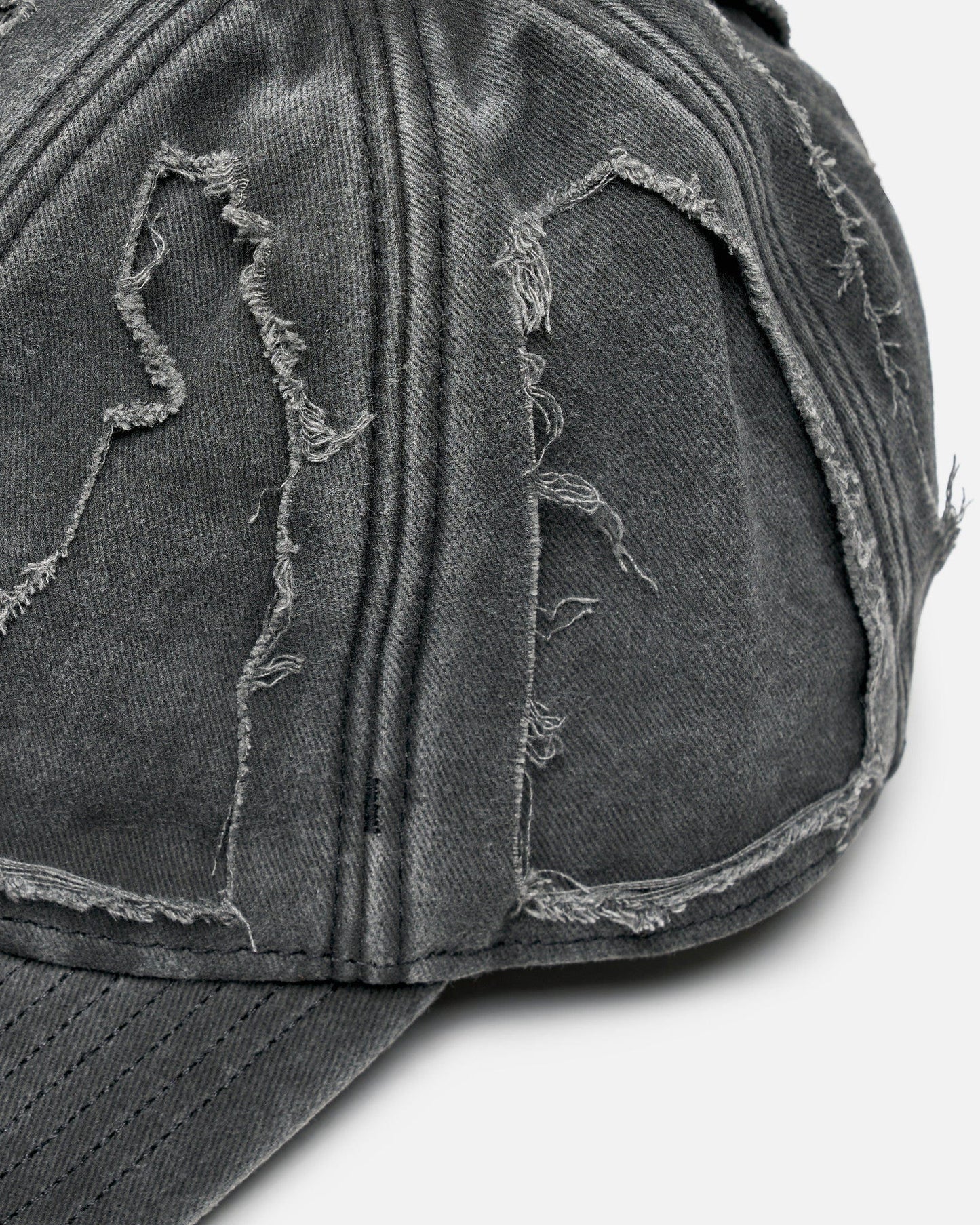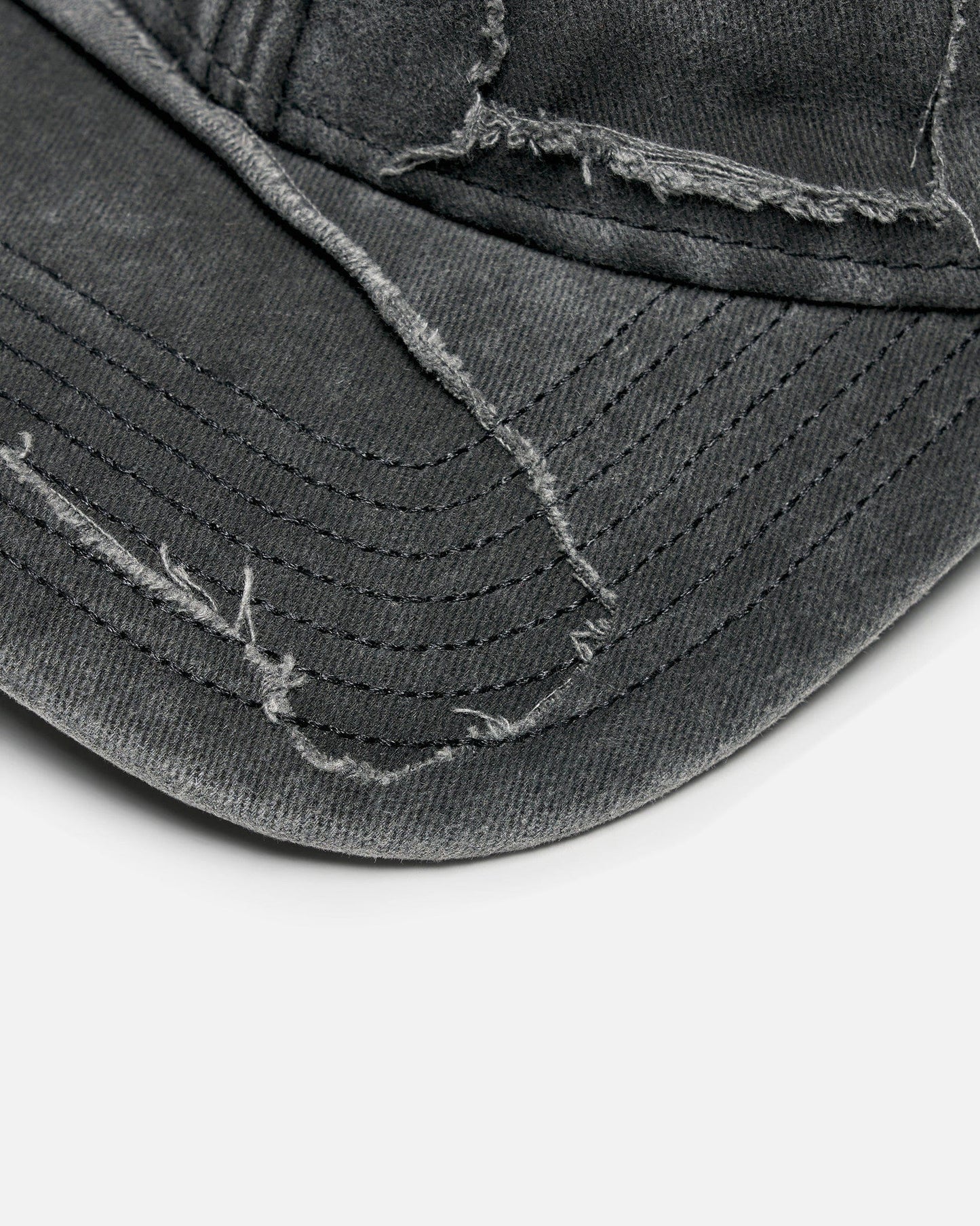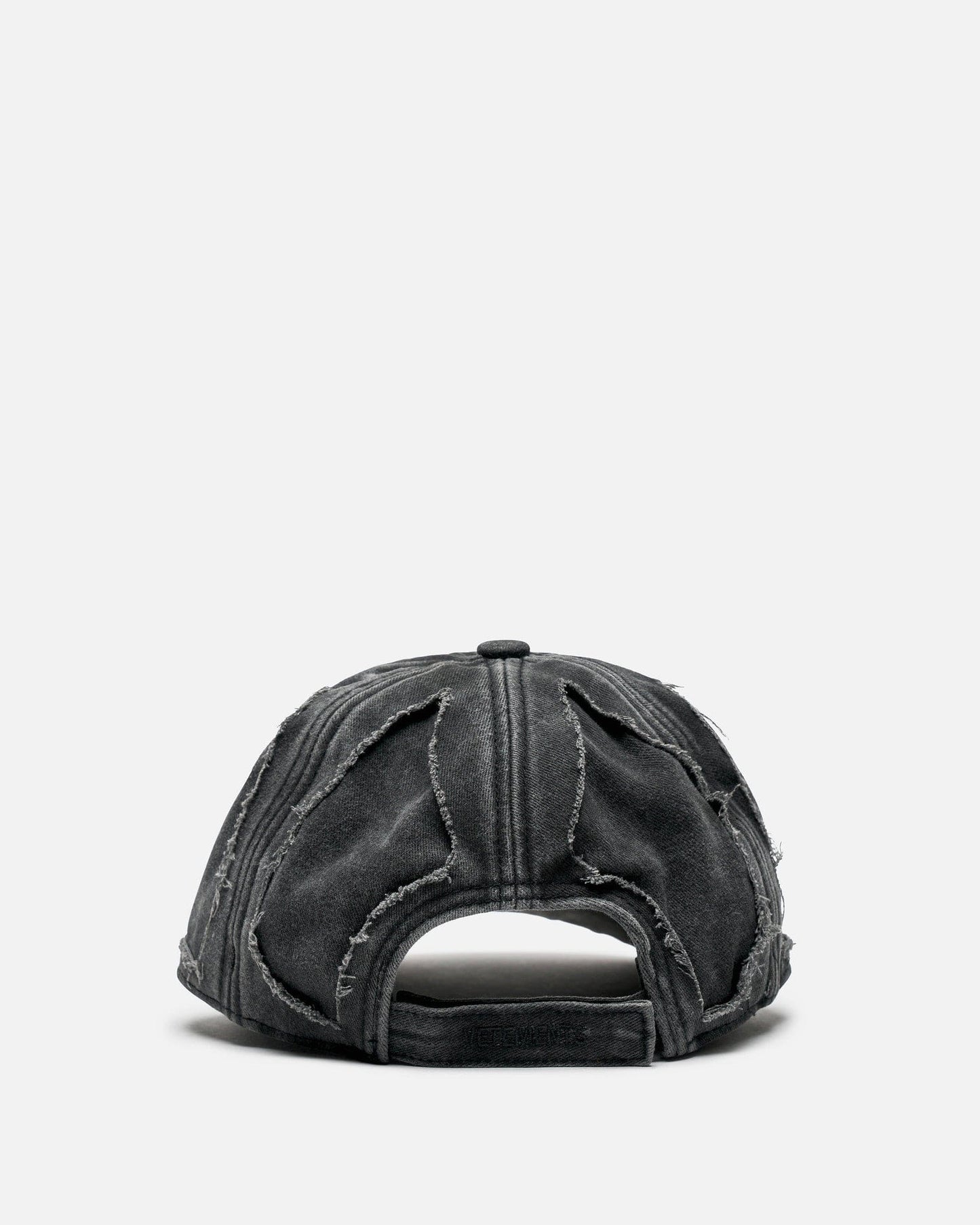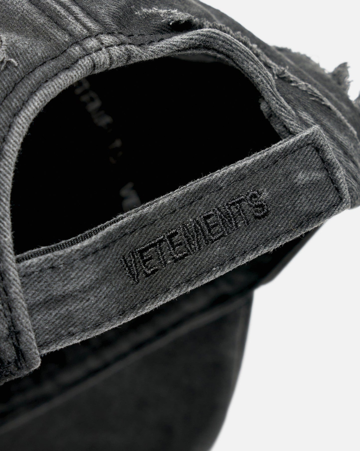 VETEMENTS Destroyed Cap in Washed Black. This cap features a 6-panel design, distressed details allover, curved brim and adjustable velcro strap at the back.