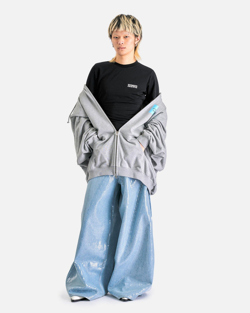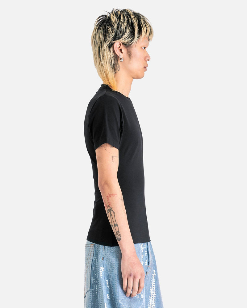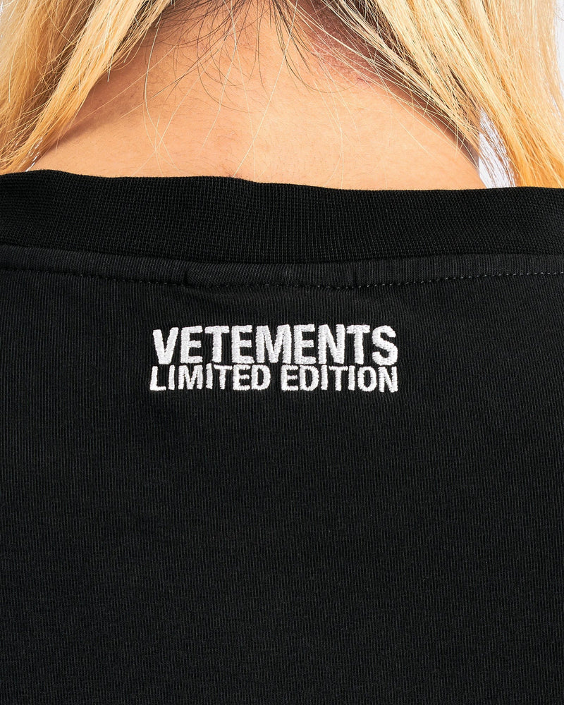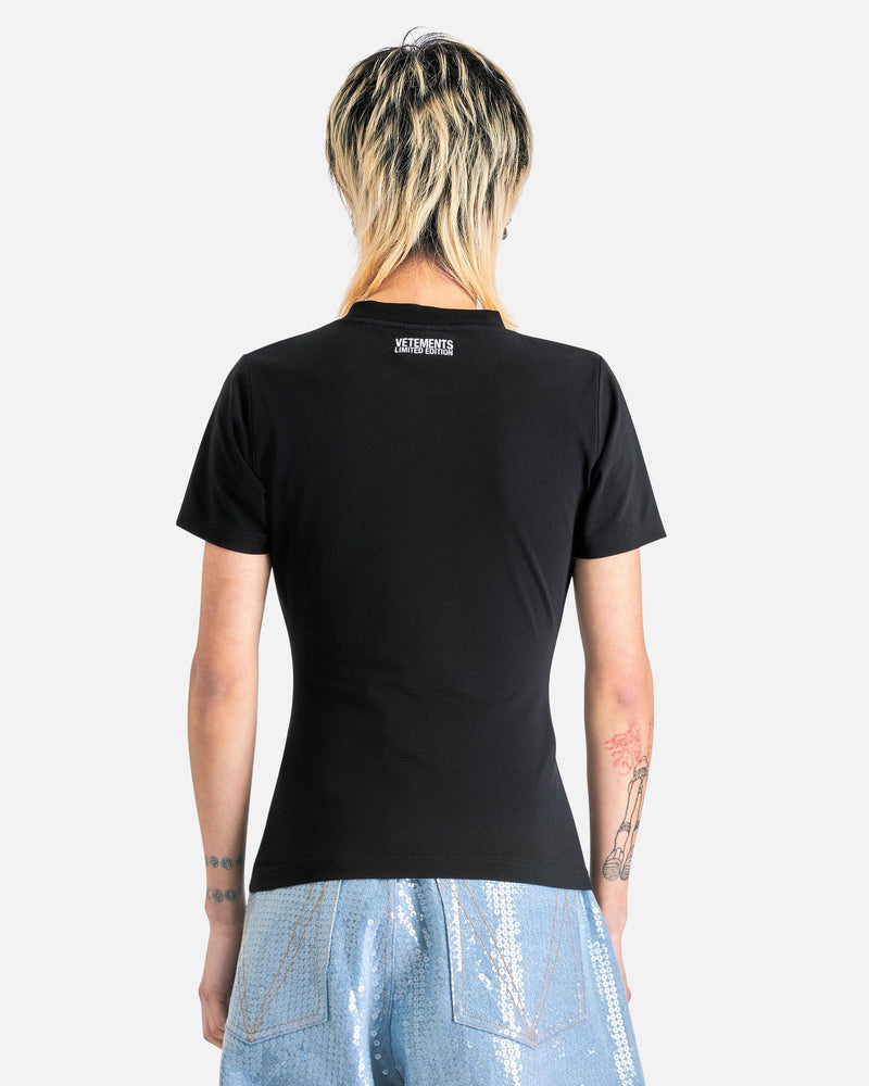 VETEMENTS Embroidered Logo Fitted T-Shirt in Black. This shirt features an embroidered logo at the chest and back collar, ribbed crewneck, and a straight hem.