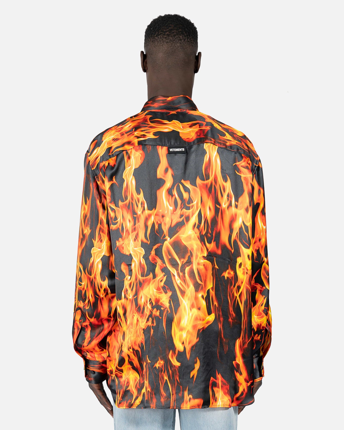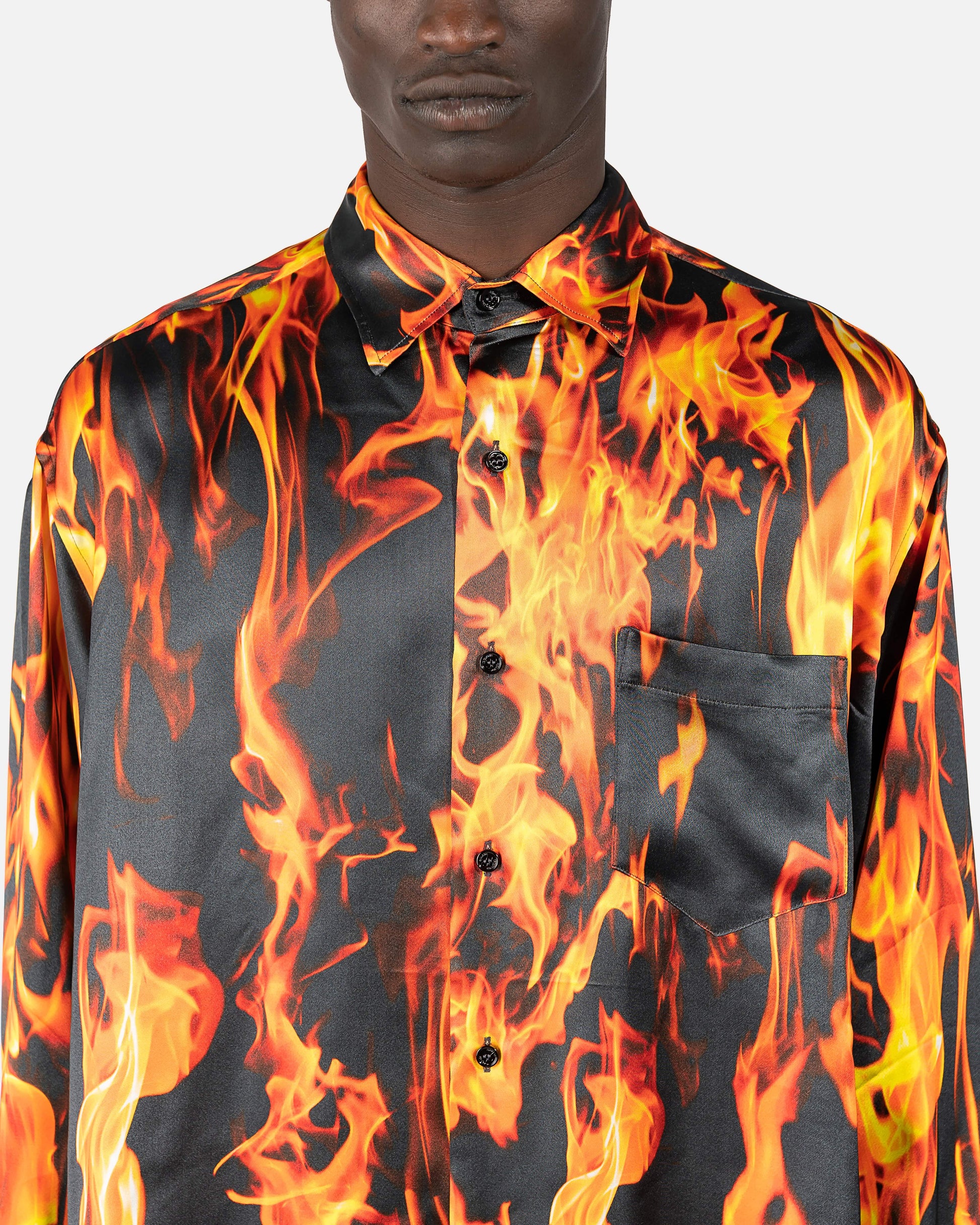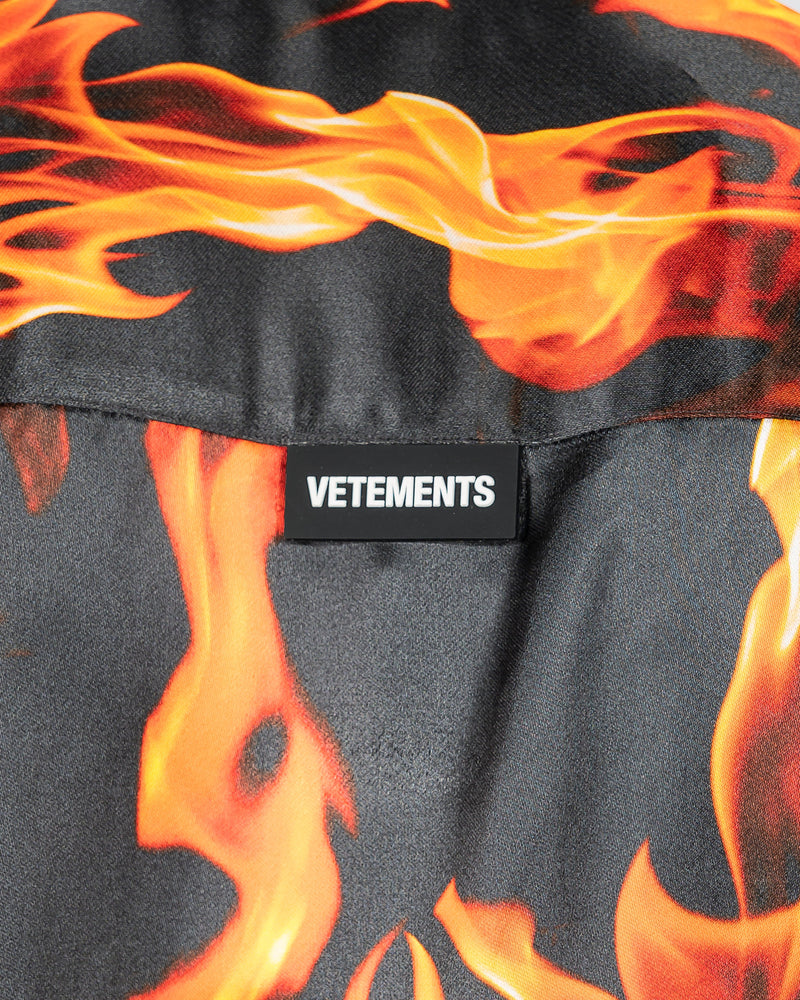 VETEMENTS unisex collared button up jersey in black with an allover orange flame print. This long sleeved jersey top features dropped shoulders and a front patch pocket on the left chest. There is black button closure along the front, as well as the sleeve cuffs, and the shirt features a rubberized logo patch on the back.