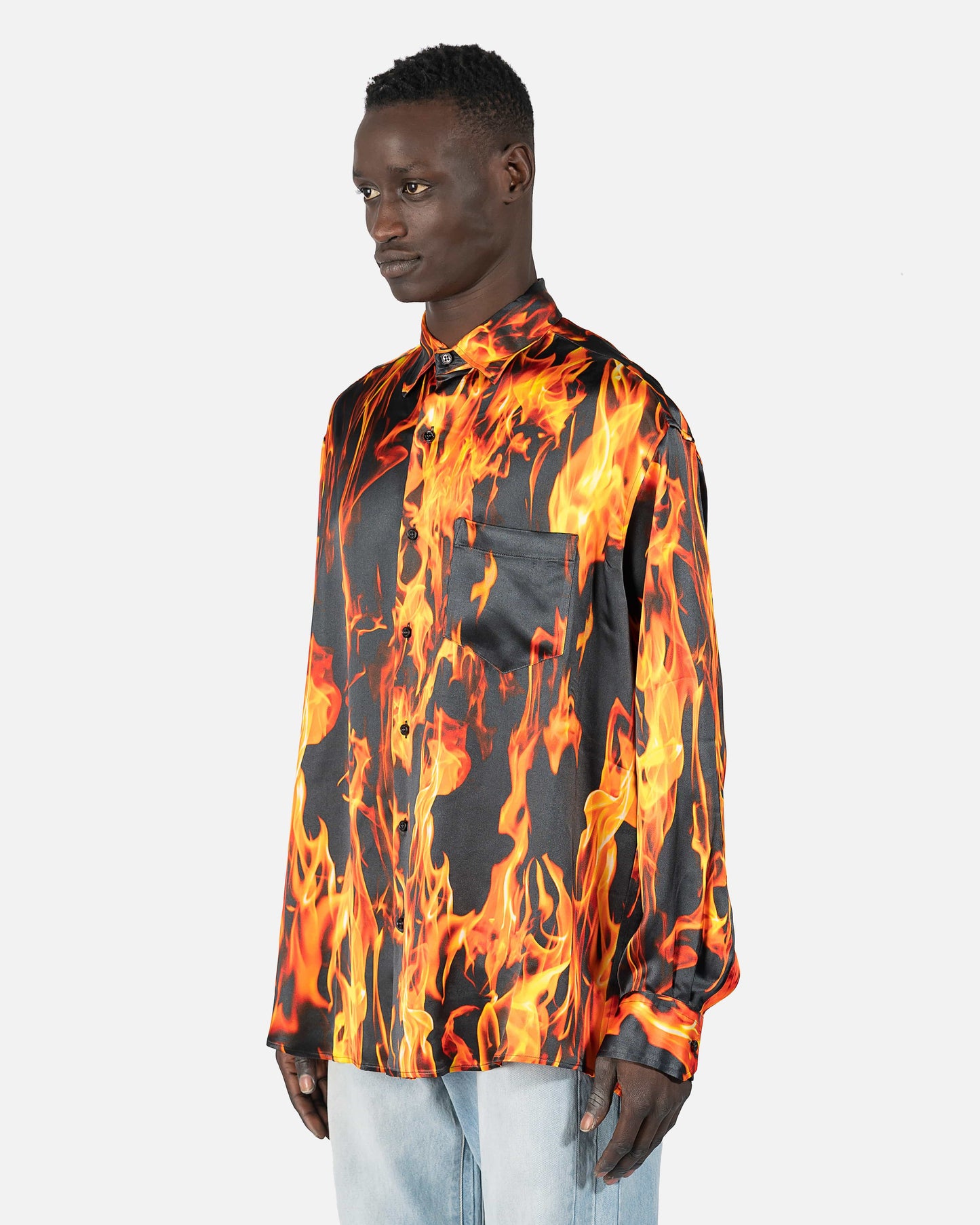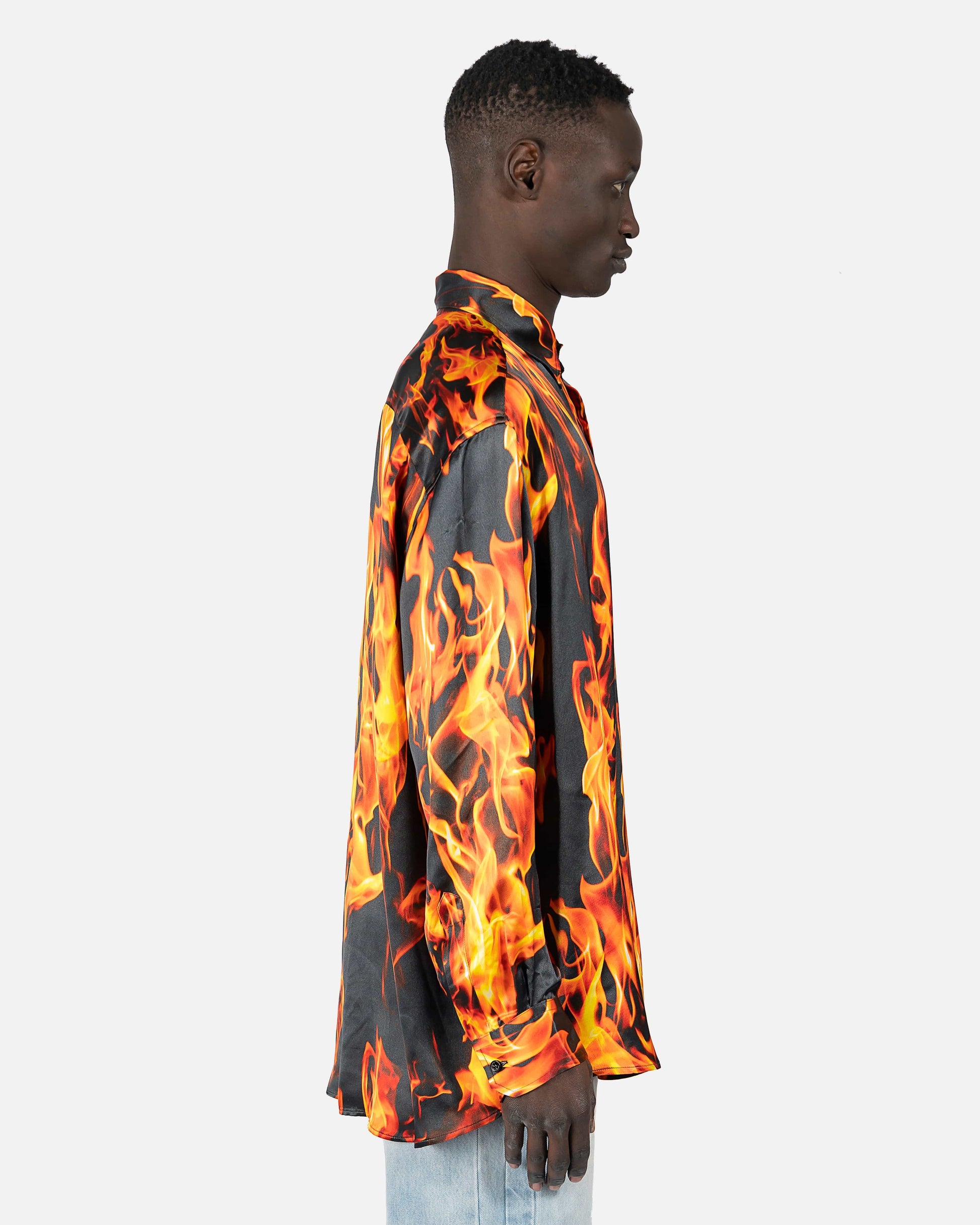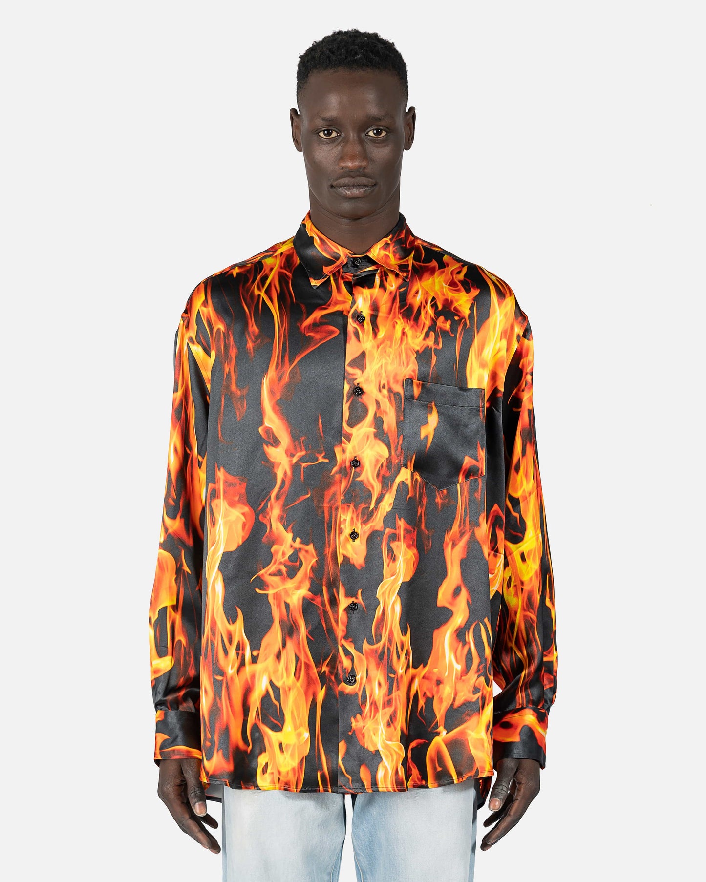 VETEMENTS unisex collared button up jersey in black with an allover orange flame print. This long sleeved jersey top features dropped shoulders and a front patch pocket on the left chest. There is black button closure along the front, as well as the sleeve cuffs, and the shirt features a rubberized logo patch on the back.