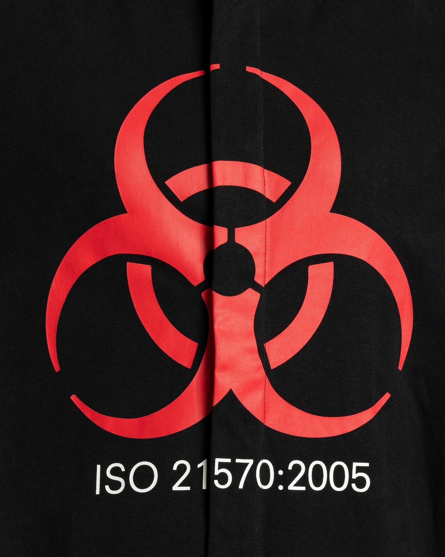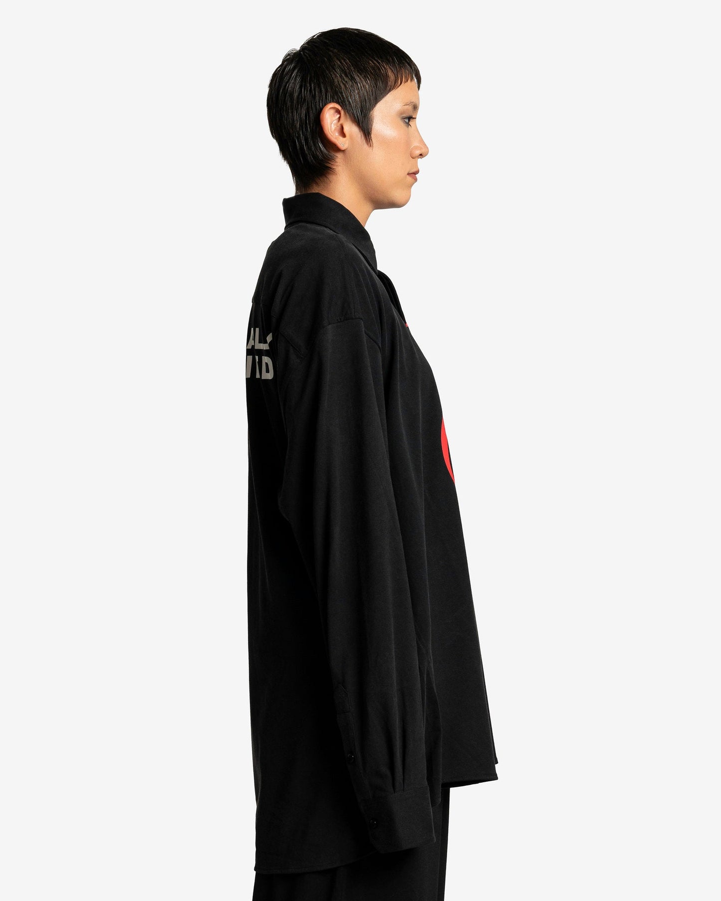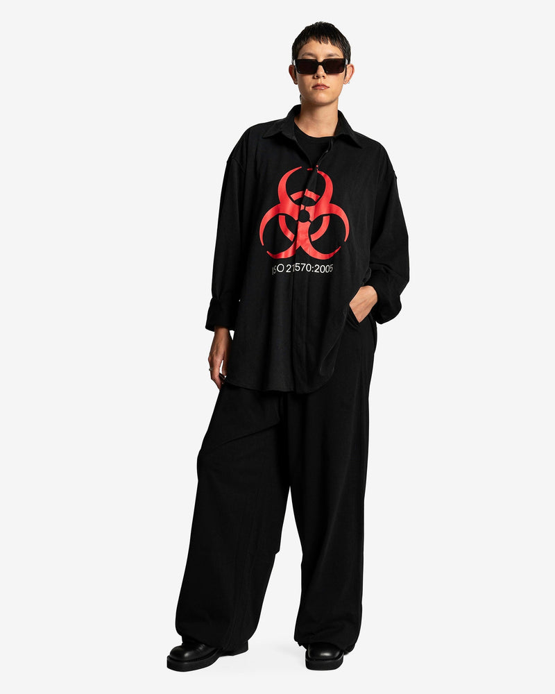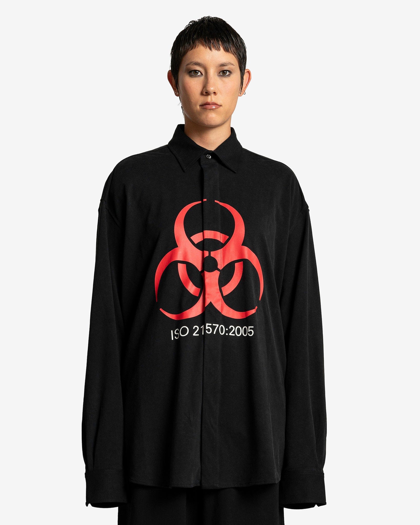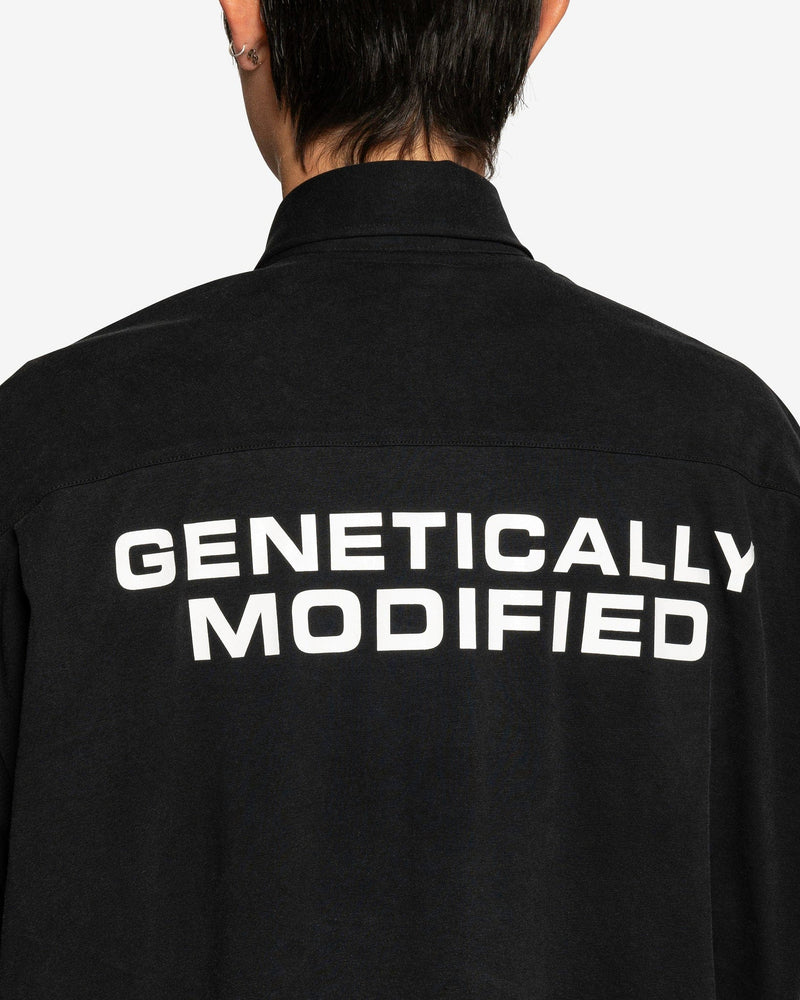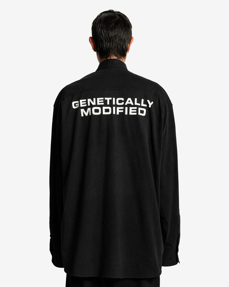 VETEMENTS women's graphic button up top. This top features a red graphic on the front and text that reads 'GENETICALLY MODIFIED' on the back.