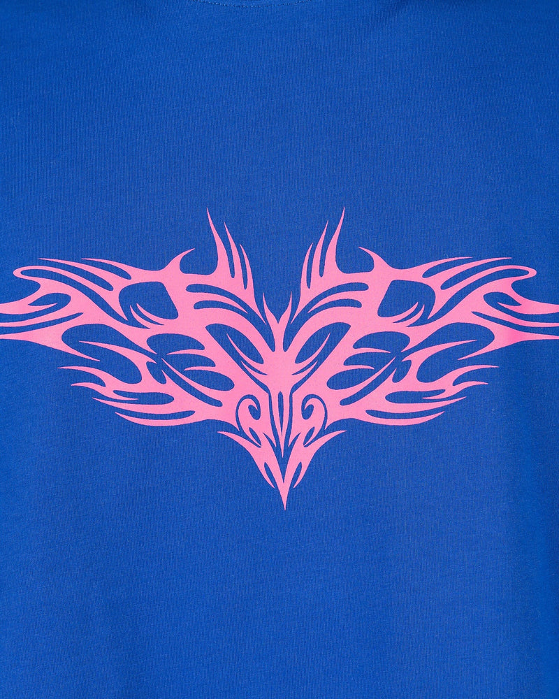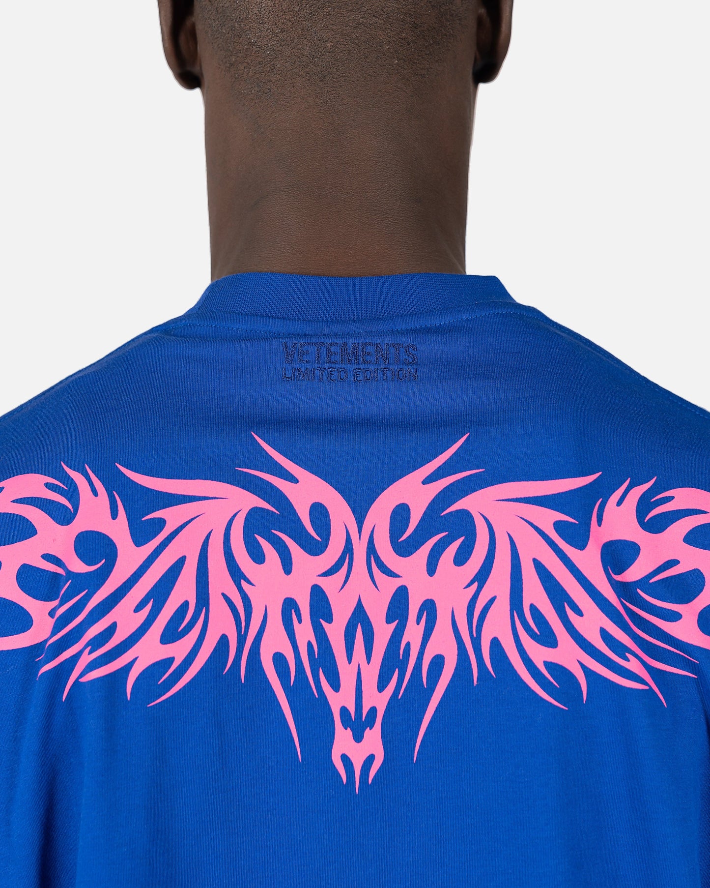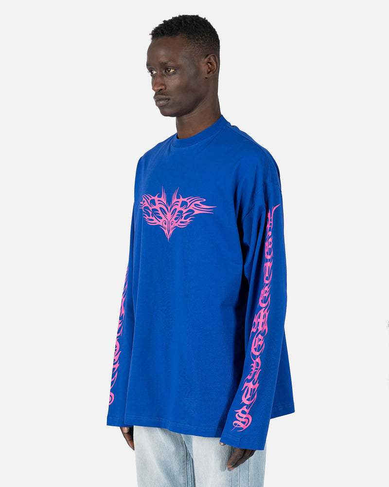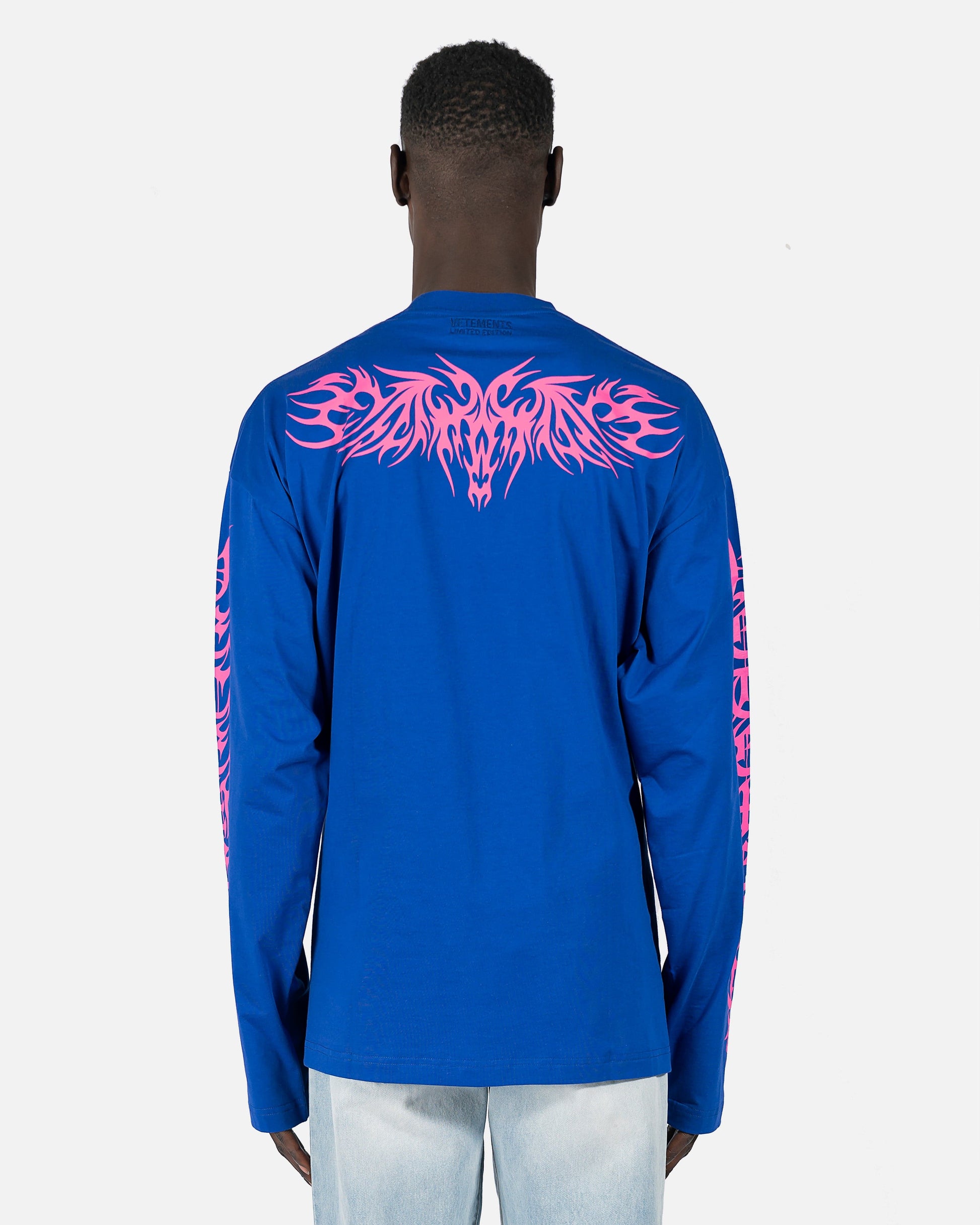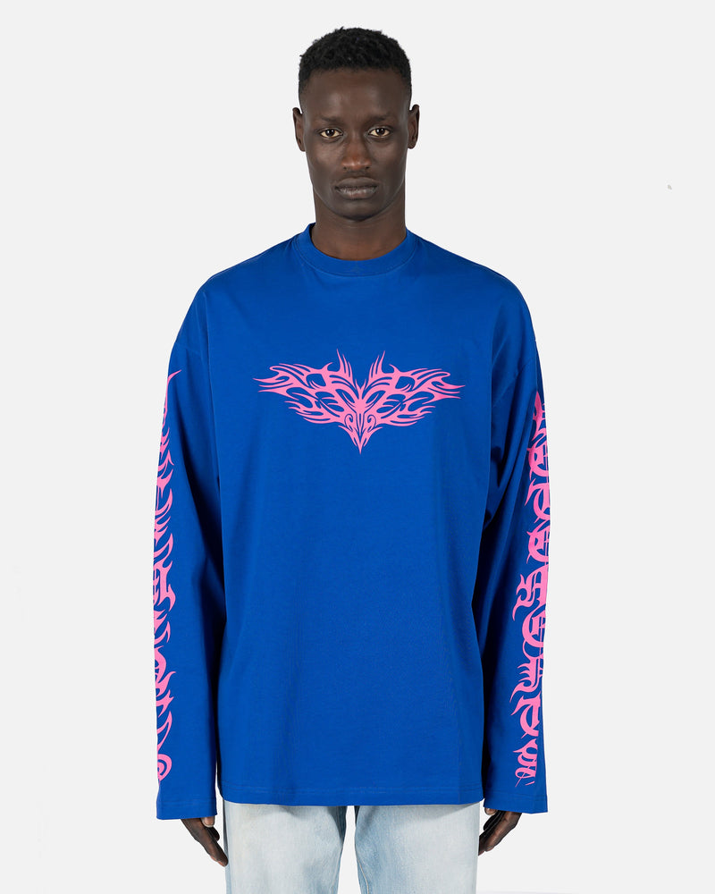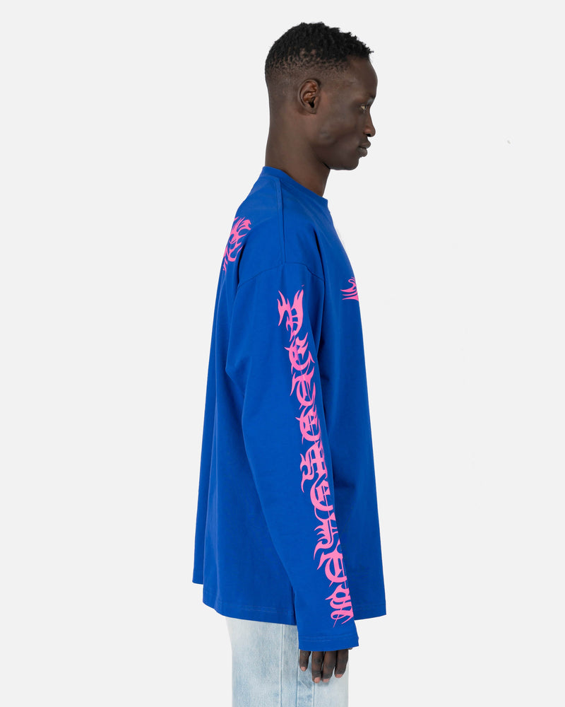 VETEMENTS men's graphic t-shirt in bright blue. This long sleeved t-shirt features a pink graffiti graphic screen printed onto the front chest and the back. The arms have VETEMENTS screen printed vertically in the same graffiti font and pink color.