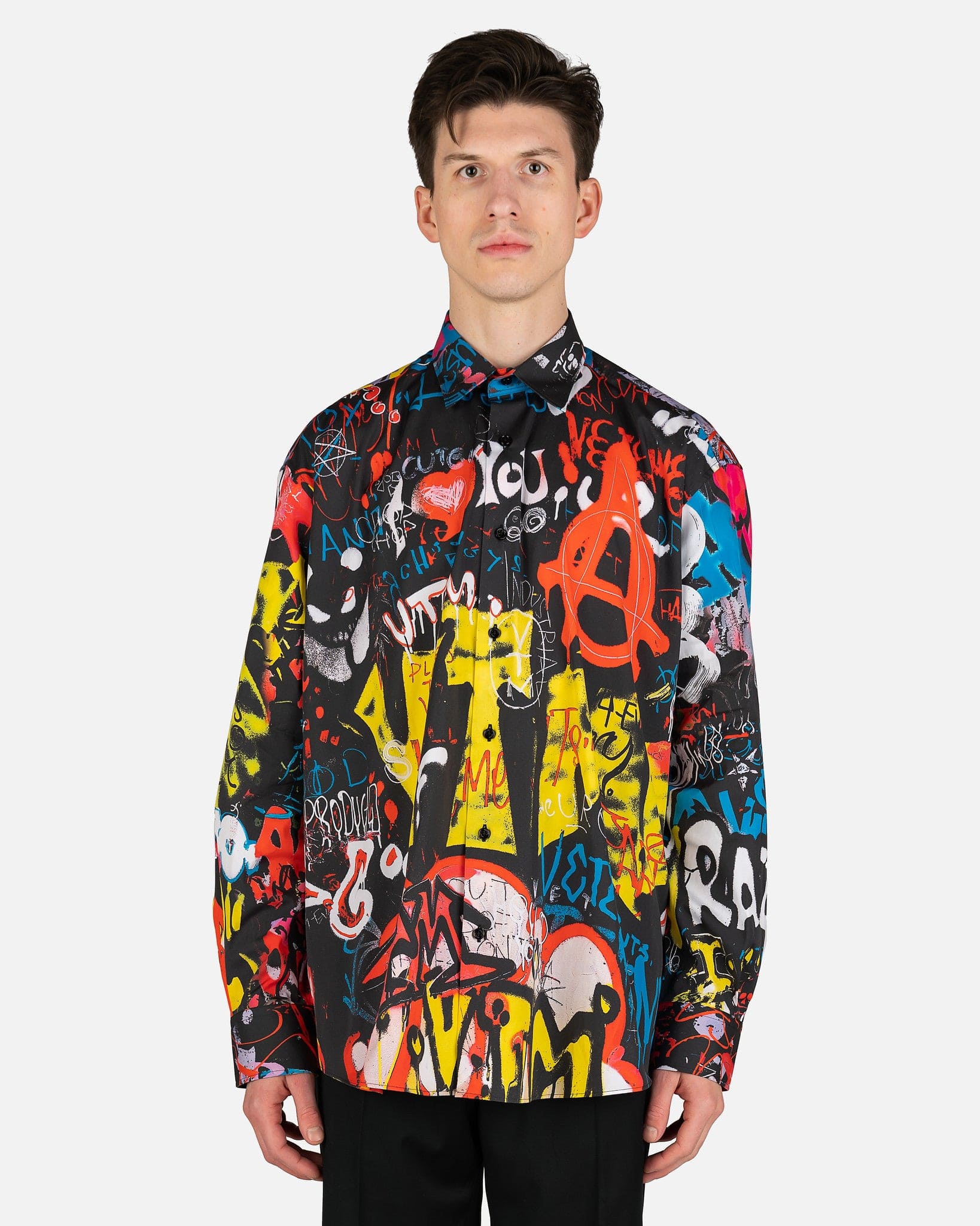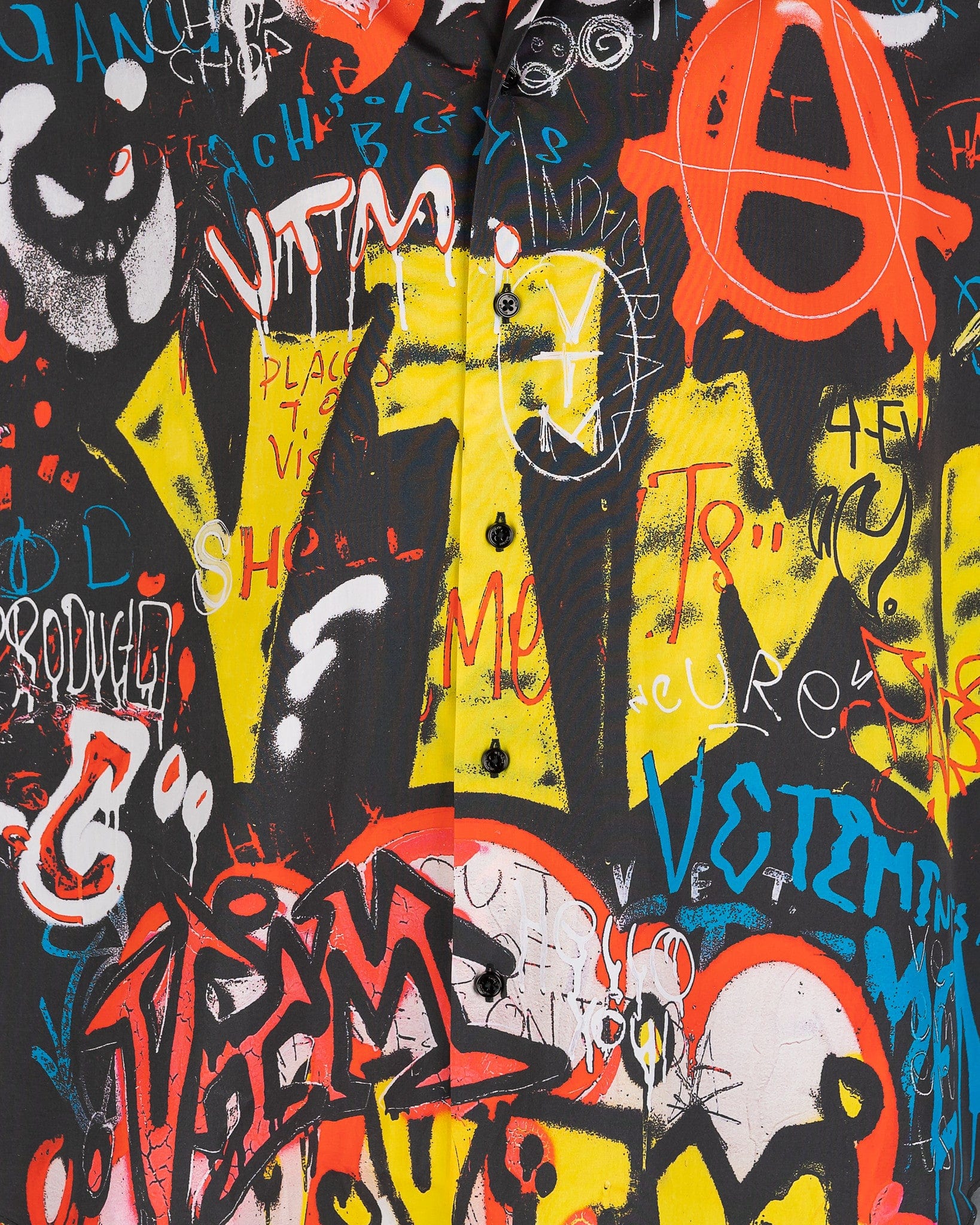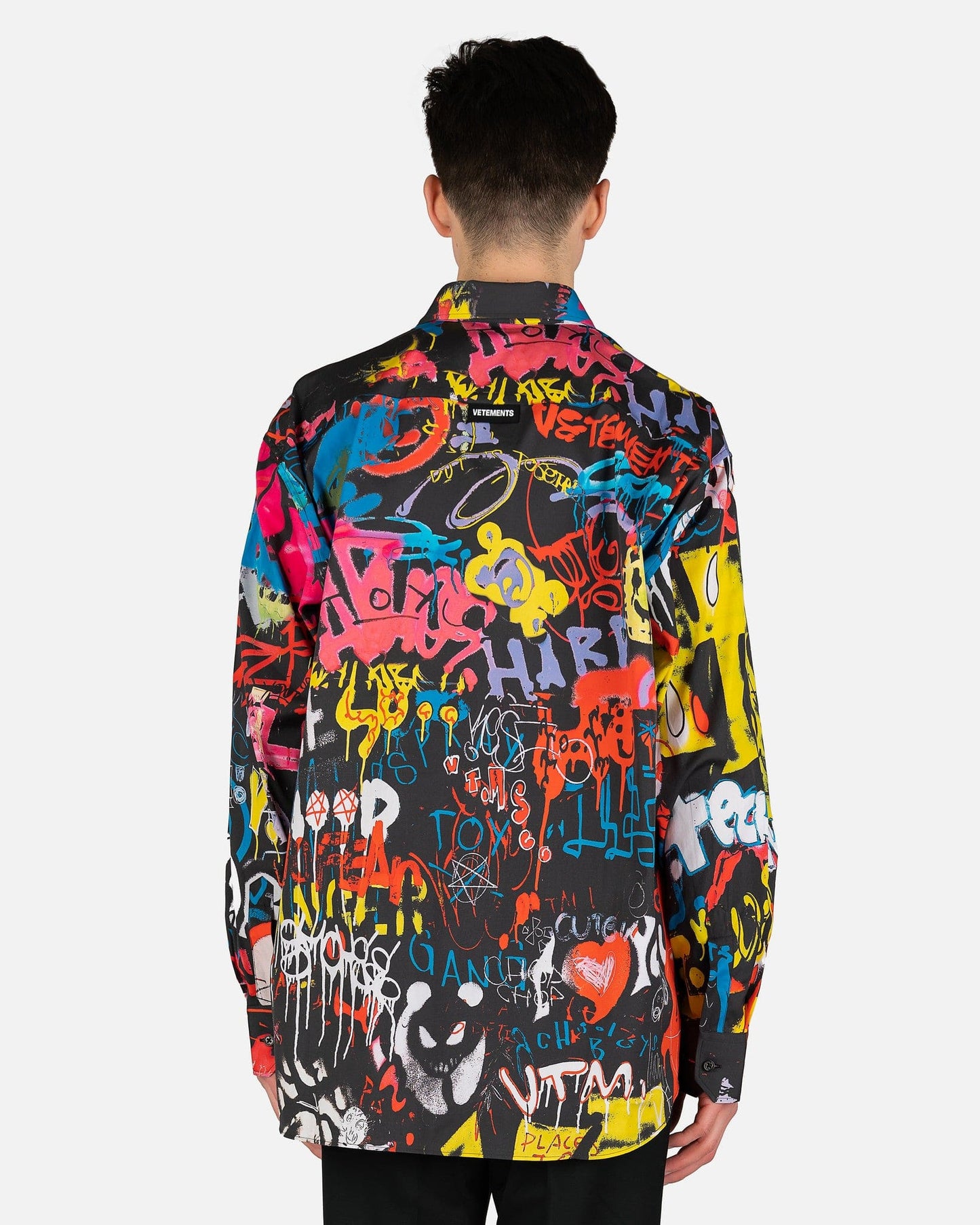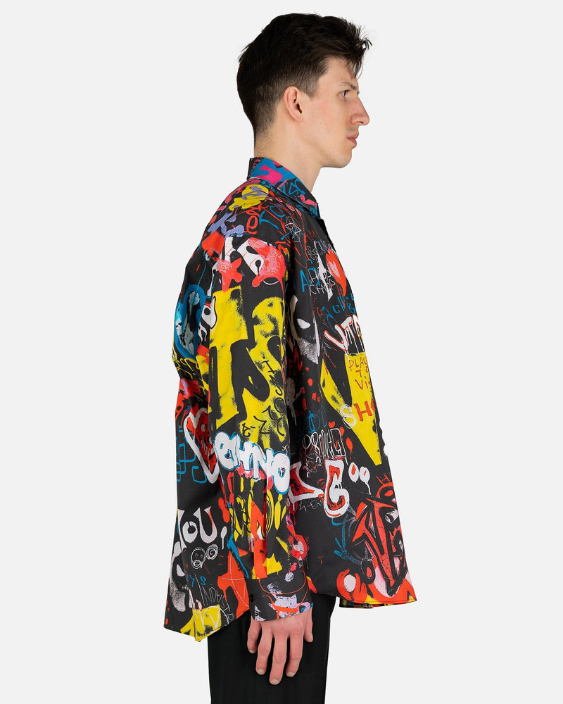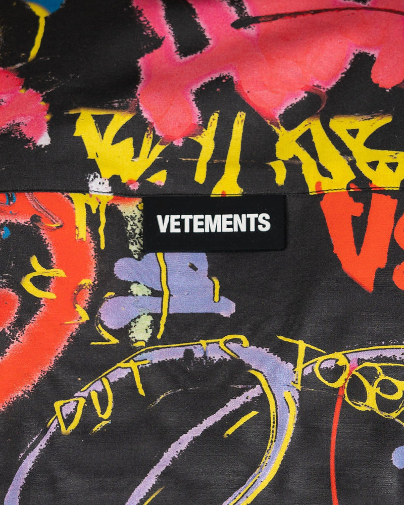 VETEMENTS men's black collared shirt with an allover graffiti print. This top features a spread collar and front button closure. The long sleeves possess barrel cuffs and the back has a VETEMENTS logo patch at the nape.