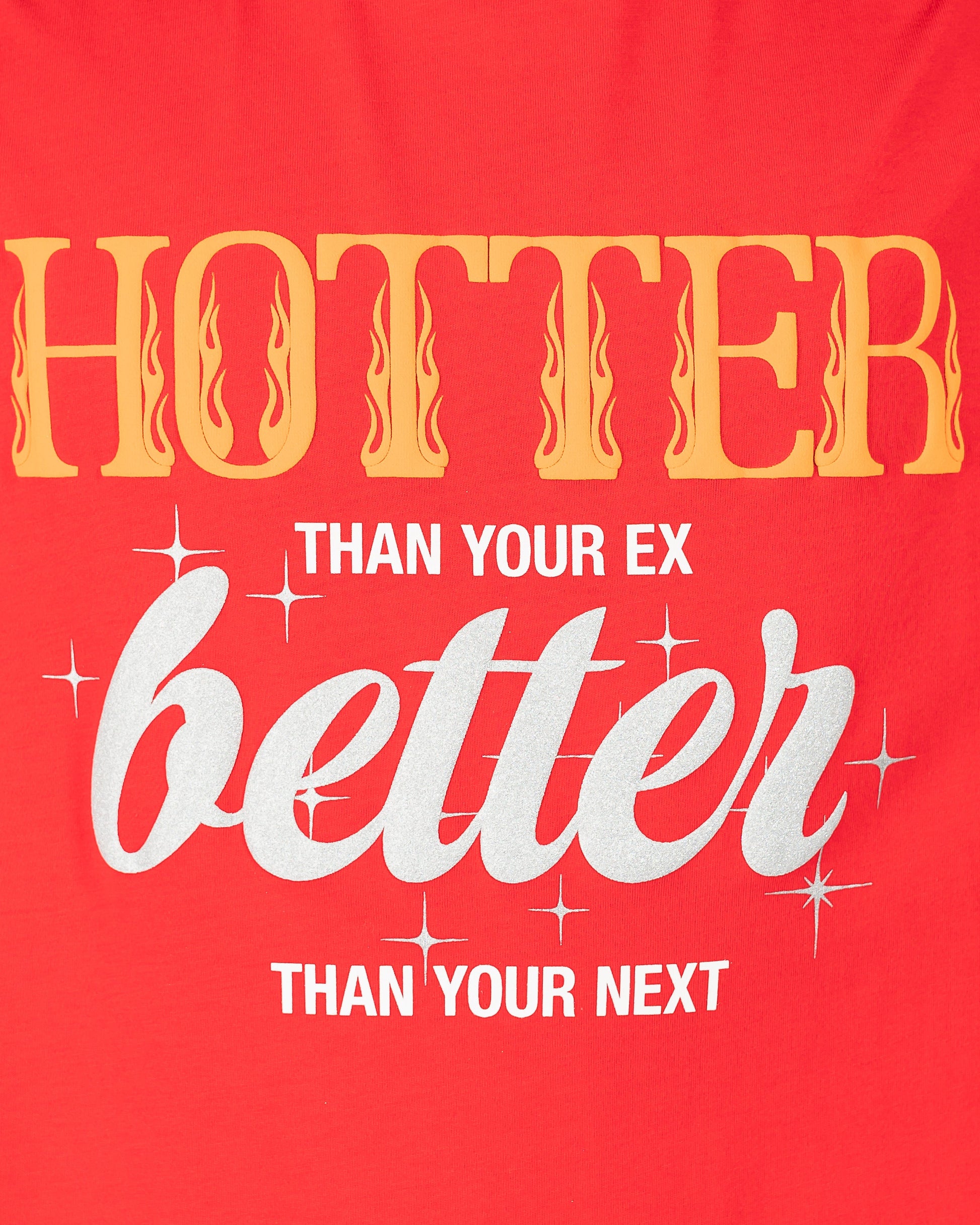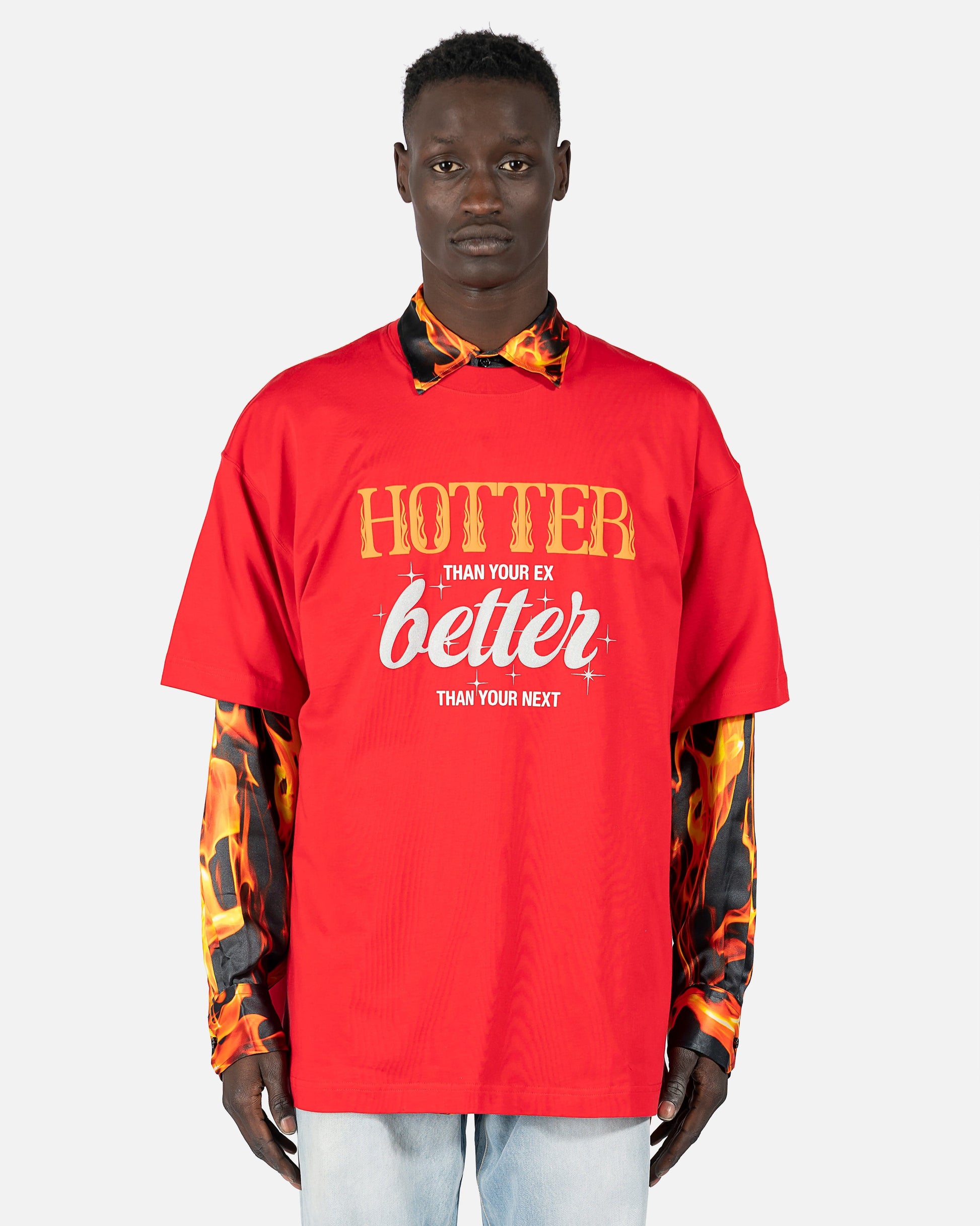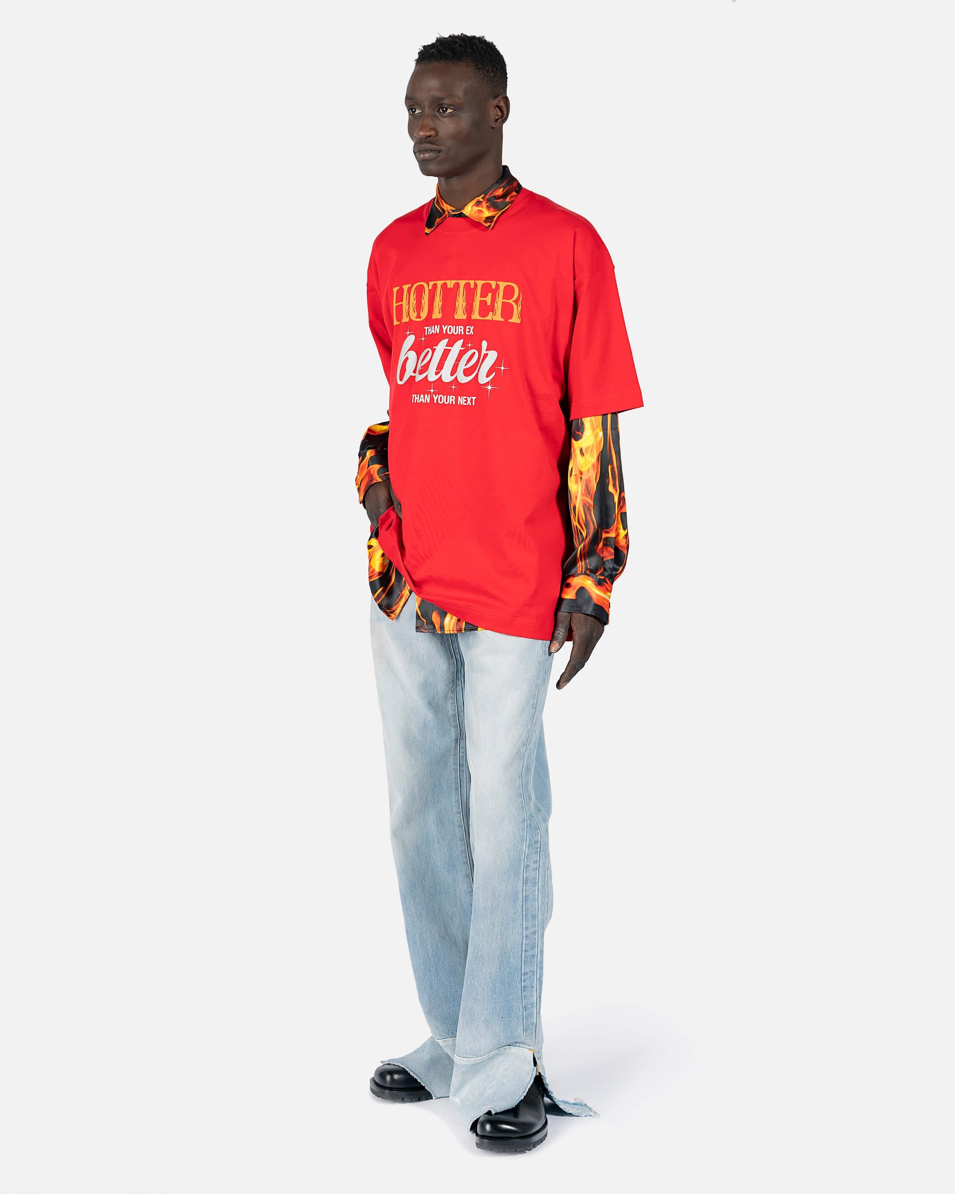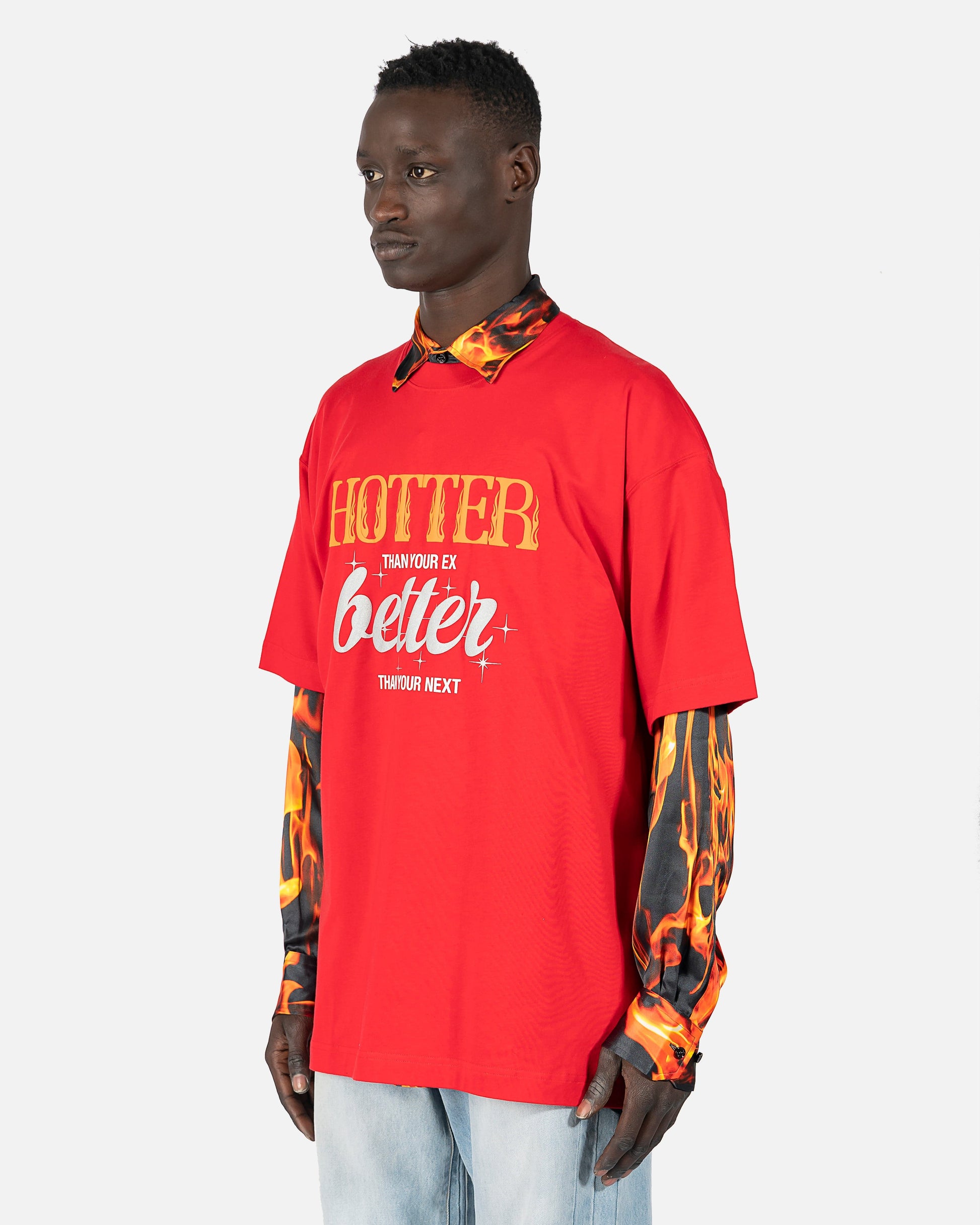 VETEMENTS men's oversized graphic t-shirt in red. This short sleeved t-shirt features screen printed text on the front reading "hotter than your ex better than your next" in stylized fonts. The back features a yellow flame graphic along the center.