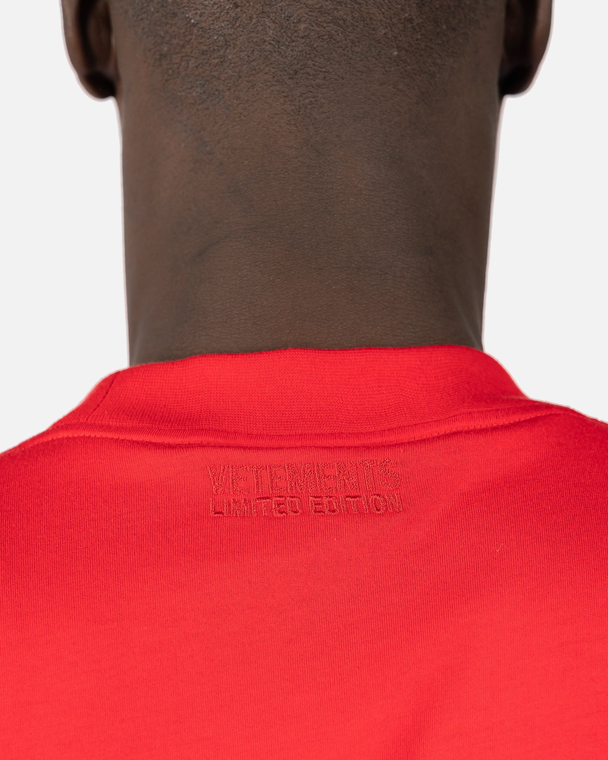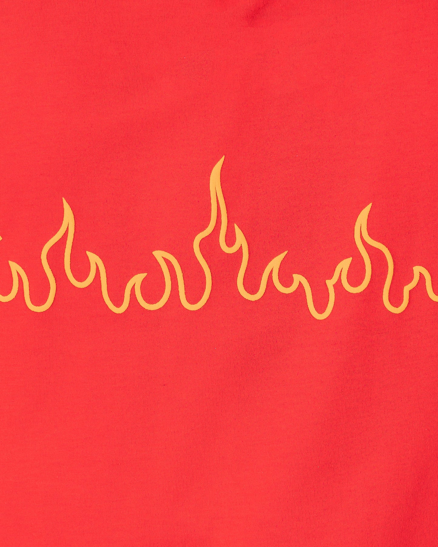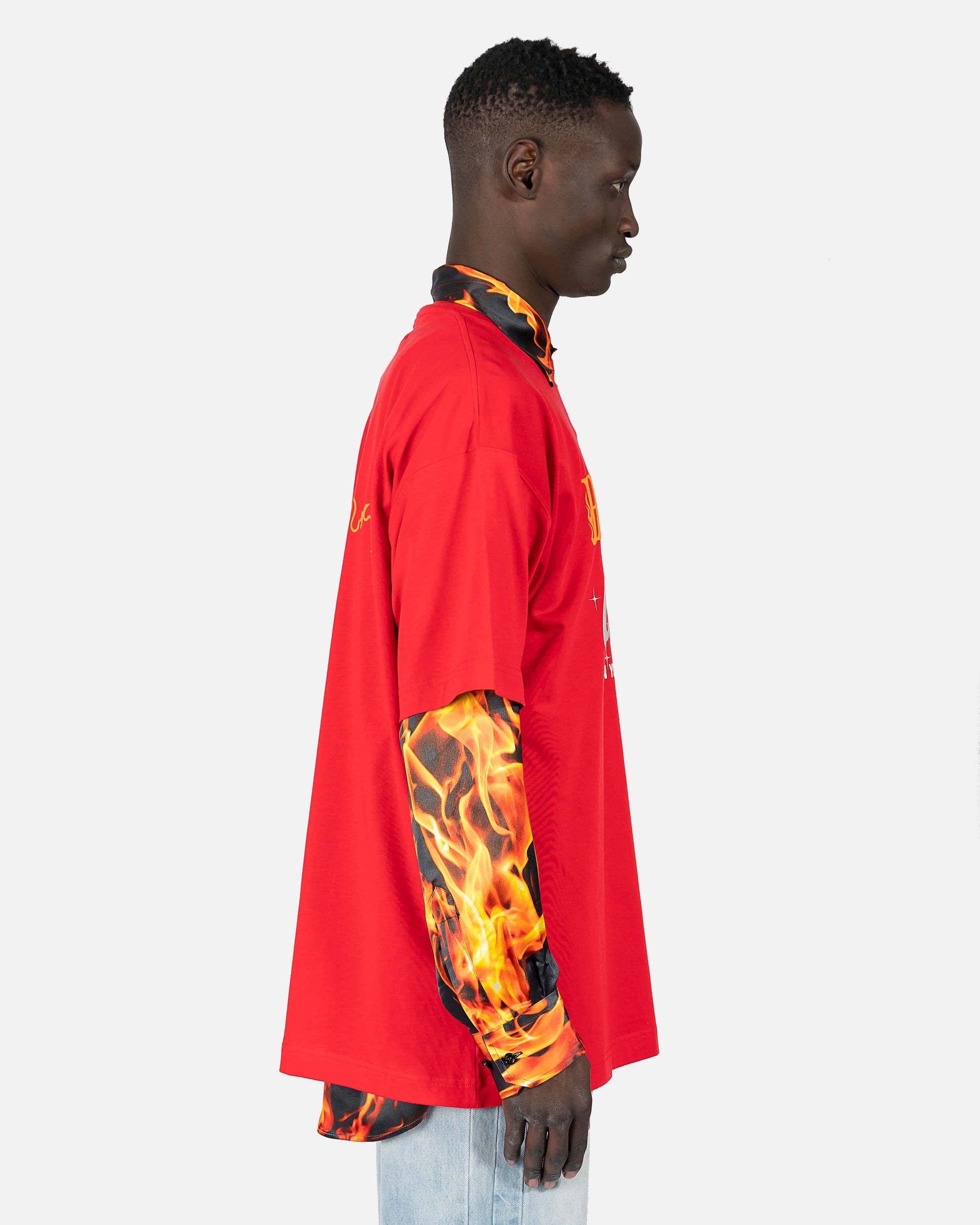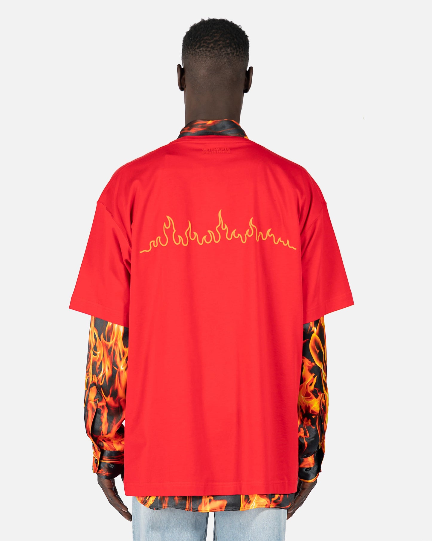VETEMENTS men's oversized graphic t-shirt in red. This short sleeved t-shirt features screen printed text on the front reading "hotter than your ex better than your next" in stylized fonts. The back features a yellow flame graphic along the center.