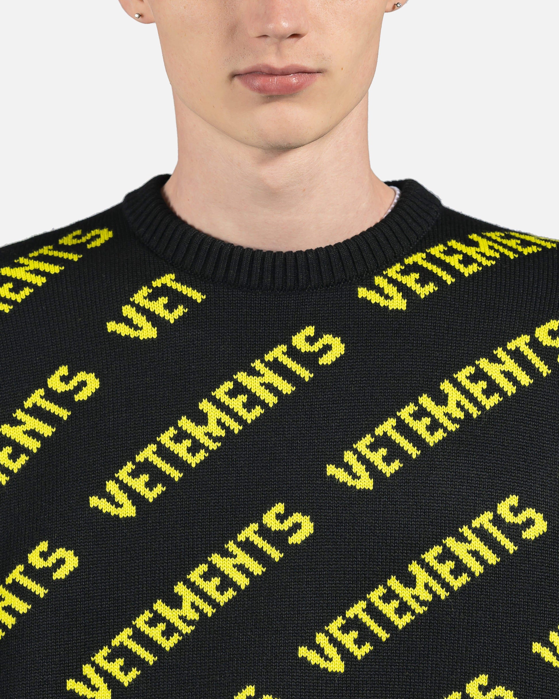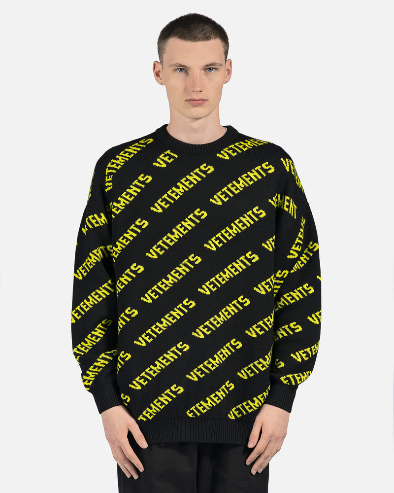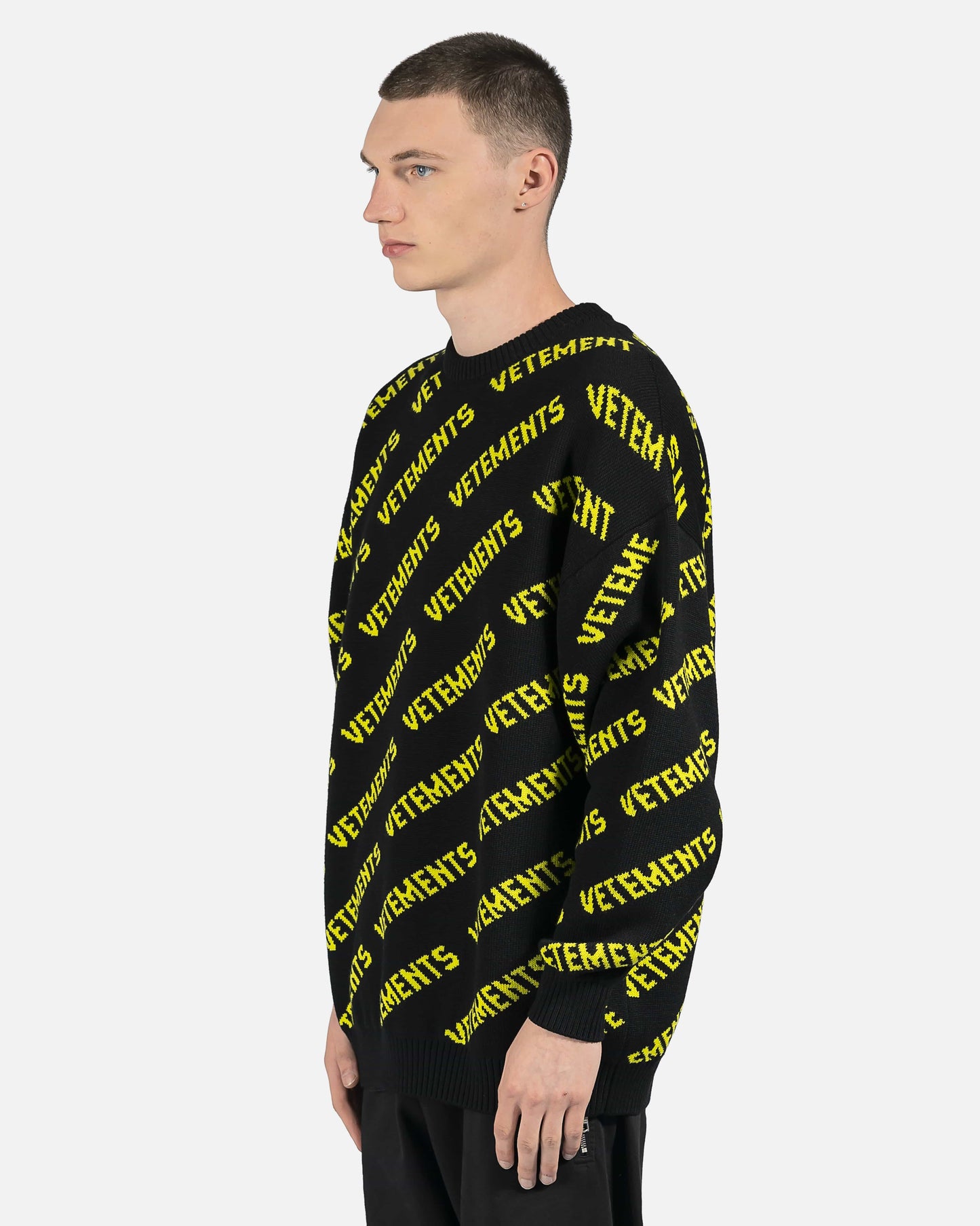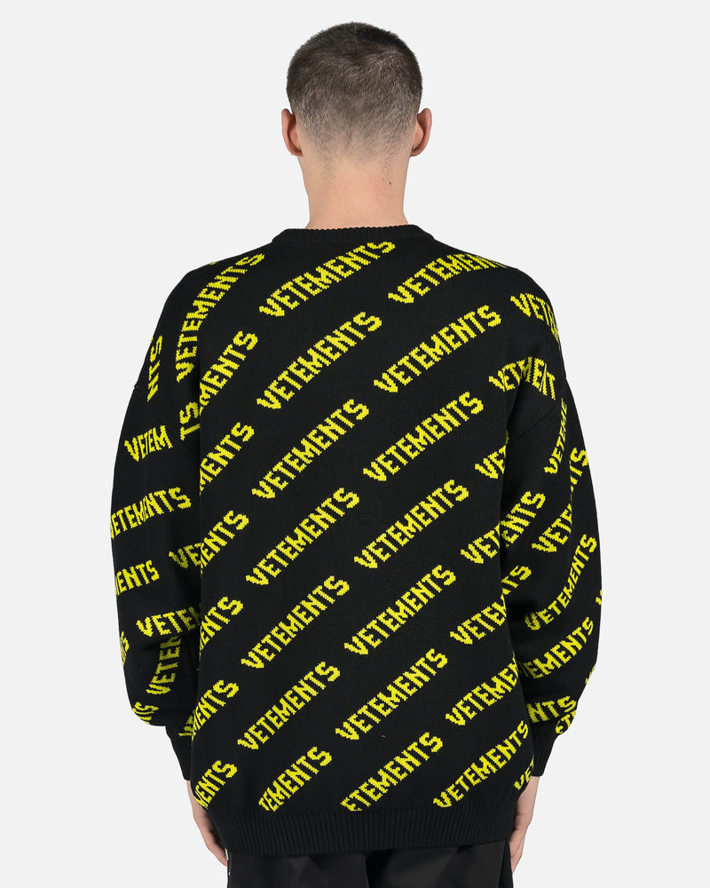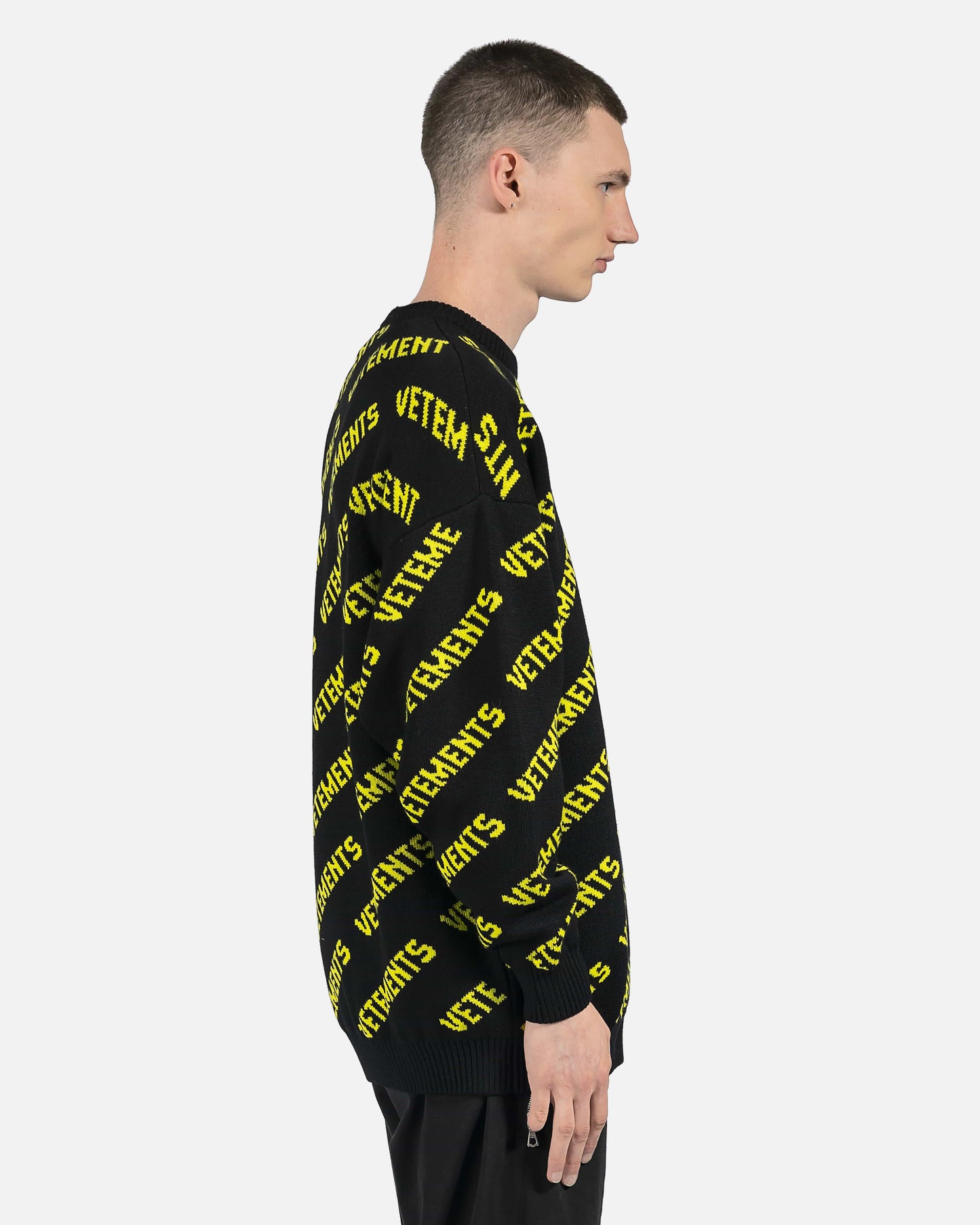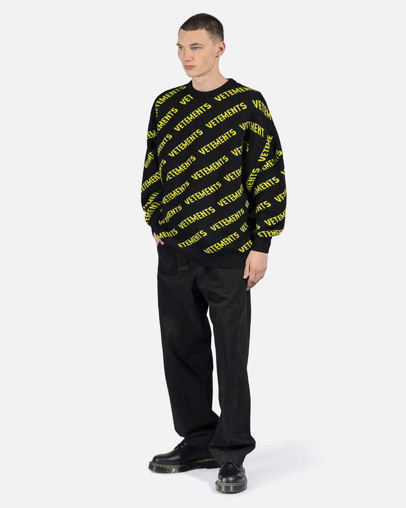Long sleeve knit merino wool sweater in black. Jacquard logo pattern knit in yellow throughout. Rib knit crewneck collar, cuffs, and hem.
