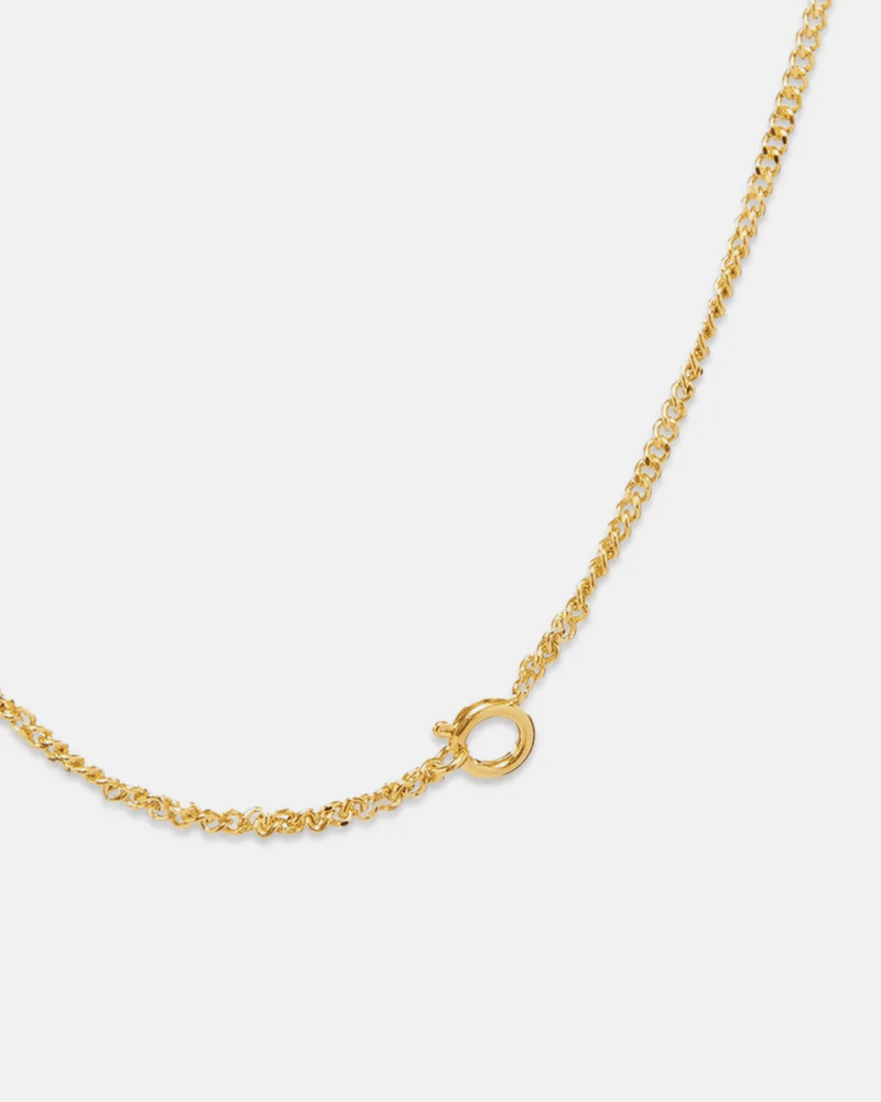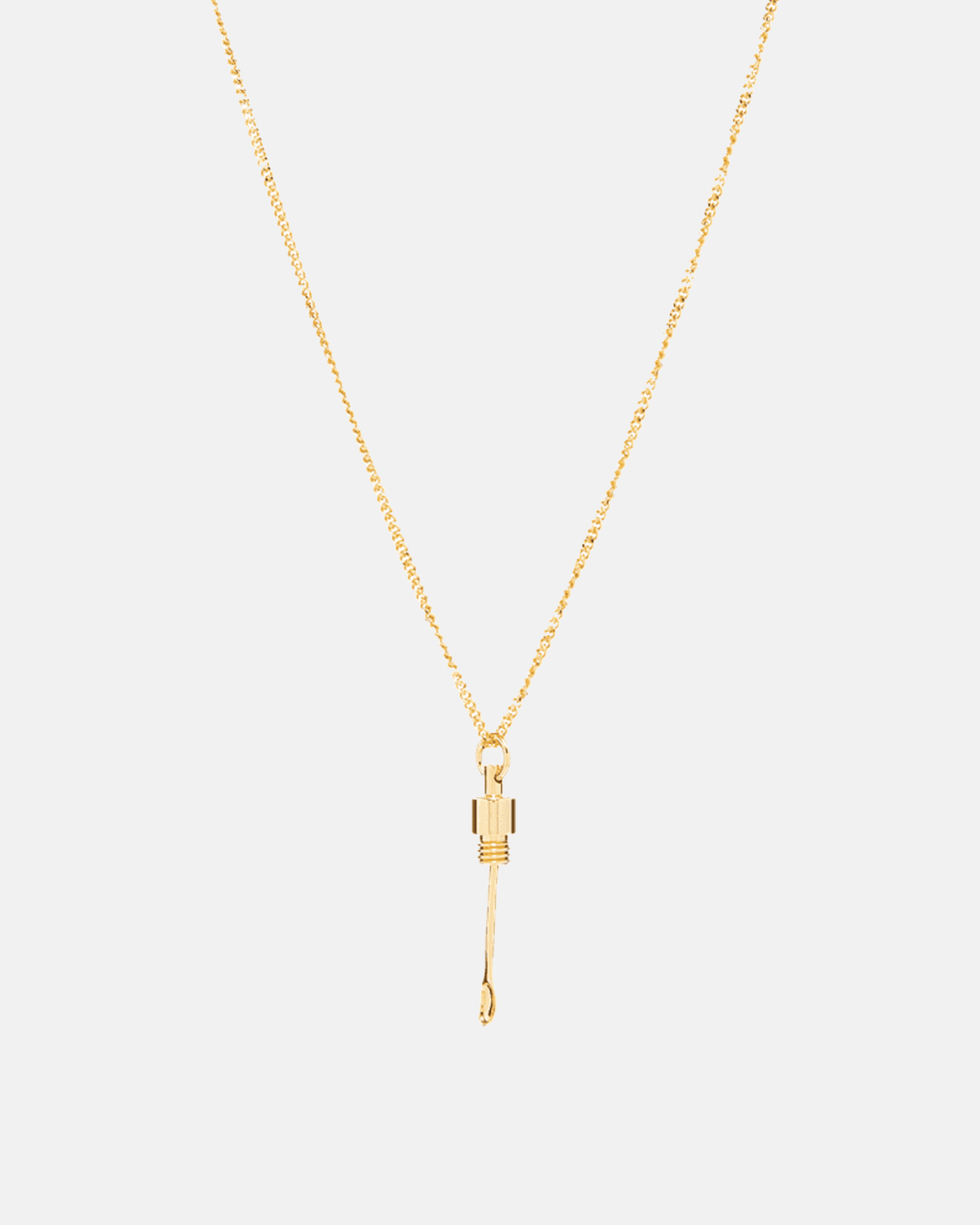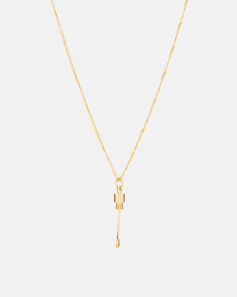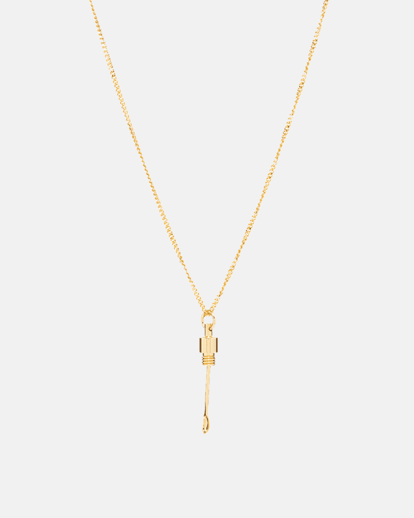 Curb chain necklace in gold-tone brass. Pendant at drop featuring concealed sculptural spoon hardware with screw-back fastening. Spring-ring fastening. Approx. 28" full length.