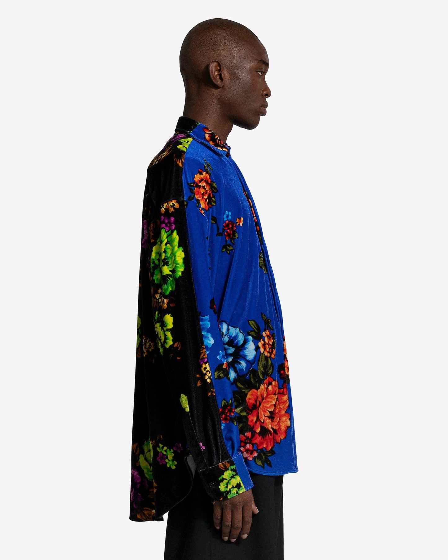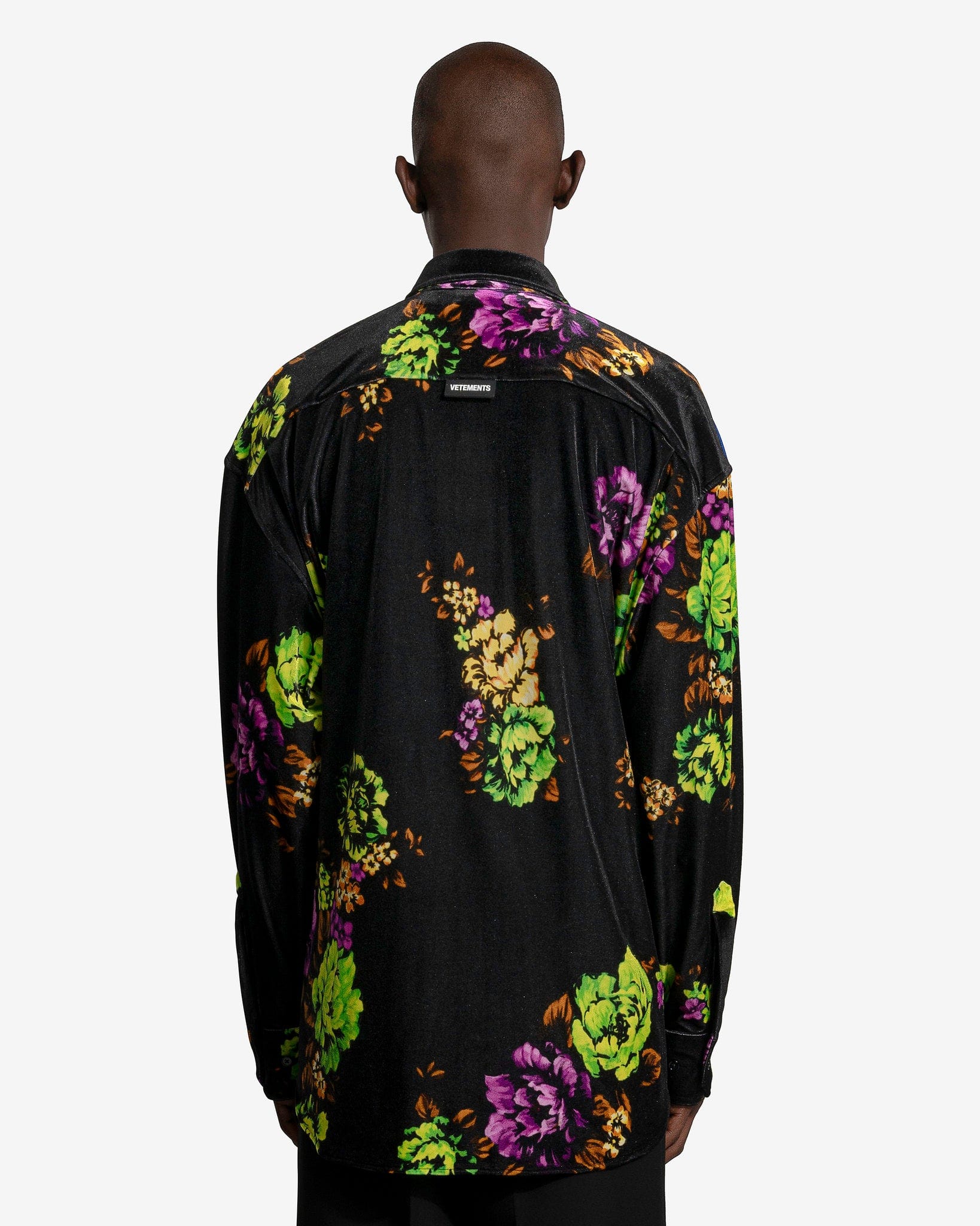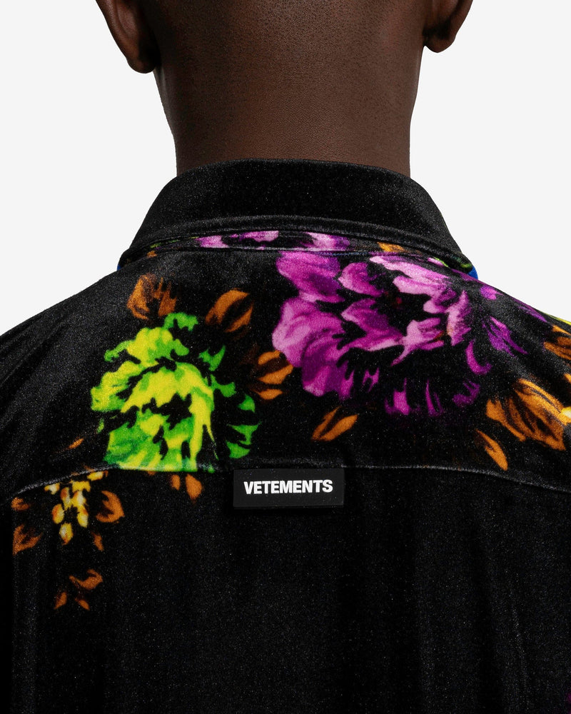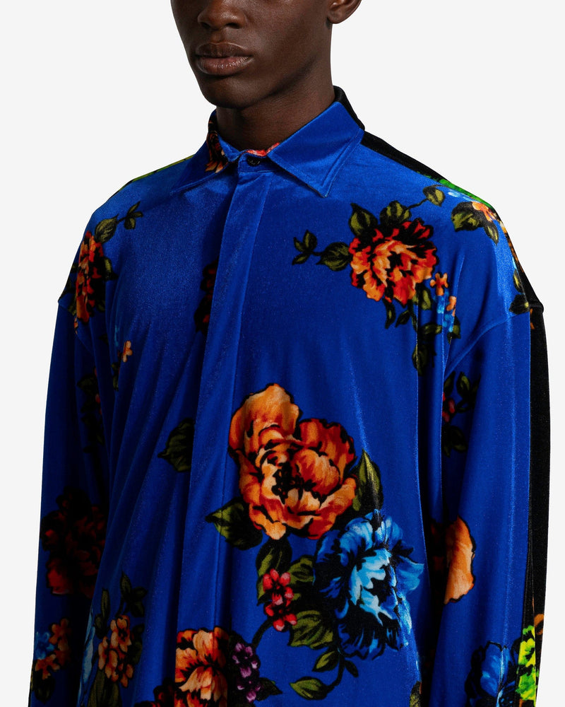 VETEMENTS men's floral velvet shirt in black and blue. This top features an allover floral print and inverted coloring on the back.