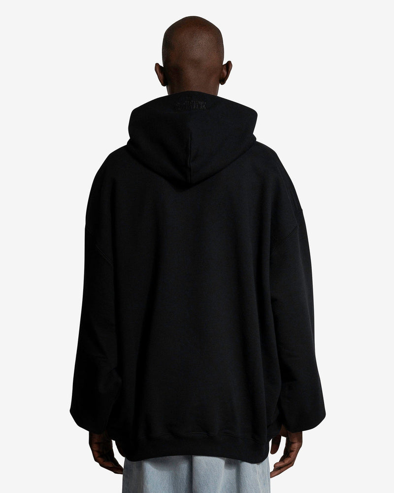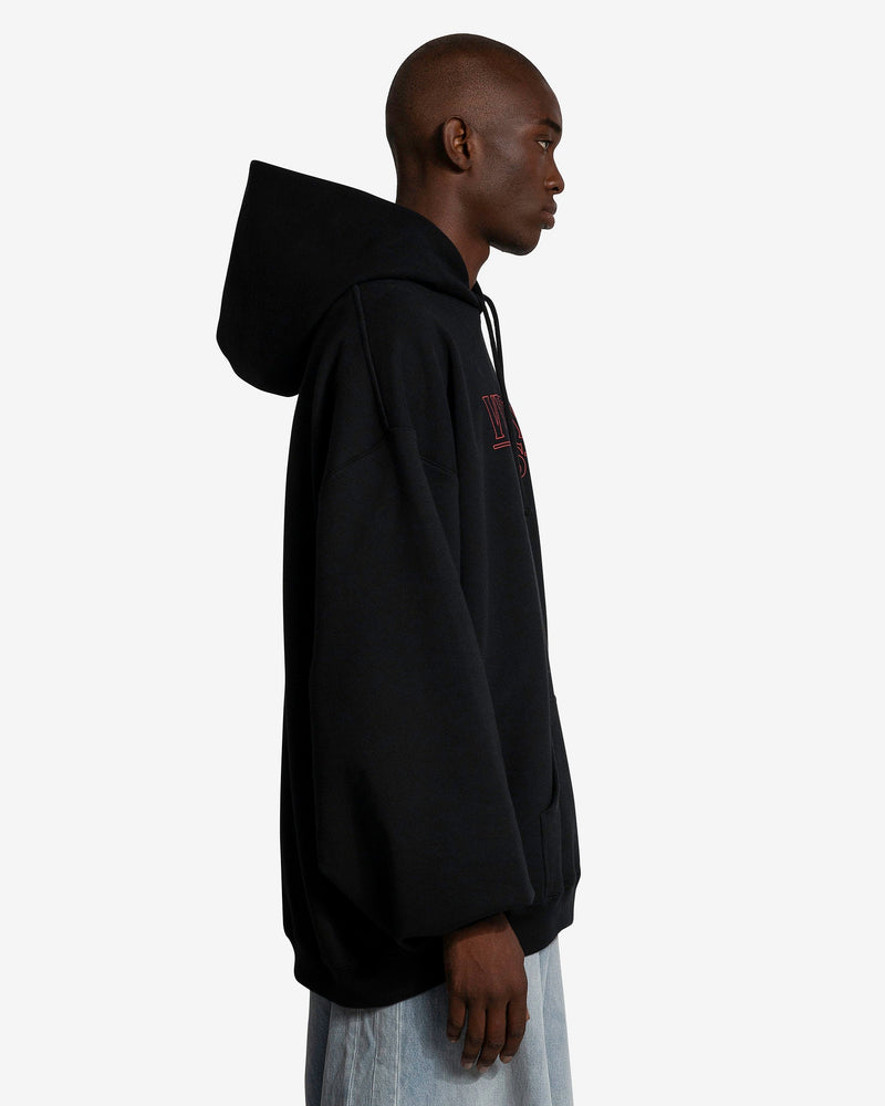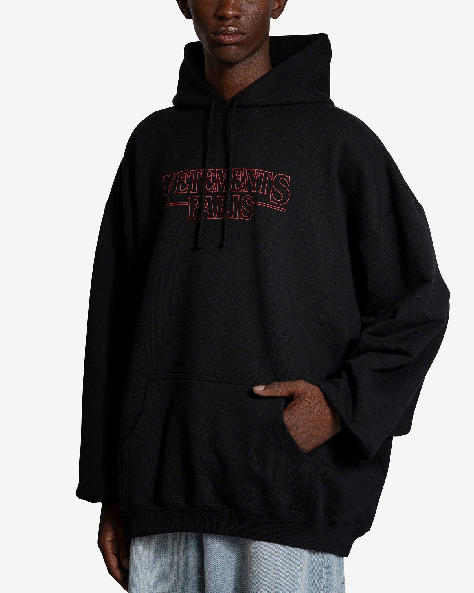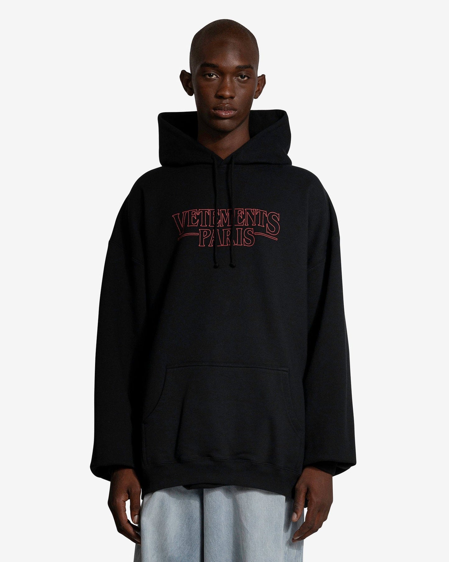 VETEMENTS men's logo graphic hoodie in black. This hoodie features the VETEMENTS Paris logo in a red, Stranger Things font.