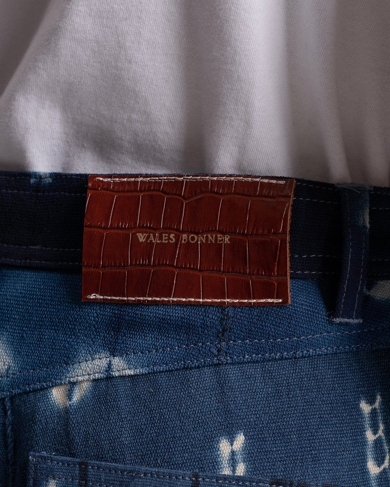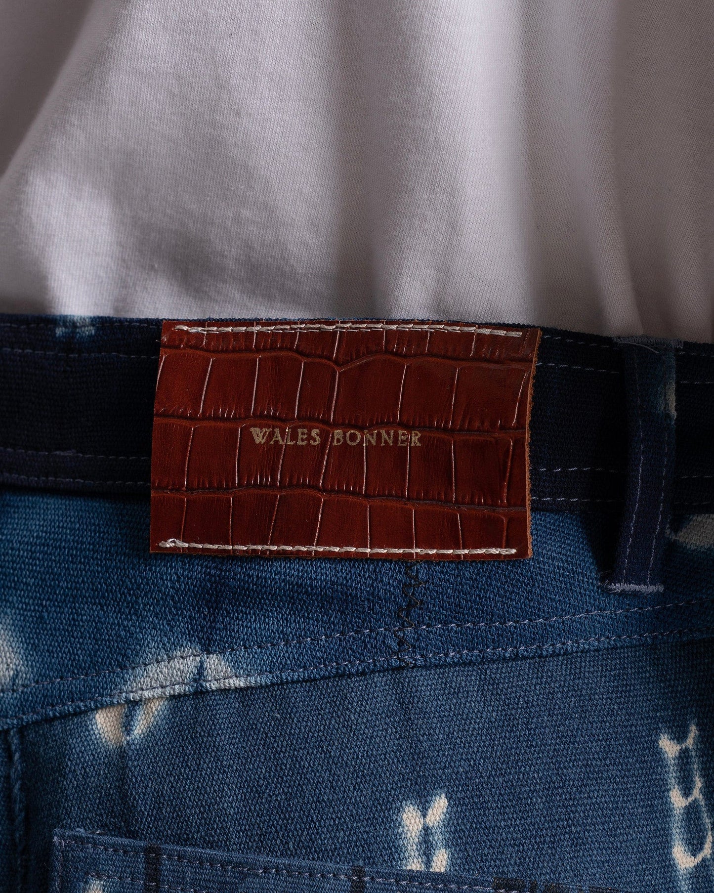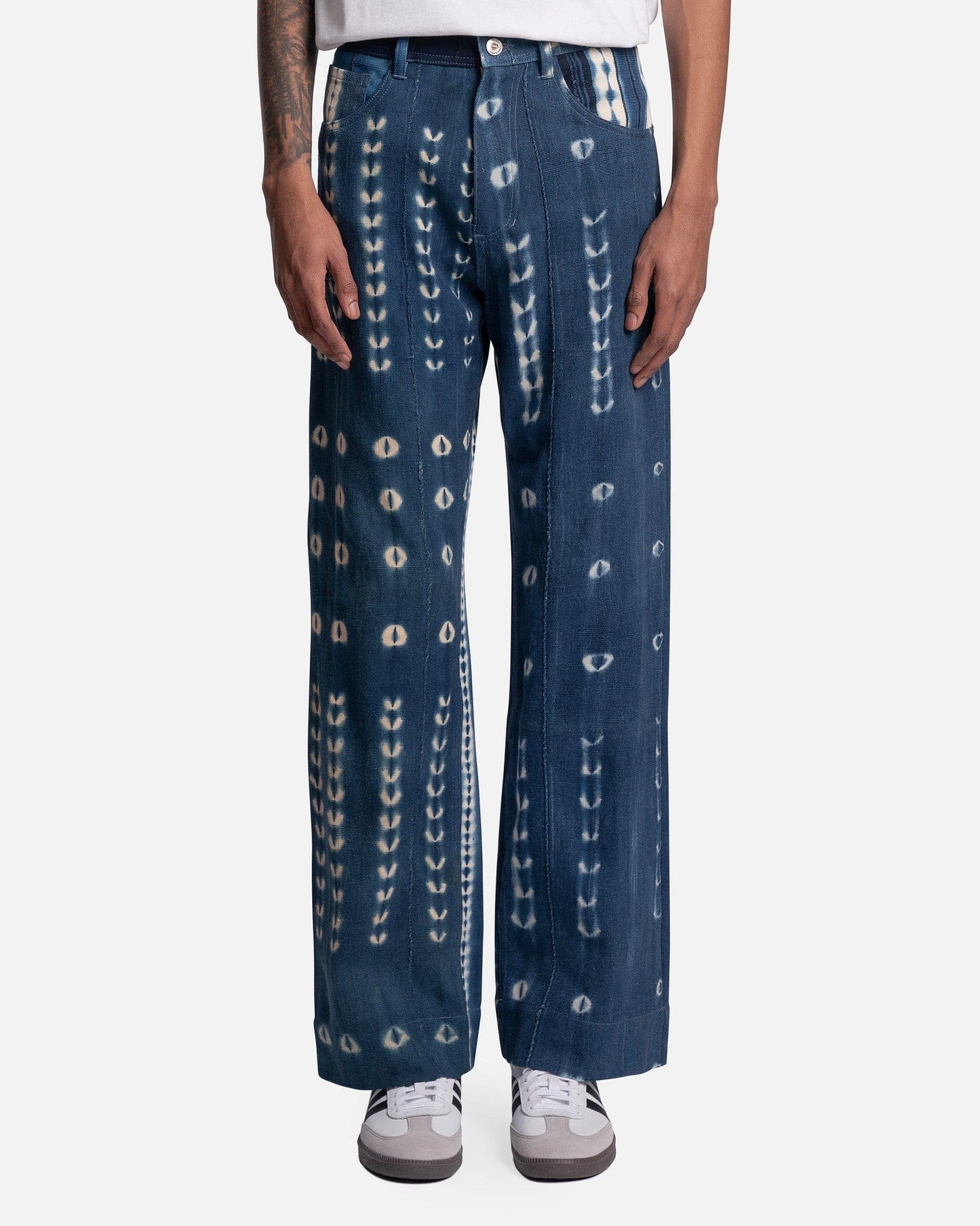 Wales Bonner men's tie-dyed jeans in blue and white. These pants feature a slightly wide leg silhouette and have a white spotted tie-dye print throughout the body.