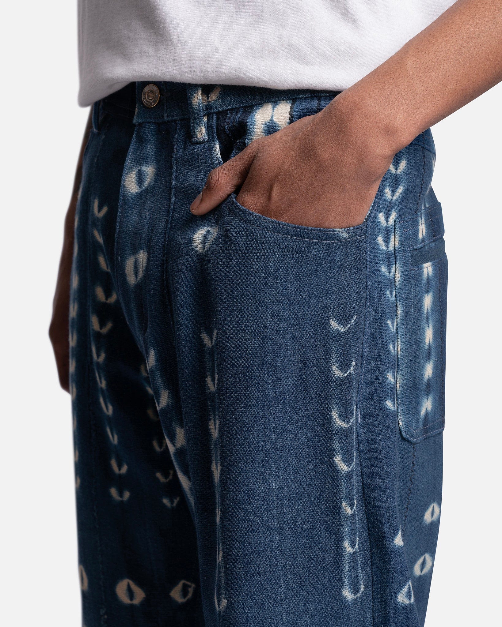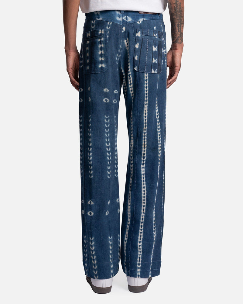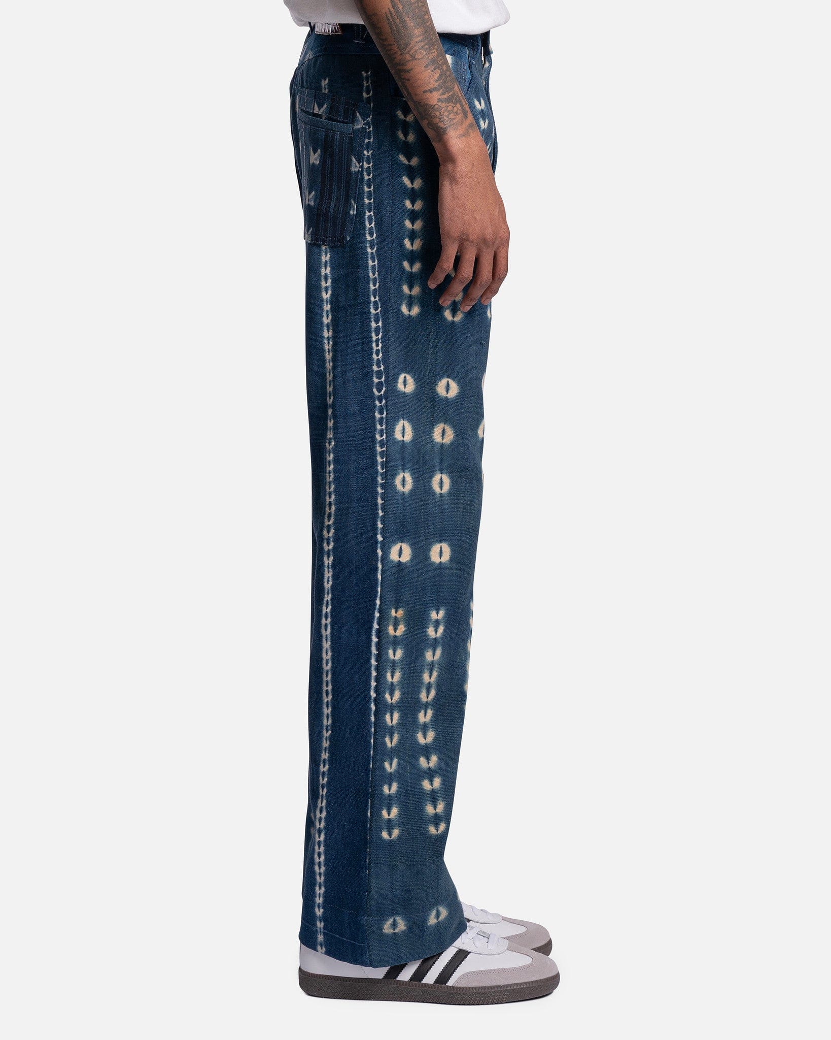 Wales Bonner men's tie-dyed jeans in blue and white. These pants feature a slightly wide leg silhouette and have a white spotted tie-dye print throughout the body.