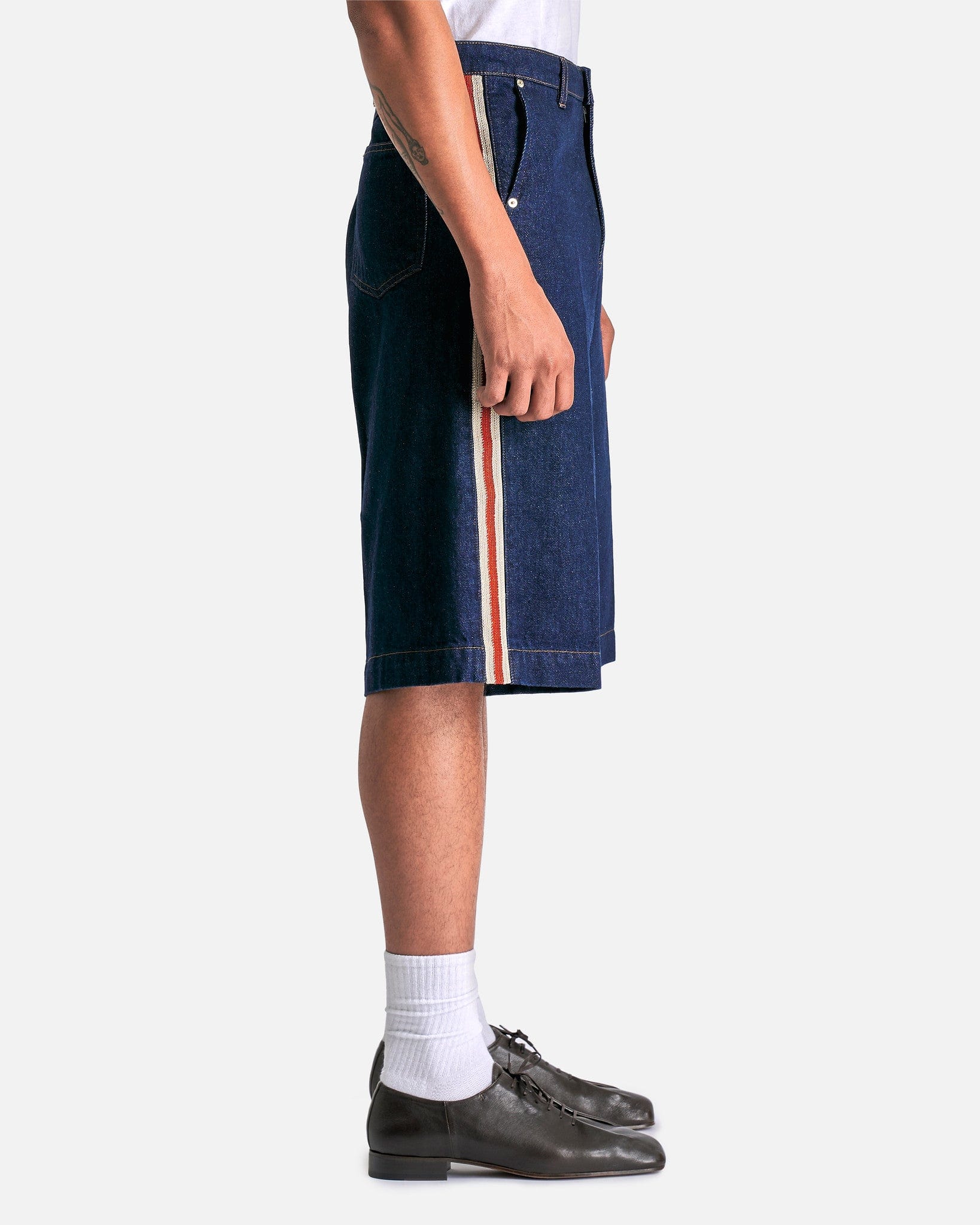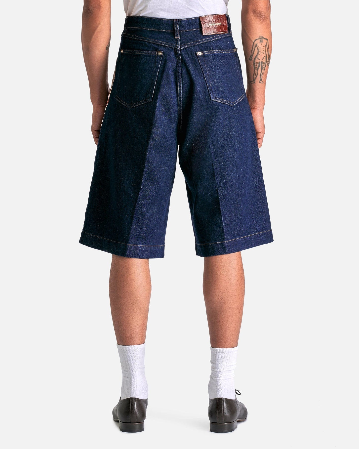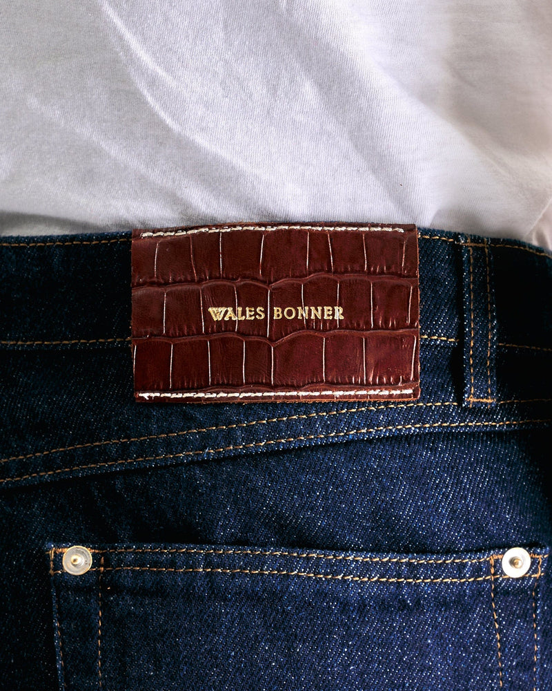 Wales Bonner Shadow Denim Shorts in Deep Blue. These shorts feature a zip fly with button closure, 4-pocket styling, woven trim at the outseams and a leather logo patch at the back waist.