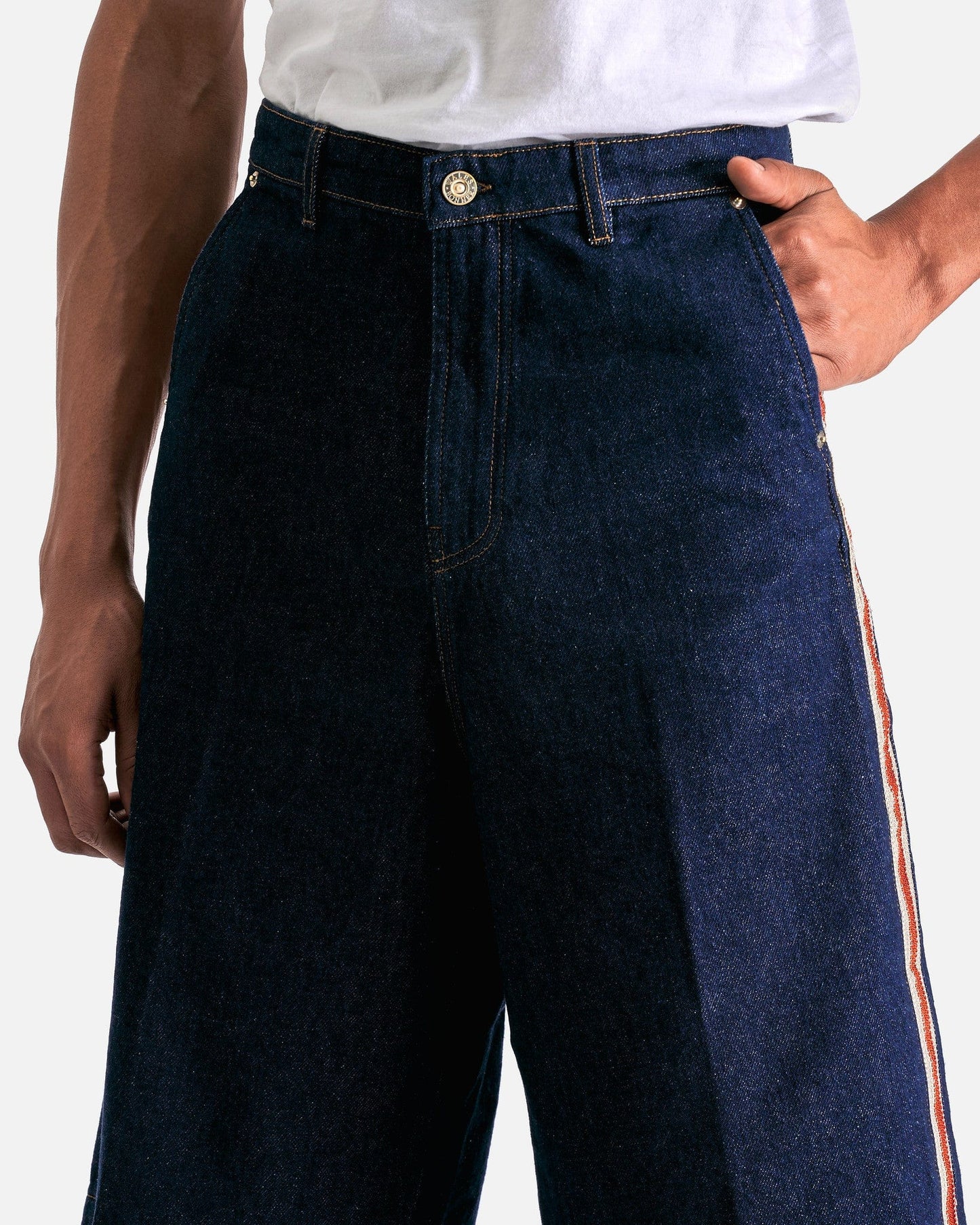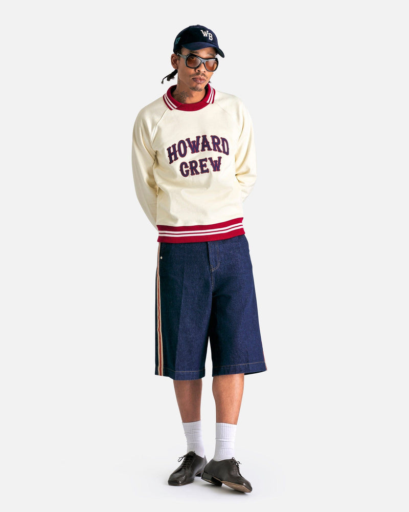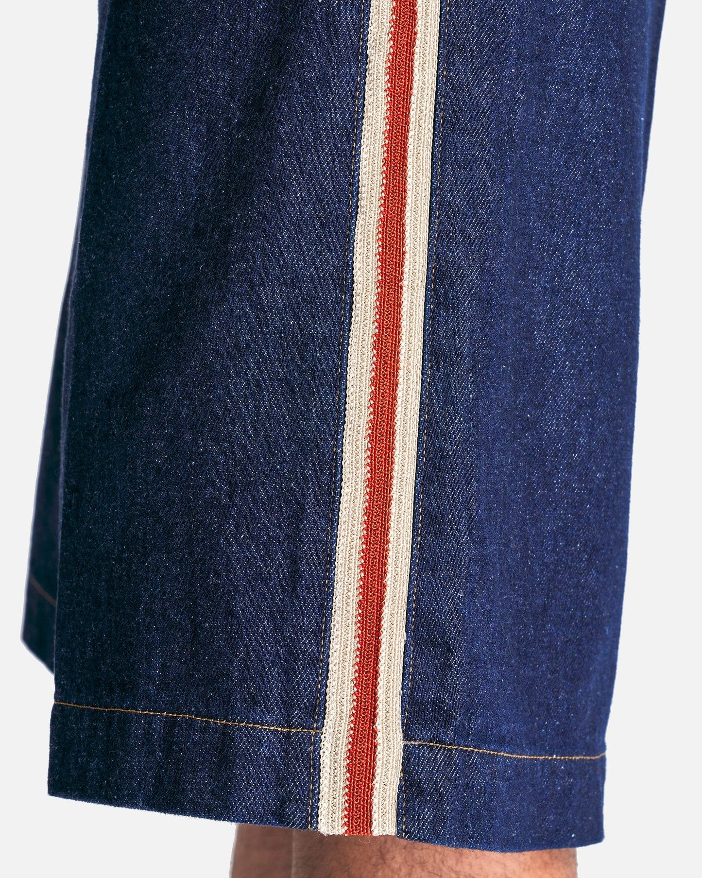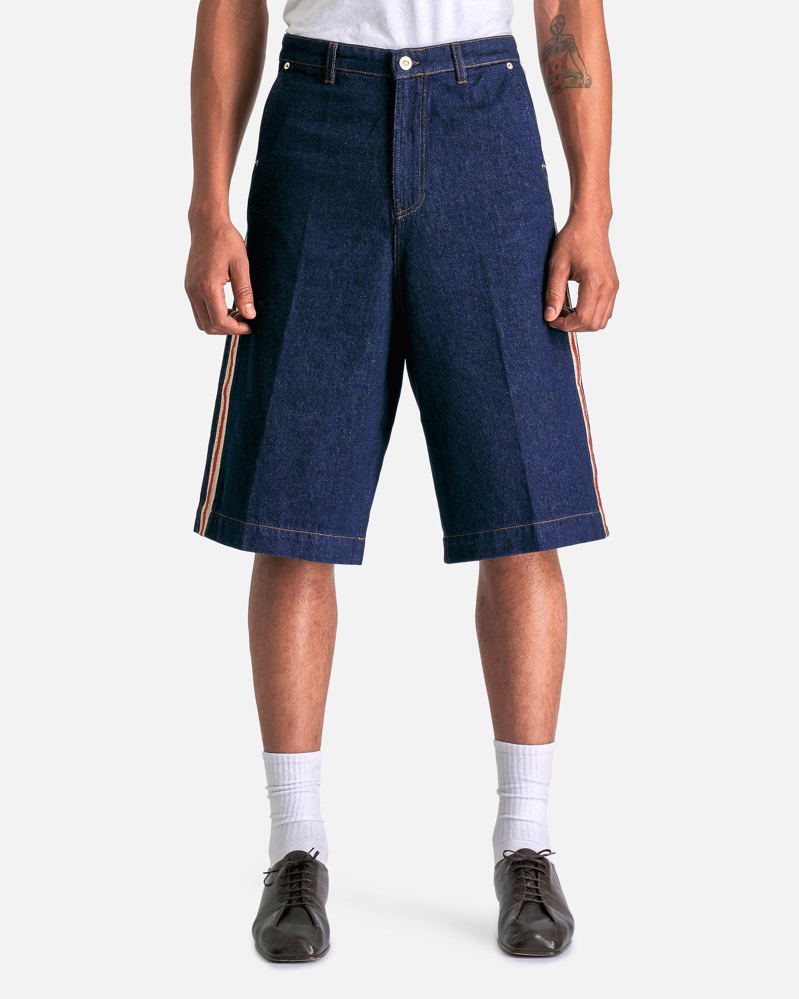 Wales Bonner Shadow Denim Shorts in Deep Blue. These shorts feature a zip fly with button closure, 4-pocket styling, woven trim at the outseams and a leather logo patch at the back waist.