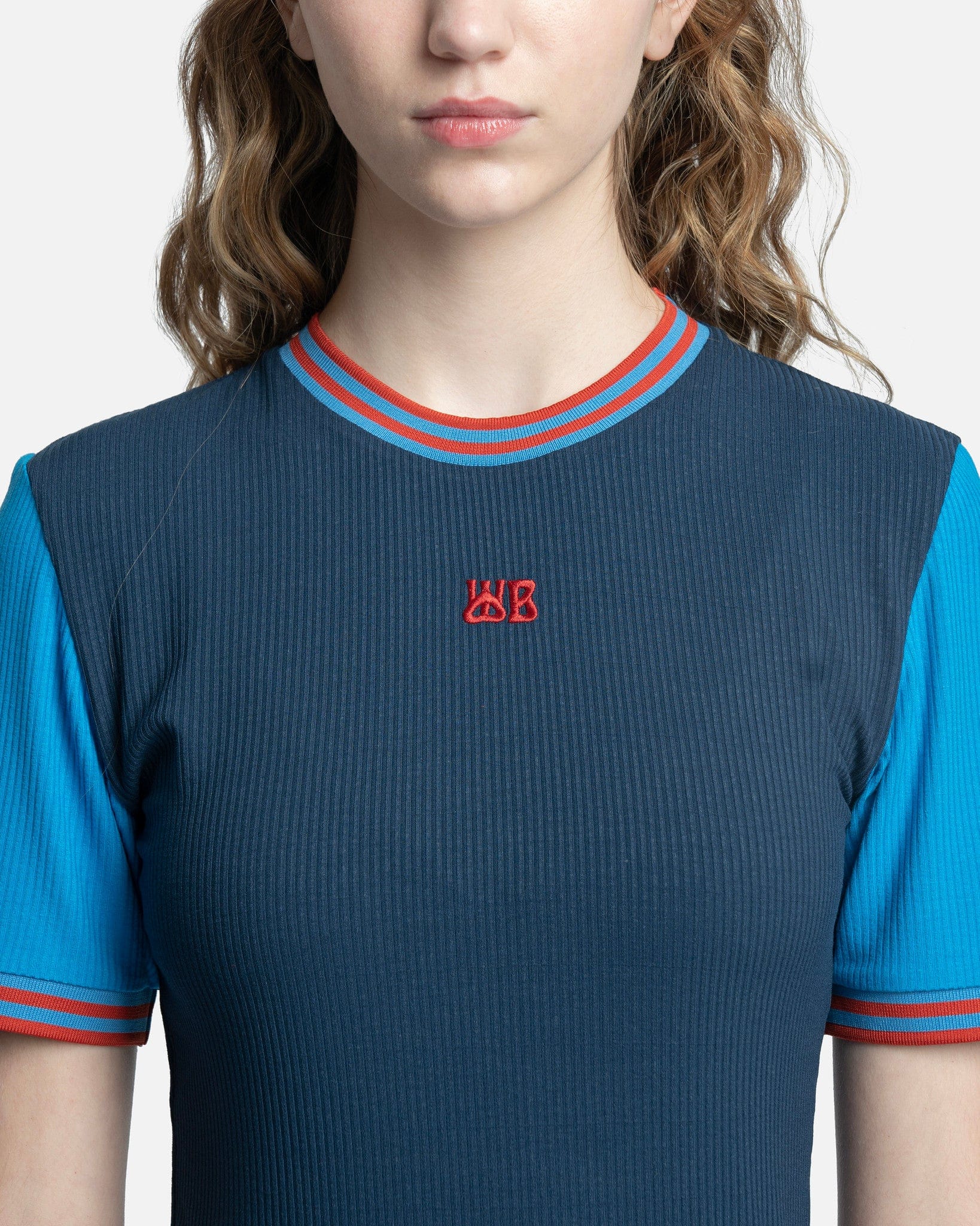 Wales Bonner women's t-shirt in navy. This shirt features logo embroidery at the chest and contrasting light blue sleeves.