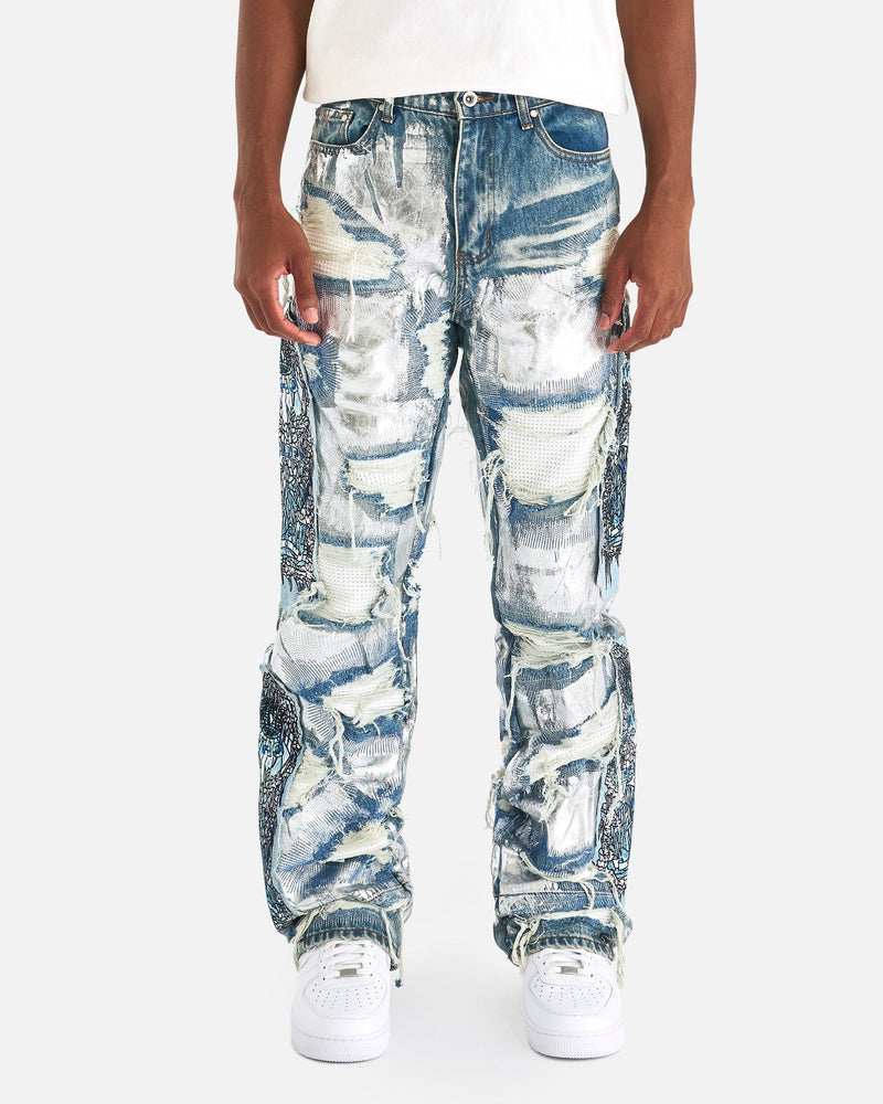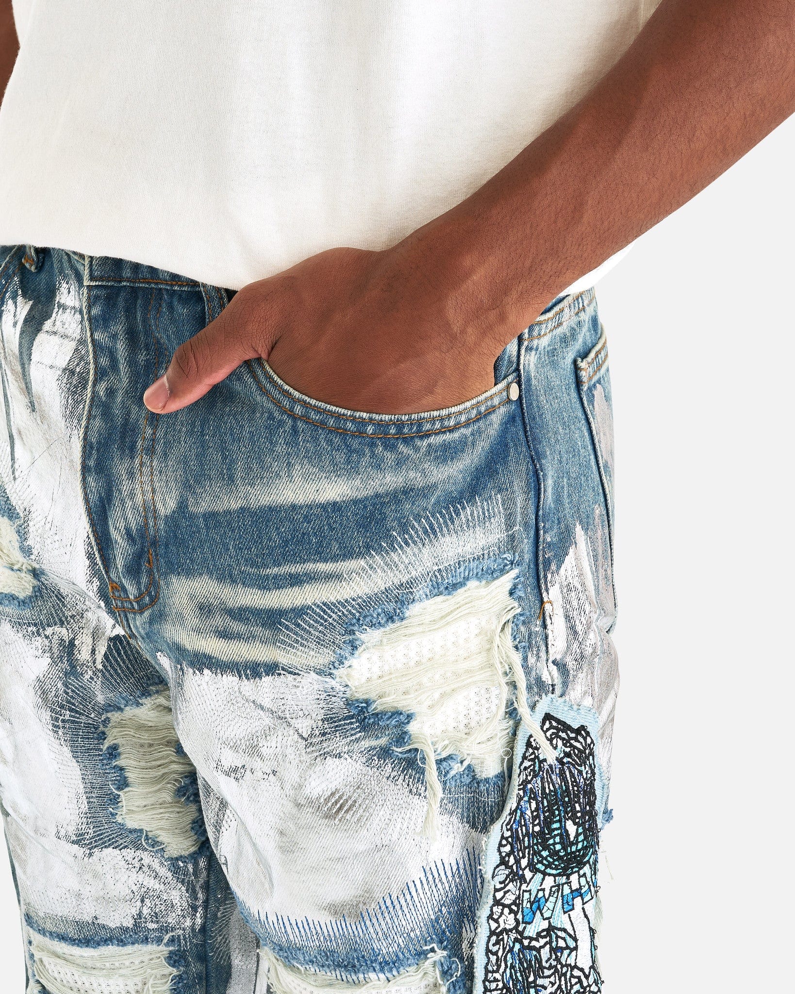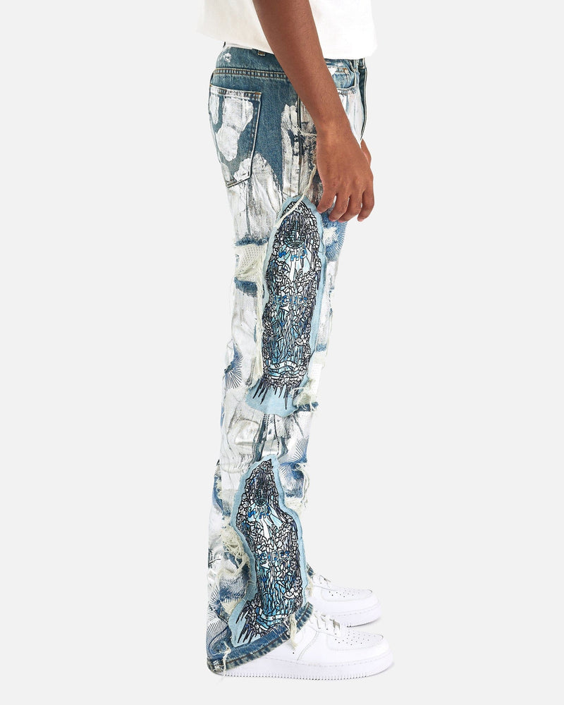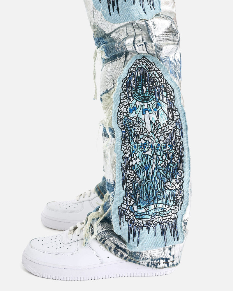 Who Decides War men's distressed denim pants in blue and white. These pants feature distressed, ripped and worn down details throughout the body with stained glass logo embroidery down the legs.