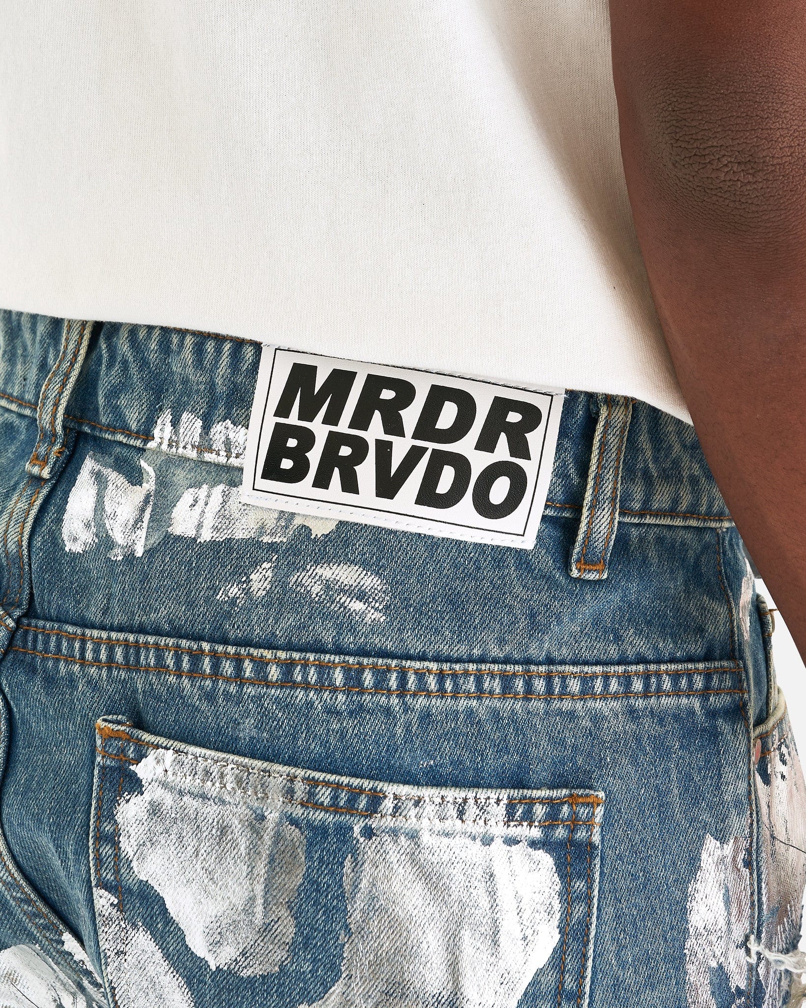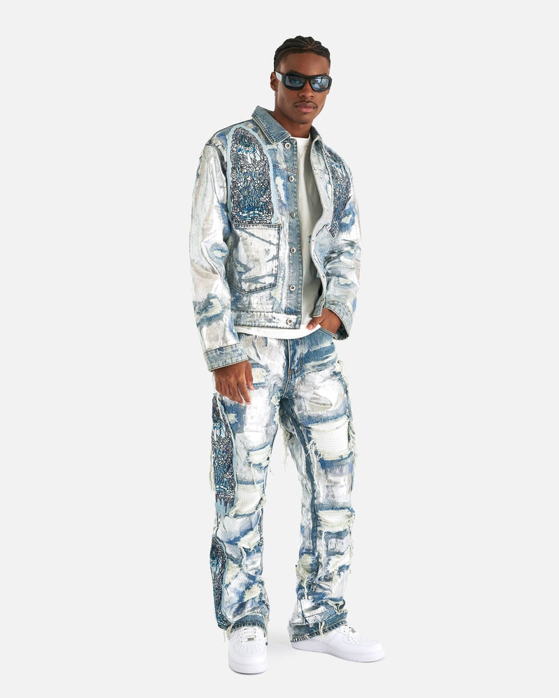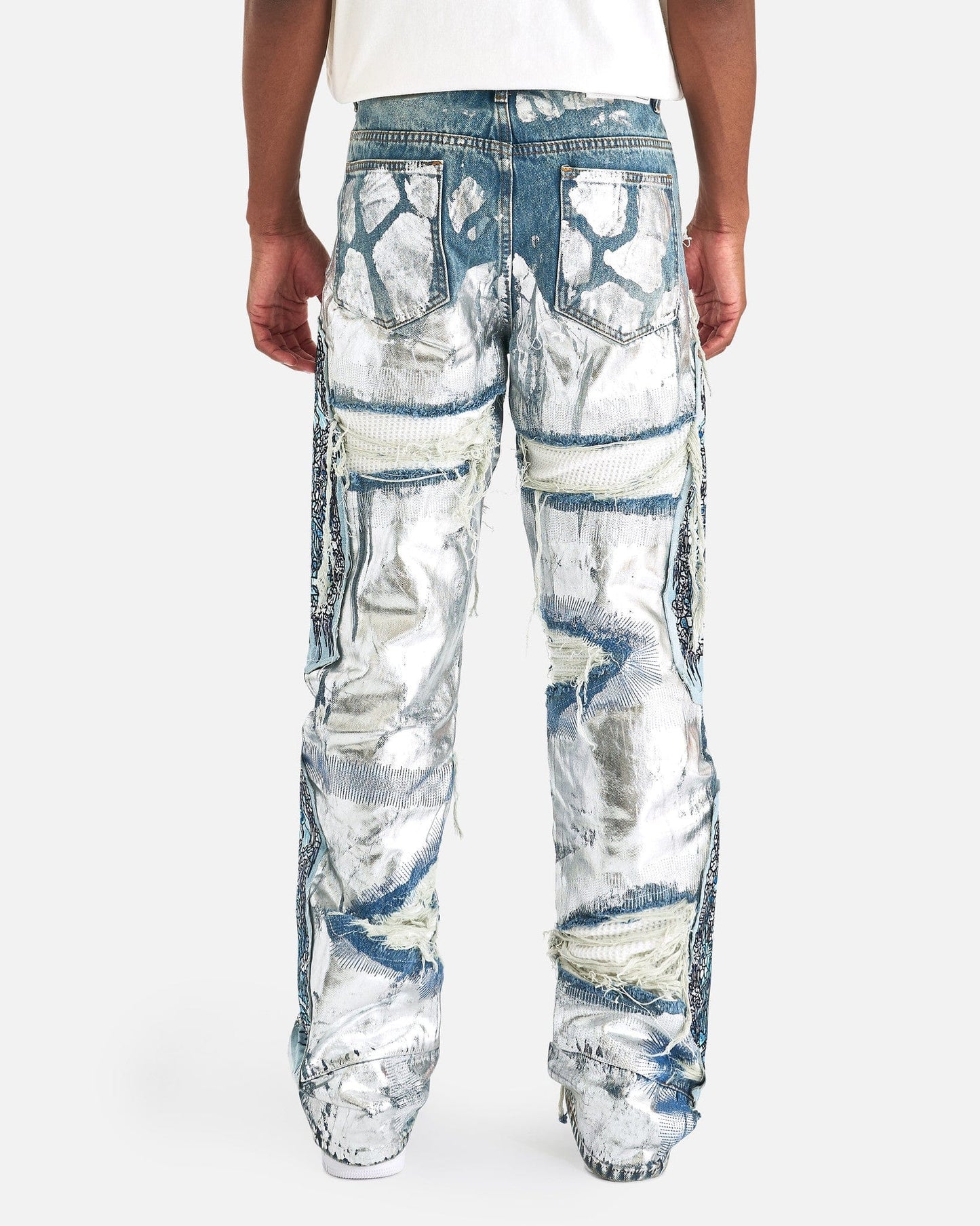 Who Decides War men's distressed denim pants in blue and white. These pants feature distressed, ripped and worn down details throughout the body with stained glass logo embroidery down the legs.