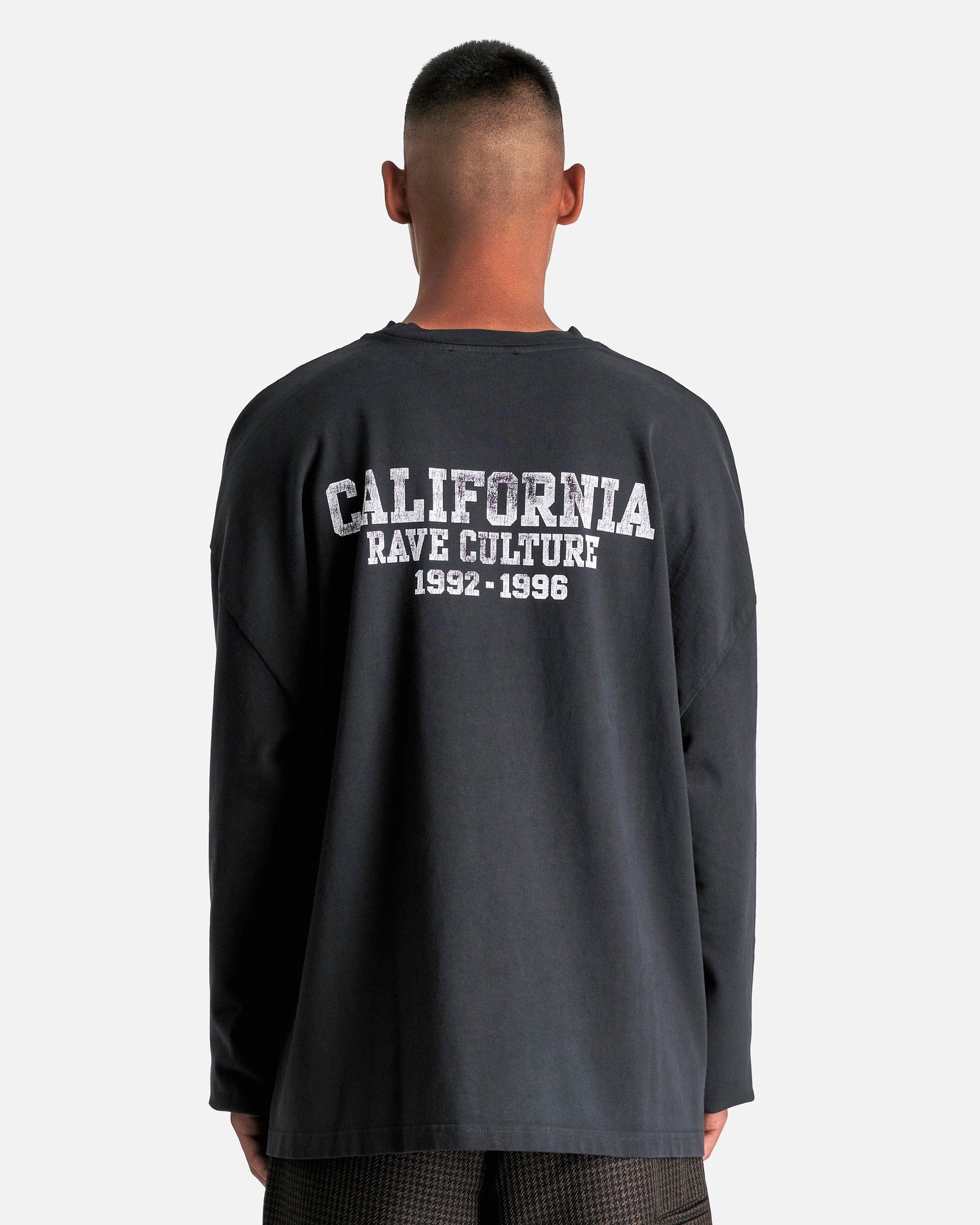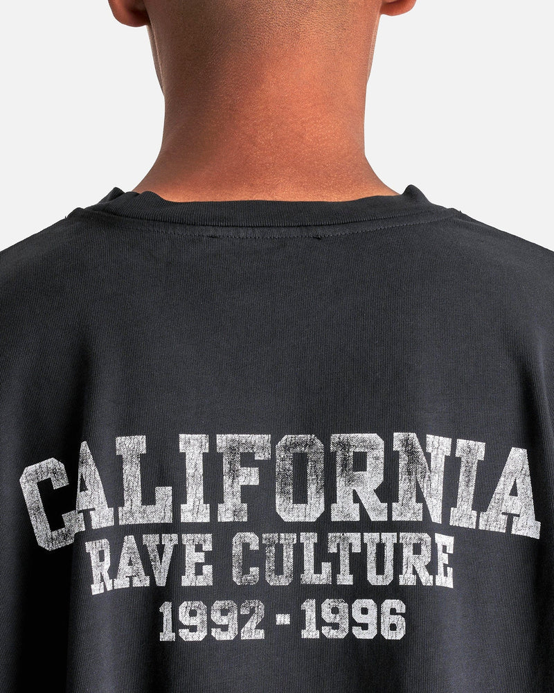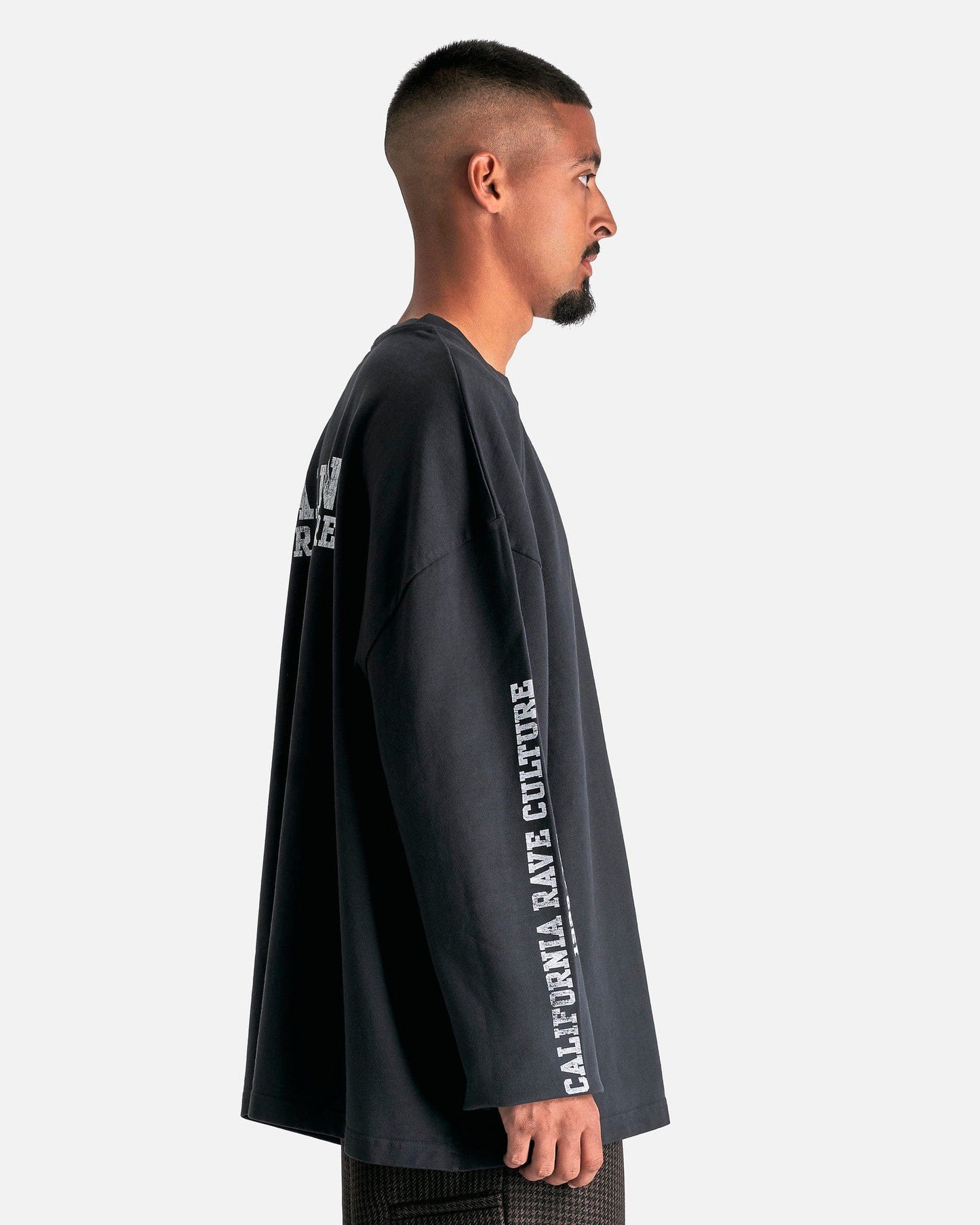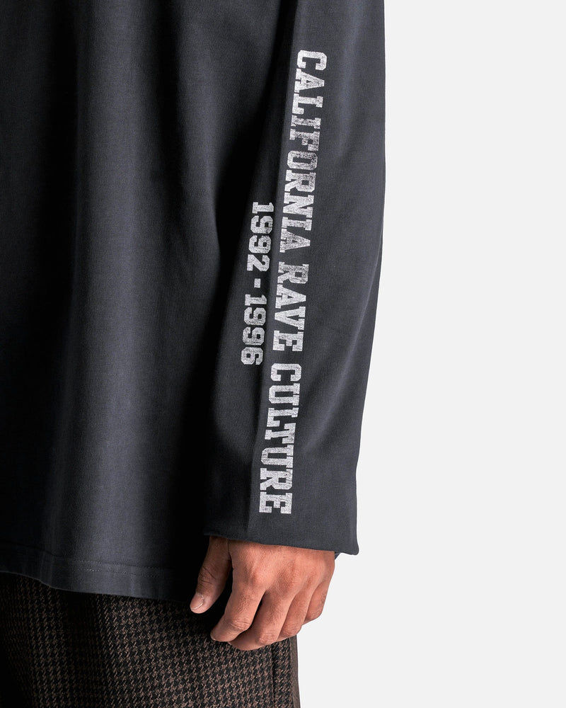Willy Chavarria 'CA Rave Culture' Long Sleeve Buffalo T-Shirt in Black. This long sleeve shirt features a ribbed crewneck, faded printed text on the sleeves and body, dropped shoulder seams and a straight hem.