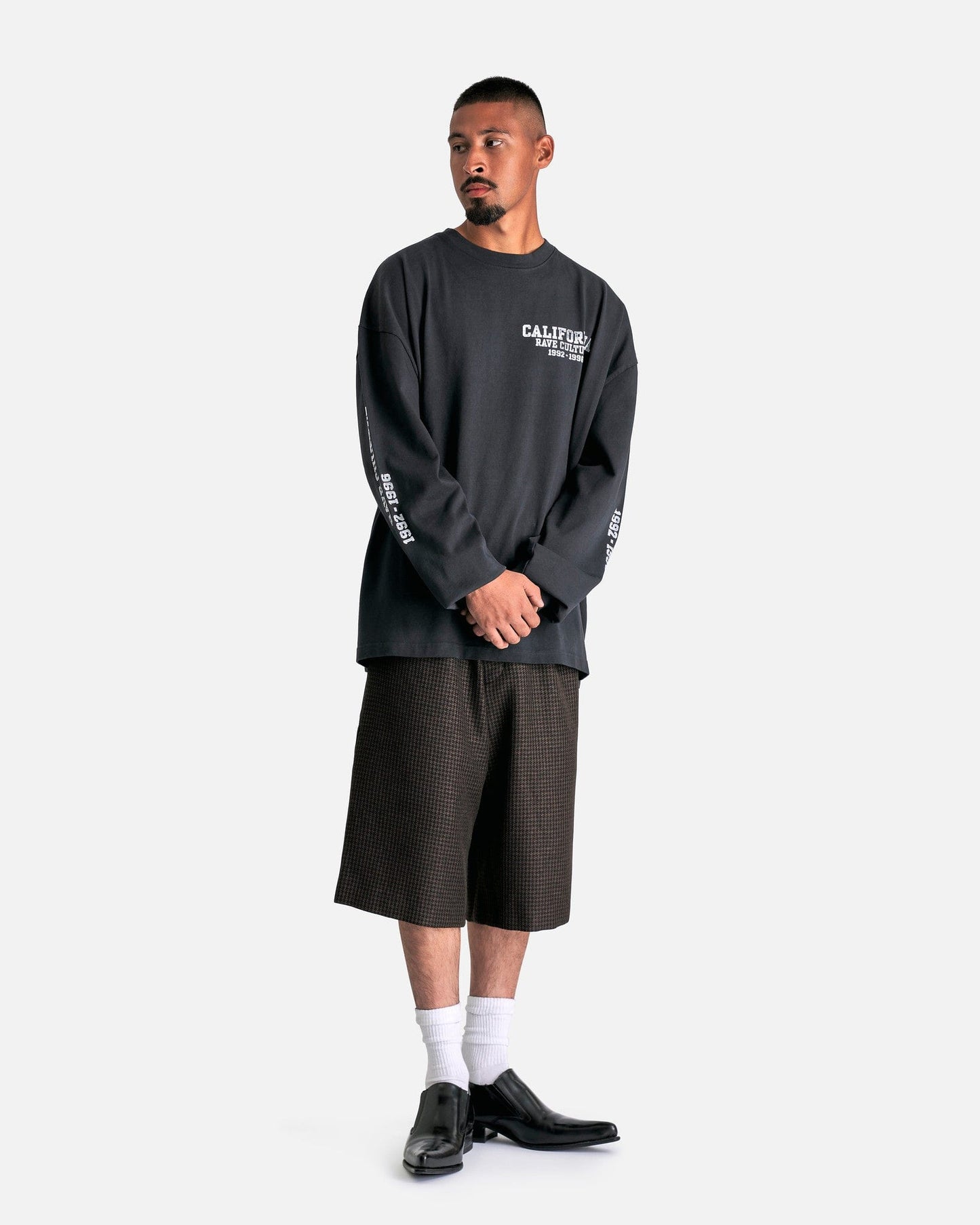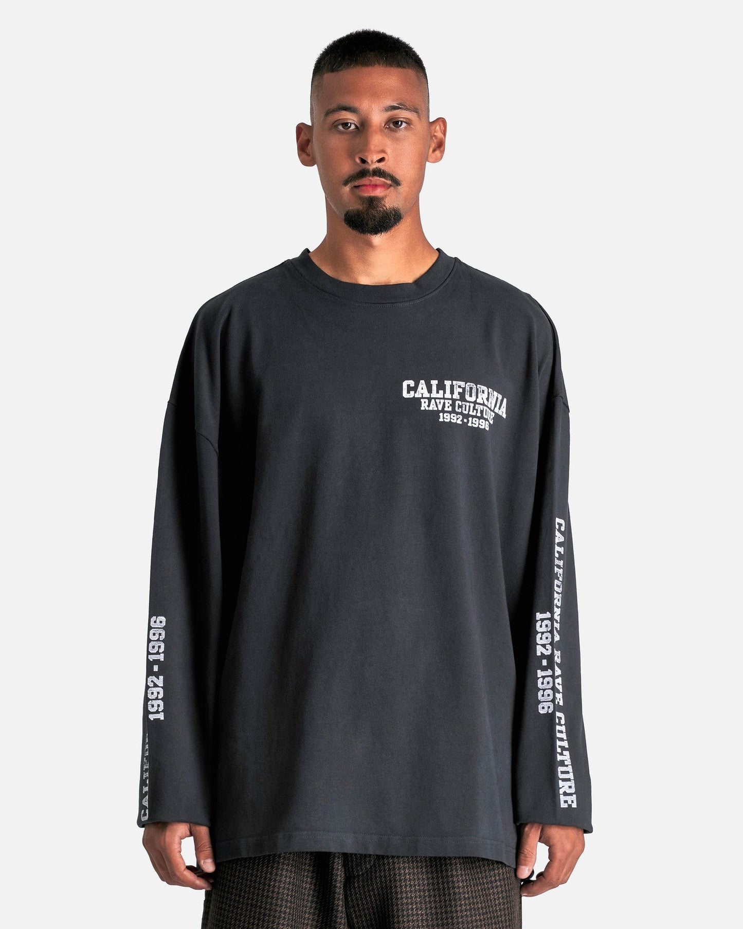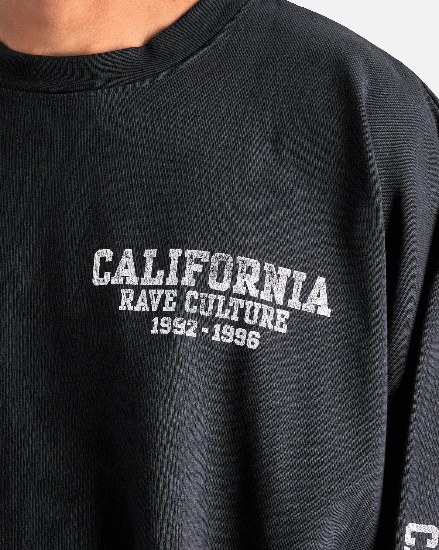 Willy Chavarria 'CA Rave Culture' Long Sleeve Buffalo T-Shirt in Black. This long sleeve shirt features a ribbed crewneck, faded printed text on the sleeves and body, dropped shoulder seams and a straight hem.