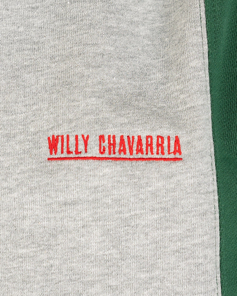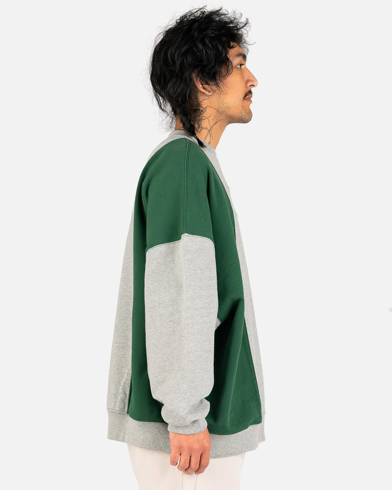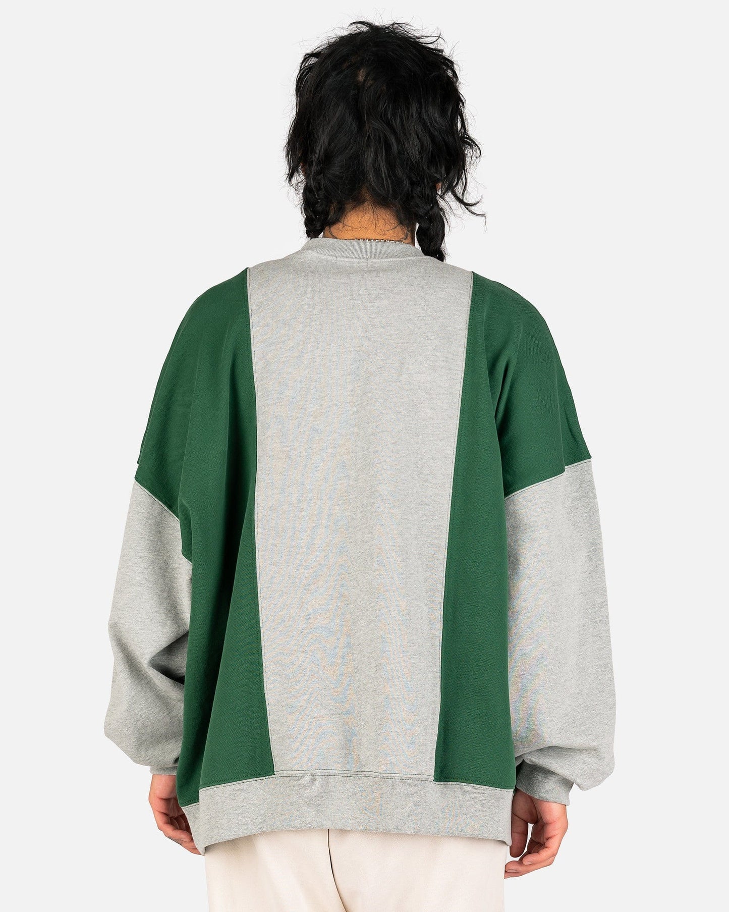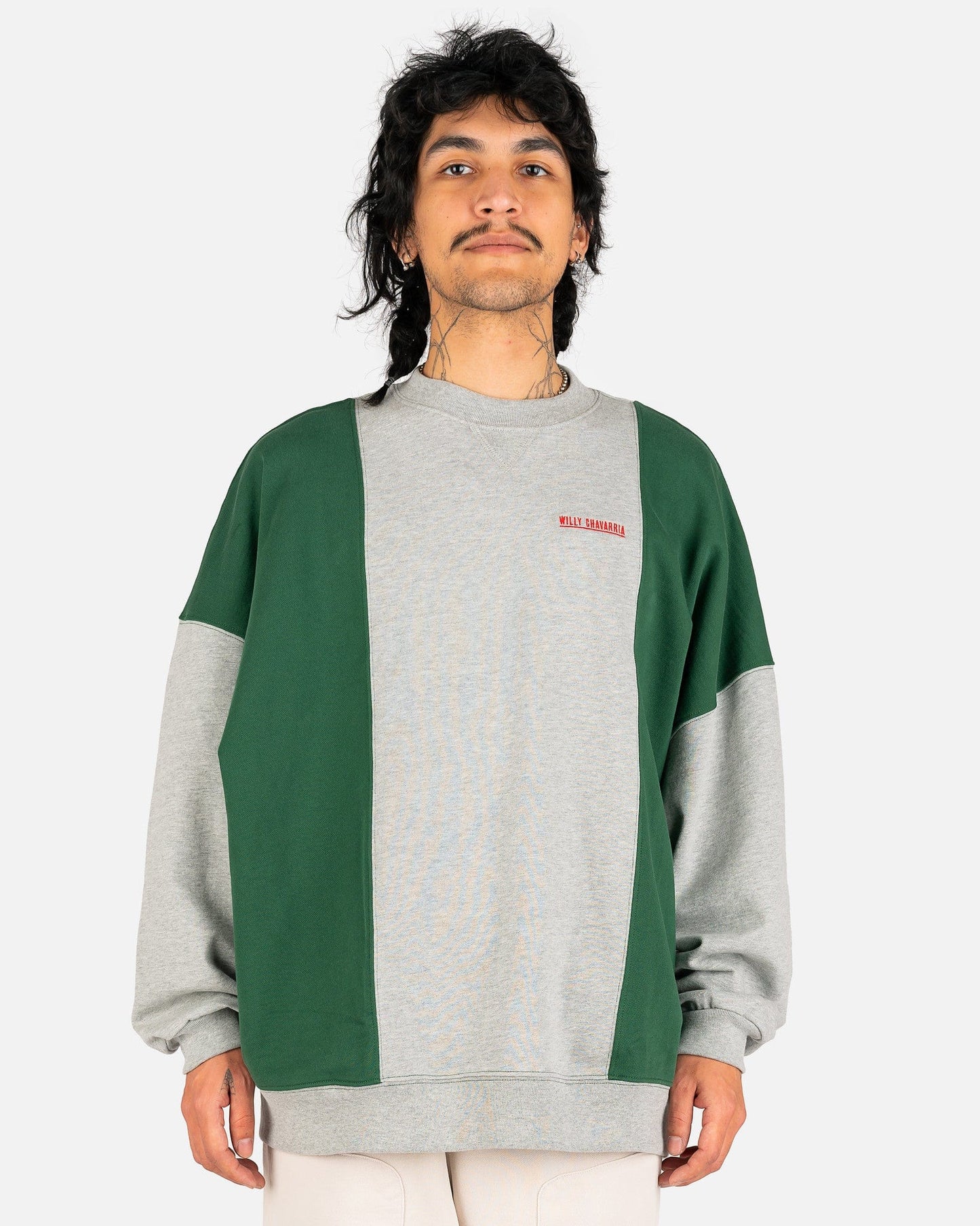 WILLY CHAVARRIA men's colorblock sweatshirt in gray and green. This long sleeved, drop shoulder sweatshirt features a crew neckline and color blocking in green on the front and back. It has ribbed cuffs, a ribbed hem and ribbed neckline. There is a red embroidered logo at the front left chest.