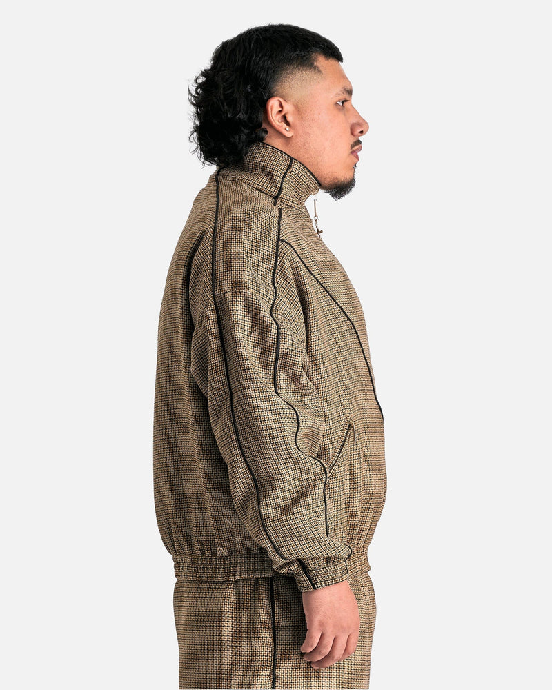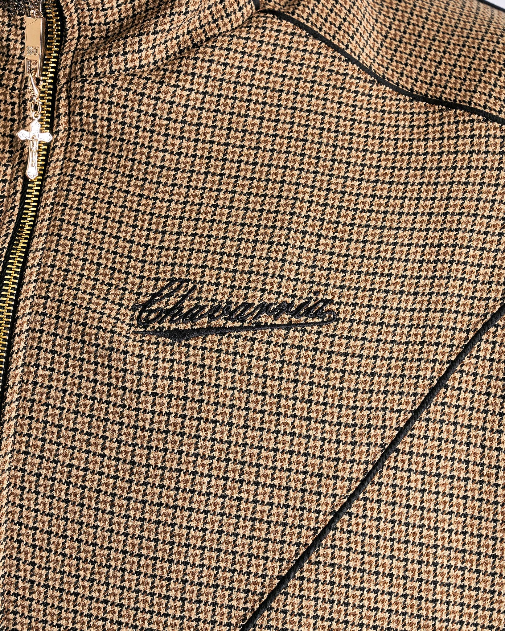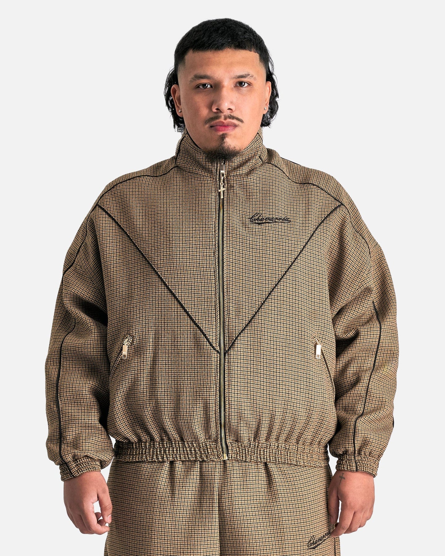 Willy Chavarria Ruff Rider Track Jacket in Gold. This gold patterned track jacket features a stand collar, front zip closure with crucifix detail, "script" lettering on the front left chest, side zip pockets and elasticated cuffs and hem.